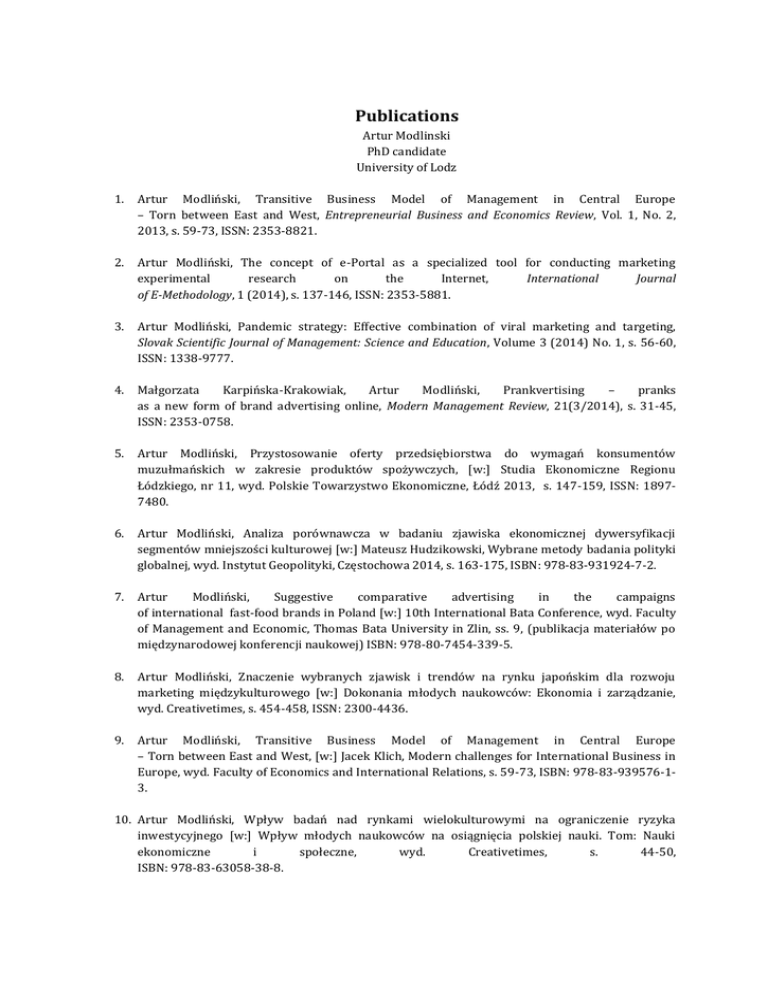 Publications Artur Modlinski PhD candidate University of Lodz 1. Artur Modliński, Transitive Business Model of Management in Central Europe – Torn between East and West, Entrepreneurial Business and Economics Review, Vol. 1, No. 2, 2013, s. 59-73, ISSN: 2353-8821. 2. Artur Modliński, The concept of e-Portal as a specialized tool for conducting marketing experimental research on the Internet, International Journal of E-Methodology, 1 (2014), s. 137-146, ISSN: 2353-5881. 3. Artur Modliński, Pandemic strategy: Effective combination of viral marketing and targeting, Slovak Scientific Journal of Management: Science and Education, Volume 3 (2014) No. 1, s. 56-60, ISSN: 1338-9777. 4. Małgorzata Karpińska-Krakowiak, Artur Modliński, Prankvertising – pranks as a new form of brand advertising online, Modern Management Review, 21(3/2014), s. 31-45, ISSN: 2353-0758. 5. Artur Modliński, Przystosowanie oferty przedsiębiorstwa do wymagań konsumentów muzułmańskich w zakresie produktów spożywczych, [w:] Studia Ekonomiczne Regionu Łódzkiego, nr 11, wyd. Polskie Towarzystwo Ekonomiczne, Łódź 2013, s. 147-159, ISSN: 18977480. 6. Artur Modliński, Analiza porównawcza w badaniu zjawiska ekonomicznej dywersyfikacji segmentów mniejszości kulturowej [w:] Mateusz Hudzikowski, Wybrane metody badania polityki globalnej, wyd. Instytut Geopolityki, Częstochowa 2014, s. 163-175, ISBN: 978-83-931924-7-2. 7. Artur Modliński, Suggestive comparative advertising in the campaigns of international fast-food brands in Poland [w:] 10th International Bata Conference, wyd. Faculty of Management and Economic, Thomas Bata University in Zlin, ss. 9, (publikacja materiałów po międzynarodowej konferencji naukowej) ISBN: 978-80-7454-339-5. 8. Artur Modliński, Znaczenie wybranych zjawisk i trendów na rynku japońskim dla rozwoju marketing międzykulturowego [w:] Dokonania młodych naukowców: Ekonomia i zarządzanie, wyd. Creativetimes, s. 454-458, ISSN: 2300-4436. 9. Artur Modliński, Transitive Business Model of Management in Central Europe – Torn between East and West, [w:] Jacek Klich, Modern challenges for International Business in Europe, wyd. Faculty of Economics and International Relations, s. 59-73, ISBN: 978-83-939576-13. 10. Artur Modliński, Wpływ badań nad rynkami wielokulturowymi na ograniczenie ryzyka inwestycyjnego [w:] Wpływ młodych naukowców na osiągnięcia polskiej nauki. Tom: Nauki ekonomiczne i społeczne, wyd. Creativetimes, s. 44-50, ISBN: 978-83-63058-38-8. 11. Artur Modliński, Rola szkoły klasycznej w zarządzaniu zasobami ludzkimi w perspektywie globalnej, [w:] red. Konrad Banań, Vade Nobiscum Tom XIII, wyd. Piktor, Łódź 2014, s. 331-341, ISBN: 978-83-63-199-36-5. 12. Artur Modliński, Funkcjonowanie branży odzieżowej w perspektywie promocji miast [w:] red. Tomasz Domański, Budowanie przewagi konkurencyjnej miast. Wyzwania przyszłości, Wydawnictwo Uniwersytetu Łódziego, Łódź 2014, s. 95-111, ISBN: 978-83-7969-148-7.
