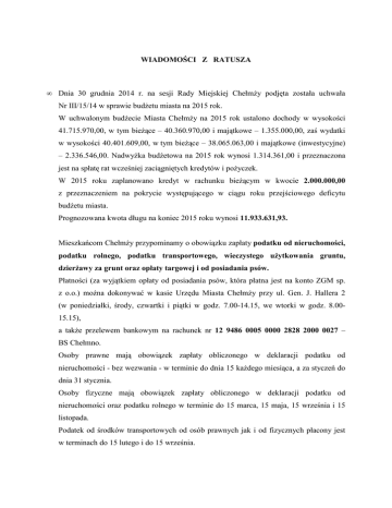 WIADOMOŚCI Z RATUSZA • Dnia 30 grudnia 2014 r. na sesji Rady Miejskiej ChełmŜy podjęta została uchwała Nr III/15/14 w sprawie budŜetu miasta na 2015 rok. W uchwalonym budŜecie Miasta ChełmŜy na 2015 rok ustalono dochody w wysokości 41.715.970,00, w tym bieŜące – 40.360.970,00 i majątkowe – 1.355.000,00, zaś wydatki w wysokości 40.401.609,00, w tym bieŜące – 38.065.063,00 i majątkowe (inwestycyjne) – 2.336.546,00. NadwyŜka budŜetowa na 2015 rok wynosi 1.314.361,00 i przeznaczona jest na spłatę rat wcześniej zaciągniętych kredytów i poŜyczek. W 2015 roku zaplanowano kredyt w rachunku bieŜącym w kwocie 2.000.000,00 z przeznaczeniem na pokrycie występującego w ciągu roku przejściowego deficytu budŜetu miasta. Prognozowana kwota długu na koniec 2015 roku wynosi 11.933.631,93. Mieszkańcom ChełmŜy przypominamy o obowiązku zapłaty podatku od nieruchomości, podatku rolnego, podatku transportowego, wieczystego uŜytkowania gruntu, dzierŜawy za grunt oraz opłaty targowej i od posiadania psów. Płatności (za wyjątkiem opłaty od posiadania psów, która płatna jest na konto ZGM sp. z o.o.) moŜna dokonywać w kasie Urzędu Miasta ChełmŜy przy ul. Gen. J. Hallera 2 (w poniedziałki, środy, czwartki i piątki w godz. 7.00-14.15, we wtorki w godz. 8.0015.15), a takŜe przelewem bankowym na rachunek nr 12 9486 0005 0000 2828 2000 0027 – BS Chełmno. Osoby prawne mają obowiązek zapłaty obliczonego w deklaracji podatku od nieruchomości - bez wezwania - w terminie do dnia 15 kaŜdego miesiąca, a za styczeń do dnia 31 stycznia. Osoby fizyczne mają obowiązek zapłaty obliczonego w deklaracji podatku od nieruchomości oraz podatku rolnego w terminie do 15 marca, 15 maja, 15 września i 15 listopada. Podatek od środków transportowych od osób prawnych jak i od fizycznych płacony jest w terminach do 15 lutego i do 15 września. Termin opłaty za wieczyste uŜytkowanie gruntu kończy się z dniem 31 marca bieŜącego roku. Podatek za dzierŜawę gruntu płacony jest kwartalnie w terminach do 10 kwietnia, 10 lipca, 10 października i 10 grudnia br. Opłata od posiadania psa płatna jest bez wezwania i termin upływa 31 maja br., względnie w ciągu 14 dni od wejścia w posiadanie psa. Dla posiadaczy psów, którzy: 1) uiszczą opłatę do końca I kwartału danego roku kalendarzowego ustala się stawkę roczną opłaty od posiadania psa w wysokości 34,00 zł za kaŜdego psa; 2) nabędą psa ze schroniska dla zwierząt ustala się roczną stawkę opłaty od posiadania psa w wysokości 22,00 zł za kaŜdego psa. Obowiązek podatkowy z tytułu opłaty targowej powstaje z chwilą przystąpienia do wykonywania sprzedaŜy, a przynajmniej z wyjściem z ofertą sprzedaŜy, polegającą na wystawieniu towaru z oznaczeniem jego ceny. • Opieka weterynaryjna Kontynuując strategię przyjętą w Programie opieki nad zwierzętami bezdomnymi oraz zapobiegania bezdomności zwierząt na terenie gminy miasta ChełmŜy w 2014 r., równieŜ w roku 2015 samorząd miasta zobowiązał się do podejmowania działań w zakresie opieki nad zwierzętami bezdomnymi, w tym odławiania bezdomnych zwierząt, opieki nad kotami dziko Ŝyjącymi wraz z ich dokarmianiem oraz edukacji i propagowania humanitarnego traktowania zwierząt. Usługę całodobowej opieki weterynaryjnej nad zwierzętami rannymi w przypadku zdarzeń drogowych z ich udziałem oraz odebranych w wyniku działań uprawnionych słuŜb i instytucji, a wynikających z egzekwowania zapisów ustawy z dnia 21 sierpnia 1997 r. o ochronie zwierząt (Dz. U. z 2013 r. poz. 856), powierzono w drodze udzielenia zamówienia publicznego ChełmŜyńskiemu Centrum Zdrowia Zwierząt Mańkowscy, Kopacz s. c. z siedzibą w ChełmŜy. Wszelkie przypadki dotyczące błąkających się bezpańskich zwierząt, wypadków drogowych z udziałem bezpańskich lub dzikich zwierząt moŜna zgłaszać na numer alarmowy 112 lub bezpośrednio do StraŜy Miejskiej pod numerem telefonu 56 675 22 05 lub 606 730 365. Bezdomne zwierzęta z terenu miasta ChełmŜy umieszczane będą w Schronisku dla Bezdomnych Zwierząt w Toruniu. • Przycinanie drzew W ramach działań związanych z utrzymaniem i pielęgnacją zieleni miejskiej ruszyły prace związane z przycięciem blisko 150 drzew rosnących na obszarze ChełmŜy. Realizacja zadania wykonana zostanie w ramach obowiązującej umowy na utrzymanie i konserwację terenów zieleni miejskiej przez Przedsiębiorstwo Handlowo-Usługowe „ALDOM” s. c. z siedzibą w Toruniu. Celem zimowego przycinania drzew jest usunięcie chorych, uschniętych i połamanych gałęzi, a w niektórych przypadkach zachowania formowalnego kształtu korony. PoniewaŜ część drzew zlokalizowanych jest w obrębie pasa drogowego ulic, prowadzone zabiegi podyktowane są równieŜ względami bezpieczeństwa w ruchu drogowym. Prace prowadzone będą m.in. w obrębie ulic Kościuszki, Polnej, Sikorskiego, Hallera i Dworcowej. • Stowarzyszenie Lokalna Grupa Działania Ziemia Gotyku W związku z zatwierdzeniem przez Komisję Europejską wszystkich programów operacyjnych umoŜliwiających realizację polityki spójności w nadchodzącym okresie programowania na lata 2014-2020, trwają intensywne przygotowania do absorpcji nowej puli środków z funduszy Unii Europejskiej. Nowa perspektywa finansowa polityki spójności na lata 2014-2020 przewiduje wzmocnienie zintegrowanego podejścia terytorialnego na rzecz zrównowaŜonego rozwoju ośrodków miejskich wraz z ich obszarami funkcjonalnymi. Terytorialny wymiar polityki spójności przewiduje równieŜ wsparcie obszarów wiejskich oraz mniejszych miast za pomocą instrumentu Rozwoju Lokalnego Kierowanego przez Społeczność (RLKS) opartego na doświadczeniach podejścia LEADER wdraŜanego w ramach Programu Rozwoju Obszarów Wiejskich na lata 2007-2013. W mijającej perspektywie LEADER realizowany był wyłącznie na obszarach wiejskich, które w myśl przyjętej defini