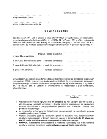 Świecie, dnia . . . . . . . . . . . . . . ........................... ... Imię i nazwisko, firma ........................... ... adres posiadacza zezwolenia OŚWIADCZENIE Zgodnie z art.111 ust.4 ustawy z dnia 26.10.1982r. o wychowaniu w trzeźwości i przeciwdziałaniu alkoholizmowi (Dz. U. z 2002r. Nr 147 poz.1231 z późn. zmianami), świadom odpowiedzialności karnej za składanie fałszywych zeznań (art.233 k.k.) oświadczam, że wartość sprzedaży napojów alkoholowych w punkcie sprzedaży w . .. ................................................................. (nazwa i adres placówki) w roku 20…. wyniosła: 1. do 4,5% alkoholu oraz piwo - wartość sprzedaży .................. . 2. pow.4,5% do 18% alkoholu - wartość sprzedaży ................... - wartość sprzedaży ................... 3. pow. 18% alkoholu Oświadczam, że jestem świadomy odpowiedzialności karnej za składanie fałszywych zeznań (art. 233kk) oraz przyjmuję do wiadomości fakt, że przedstawienie fałszywych danych wywołuje cofnięcie zezwolenia na sprzedaż napojów alkoholowych zgodnie z art. 18 ust.10 pkt. 5 ustawy o wychowaniu w trzeźwości i przeciwdziałaniu alkoholizmowi. .......................... (podpis) Oświadczenie winno wpłynąć do 31 stycznia za rok ubiegły. Zgodnie z art. 2 pkt. 8 ustawy „wartość sprzedaży – kwota należna sprzedawcy za sprzedane napoje alkoholowe z uwzględnieniem podatku od towarów i usług oraz podatku akcyzowego” w przypadku wykonywania działalności gospodarczej na podstawie umowy spółki – podpisy wspólników Opłata uiszczana jest na rachunek gminy w każdym roku kalendarzowym objętym zezwoleniem w trzech równych ratach w terminach do 31 stycznia, do 31 maja, do 30 września danego roku kalendarzowego UWAGA: niezłożenie oświadczenia o wartości sprzedaży lub niedokonanie opłaty w terminie powoduje automatyczne wygaśnięcie zezwolenia.