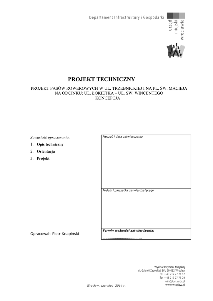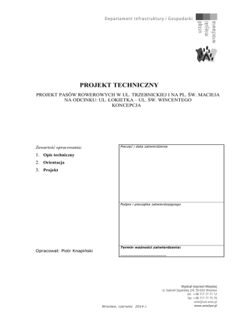 PROJEKT TECHNICZNY PROJEKT PASÓW ROWEROWYCH W UL. TRZEBNICKIEJ I NA PL. ŚW. MACIEJA NA ODCINKU: UL. ŁOKIETKA – UL. ŚW. WINCENTEGO KONCEPCJA Zawartość opracowania: Pieczęć i data zatwierdzenia 1. Opis techniczny 2. Orientacja 3. Projekt Podpis i pieczątka zatwierdzającego Termin ważności zatwierdzenia: Opracował: Piotr Knapiński ...................................... Wrocław, czerwiec 2014 r. 1. OPIS TECHNICZNY I. Podstawa opracowania 1. Wizja w terenie, 2. Prawo o ruchu drogowym, 3. Standardy Projektowe i Wykonawcze dla Systemu Tras Rowerowych Miasta Wrocław, 4. Rozporządzenie w sprawie znaków i sygnałów drogowych, 5. Szczegółowe warunki techniczne dla znaków i sygnałów drogowych oraz urządzeń bezpieczeństwa ruchu drogowego i warunki ich umieszczania na drogach. II. Cel opracowania Zakres opracowania obejmuje zmianę organizacji ruchu w ciągu ul. Trzebnickiej oraz na pl. św. Macieja od skrzyżowania z ul. Łokietka do skrzyżowania z ul. św. Wincentego oraz w rejonie pl. Powstańców Wielkopolskich. Celem opracowania jest skomunikowanie rowerem północnych części miasta: Różanki, Karłowic z centrum. III. Rozwiązania projektowe Organizacja ruchu Na ul. Trzebnickiej oraz na pl. św. Macieja od skrzyżowania z ul. Łokietka do skrzyżowania z ul. św. Wincentego zaprojektowano pasy rowerowe o szerokości 2.0m (1.5m i 1.8m w rejonie skrzyżowania z ul. Probusa) po obu stronach jezdni. W celu osiągnięcia trwałości oznakowania poziomego trasę rowerową zaprojektowano na nowej nawierzchni bitumicznej wykonanej w miejsce kostki kamiennej. Na skrzyżowaniu z ul. św. Wincentego zaprojektowano śluzy rowerowe oraz wydzielenie torowiska w kierunku północnym. W zachodniej stronie pl. Powstańców Wielkopolskich zaprojektowano przedłużenie oraz korektę istniejącej trasy rowerowej wraz z montażem sygnalizatora. Opracowanie zawiera także wykonanie trzech przejść dla pieszych przez ul. Trzebnicką, w tym jednego wraz z wykonaniem sygnalizacji świetlnej. Projekt drogowy Na pl. Powstańców Wielkopolskich zaprojektowano dwukierunkową drogę rowerową łączącą istniejącą trasę rowerową z ul. Chrobrego oraz jednokierunkową drogę rowerową w ciągu ul. Trzebnickiej po wschodniej stronie placu. Nawierzchnię drogi rowerowej zaprojektowano w technologii bitumicznej. W projekcie należy przewidzieć przesunięcie elementów infrastruktury technicznej. Przy ul. Trzebnickiej 19 zaprojektowano przełożenie nawierzchni jezdni pomiędzy projektowanymi pasami rowerowymi na obszarze zaznaczonym na rysunku. Spękaną kostkę kamienną należy zastąpić materiałem pozyskanym z rozebranej nawierzchni pod pasami rowerowymi. Na odcinku od skrzyżowania z ul. Pobożnego do początku istniejącej nawierzchni bitumicznej w rejonie skrzyżowania z ul. św. Wincentego zaprojektowano rozbiórkę istniejącej nawierzchni na szerokości 2,1m (w obu kierunkach), wykonanie nowych warstw konstrukcyjnych oraz wyznaczenie pasów rowerowych na nowej nawierzchni bitumicznej. Wrocław, kwiecień 2014 r. 2 Projektowana nawierzchnia bitumiczna pasów rowerowych powinna być wykonana w tym samym poziomie co pozostała część jezdni z kostki kamiennej. Układ warstw dla pasów rowerowych: - Rozbiórka kostki kamiennej i wywóz na magazyn ZDiUM, - Rozbiórka łat bitumicznych z wywozem na wysypisko i utylizacją, - Wykop mechaniczny lub ręczny wraz z wywozem na wysypisko i utylizacją, - Profilacja dna wykopu, - Wykonanie warstw stabilizacji C-P 1,5-2,5Mpa o grubości 15cm, - Wykonanie warstwy kruszywa 0/63 o grubości 15cm, - Wykonanie warstwy wiążącej AC 16 W o grubości 6cm wraz ze skropieniem, - Wykonanie warstwy ścieralnej AC 5 S o grubości 4cm wraz ze skropieniem. Masę bitumiczną należy układać przy pomocy rozściełacza automatycznego. Od skrzyżowania ul. Trzebnickiej z ul. Pobożnego do miejsca gdzie zaczyna się nawierzchnia bitumiczna przy pl. św. Macieja 1a zaprojektowano przebudowę ul. Trzebnickiej na całej szerokości. Parametry projektowanego oznakowania Wymagania dla znaków pionowych: - lico znaku – folia odblaskowa II typu, - tarcza znaku profilowana z blachy stalowej ocynkowanej o grubości 1,5-2mm, - zamocowanie – uniwersalny uchwyt o profilu ceowym lub płaskownik przytwierdzony do tarczy znaku, obejmy z możliwością regulacji w zależności od rodzaju i średnicy podpory (słupka), - słupek prosty – rura stalowa ocynkowana Ø60-70mm (u dołu z przyspawanymi tzw. „wąsami kotwiącymi”, u góry zaślepiony lub z przyspawanym u dołu tzw. „kołnierzem” umożliwiającym przykręcenie do podłoża), - słupek profilowany z wysięgnikiem – ocynkowany Ø60-70mm u dołu z przyspawanymi tzw. „wąsami kotwiącymi”, u góry zaślepiony, Wymagania dla znaków poziomych: - oznakowanie grubowarstwowe w technologii chemoutwardzalnej, - wysoka odporność na ścieranie i zabrudzenia, - szorstkość powinna być możliwie zbliżona do szorstkości nawierzchni, - wysoka trwałość oraz wysoki współczynnik odblaskowości umożliwiające zachowanie co najmniej minimalnych parametrów odblaskowości przez cały okres użytkowania, - zapewnienie dobrej widoczności o każdej porze, - stosowanie wyłącznie materiałów posiadających atesty Uwagi: - - oznakowanie należy wykonać zgodnie z niniejszym projektem, sposób wykonania znaków, wymiary, kolorystyka oraz rozmieszczenie w terenie powinny być zgodne z przepisami, oznakowanie poziome na nawierzchni bitumicznej wykonać jako grubowarstwowe chemoutwardzalne, na nawierzchni z kostki kamiennej jako cienkowarstwowe, usunięcie istniejącego oznakowania poziomego należy wykonać przy pomocy mało inwazyjnej metody wykorzystującej wysokie ciśnienie wody – około 2500bar Wrocław, kwiecień 2014 r. 3 2. ORIENTACJA Opracowywany obszar Wrocław, kwiecień 2014 r. 4
