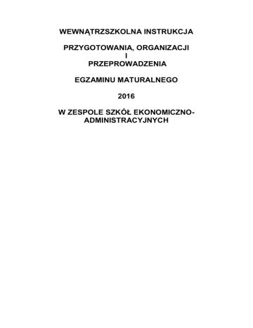 WEWNĄTRZSZKOLNA INSTRUKCJA PRZYGOTOWANIA, ORGANIZACJI I PRZEPROWADZENIA EGZAMINU MATURALNEGO 2016 W ZESPOLE SZKÓŁ EKONOMICZNOADMINISTRACYJNYCH I. WSTĘP 1) Wewnątrzszkolna Instrukcja Przygotowania, Organizacji i Przeprowadzenia Egzaminu Maturalnego w Zespole Szkół Ekonomiczno-Administracyjnych została opracowana na podstawie: - Rozporządzenia MEN z dnia 25.06.2015r.w sprawie szczegółowych warunków i sposobu przeprowadzania sprawdzianu, egzaminu gimnazjalnego i egzaminu maturalnego ( Dz.U z 2015r. poz.959) - Informacji „O sposobie organizacji i przeprowadzania egzaminu maturalnego w „nowej” formule obowiązująca w roku szkolnym 2015/2016 2) Spis treści:: II. Postępowanie z niejawnymi materiałami egzaminacyjnymi III. Zasady obiegu informacji IV. Przygotowanie i organizacja egzaminu w części ustnej V. Przygotowanie i organizacja egzaminu w części pisemnej VI. Informowanie o wynikach VII. Procedury awaryjne II. Postępowanie z niejawnymi materiałami egzaminacyjnymi 1. Niejawnymi materiałami egzaminacyjnymi są przesyłki zawierające pakiety z arkuszami egzaminacyjnymi i innymi materiałami egzaminacyjnymi do części pisemnej i ustnej egzaminu maturalnego. Także bibliografie i ramowe plany prezentacji do części ustnej egzaminu z języka polskiego - dotyczy uczniów zdających maturę w starej formule lub poprawiających wyniki matur. 2. Przewodniczący SZE szkoli i przygotowuje do przeprowadzenia egzaminu nauczycieli swojej szkoły, w tym nauczycieli oddelegowanych do innych szkół (szkoleniowa rada pedagogiczna). Zakres szkolenia obejmuje organizację i przebieg egzaminu maturalnego, zapoznanie z wewnątrzszkolną instrukcją maturalną, postępowanie z niejawnymi materiałami egzaminacyjnymi. 3. Przewodniczący SZE odbiera od członków SZE i innych osób biorących udział w egzaminie maturalnym pisemne oświadczenia o przestrzeganiu ustaleń w sprawie zabezpieczenia materiałów egzaminacyjnych przed nieuprawnionym ujawnieniem. 4. Wykazy bibliografii i ramowe plany prezentacji na ustny egzamin z języka polskiego są udostępniane członkom właściwych PZE. określony w punkcie III.8 ( dot. absolwentów, którzy ukończyli Technikum w latach 2005-2015). Zestawy zadań i kryteria oceniania na część ustną egzaminu z języka obcego nowożytnego są udostępniane członkom właściwych PZE w sposób określony w punkcie III.1.1 5. Przewodniczący ZE lub osoba przez niego upoważniona odbiera i wspólnie z wyznaczonym przez przewodniczącego członkiem ZE sprawdza nienaruszenie przesyłek zawierających pakiety z materiałami egzaminacyjnymi. Niejawne materiały egzaminacyjne przechowywane są do dnia przeprowadzenia odpowiedniej części egzaminu w sejfie szkolnym. 6. Klucze do sejfu, w którym przechowywane są niejawne materiały egzaminacyjne, posiada w okresie ich przechowywania, z zastrzeżeniem pkt. I.16, tylko przewodniczący ZE. 7. Przewodniczący ZE sprawdza w każdym dniu egzaminu, przed jego rozpoczęciem, czy pakiety zawierające arkusze i materiały egzaminacyjne są nienaruszone, a w przypadku ich naruszenia niezwłocznie zawiadamia dyrektora OKE. 8. W dniu egzaminu przewodniczący PZE lub ZN (ten w obecności przedstawiciela zdających z danej sali) odbiera od przewodniczącego ZE pakiet materiałów egzaminacyjnych i niezwłocznie przenosi go do sali egzaminacyjnej 9. Do czasu rozdania arkuszy wszystkim zdającym nikt nie może mieć wglądu do ich treści 10. Członkowie ZN wymieniają w razie potrzeby wadliwe arkusze egzaminacyjne na kompletne. Czynność ta jest protokołowana i potwierdzana podpisem przez absolwenta, któremu wymieniono arkusze egzaminacyjne 11. Po zakończeniu egzaminu wyznaczeni członkowie ZN zbierają arkusze egzaminacyjne odłożone przez zdających na brzeg stolika. Pakowanie prac odbywa się w obecności przedstawiciela zdających. 12. Przewodniczący ZN porządkuje, kompletuje, pakuje i zabezpiecza materiały egzaminacyjne, listy zdających, protokoły odbioru prac i zestawy (także nagrane płyty CD oznaczone numerem PESEL zdającego w przypadku egzaminu z informatyki) według zaleceń OKE oraz niezwłocznie dostarcza je wraz z wypełnionymi i podpisanymi protokołami z egzaminu przewodniczącemu ZE po zakończeniu każdej części egzaminu 13. Przewodniczący ZE po zakończeniu egzaminu przechowuje materiały egzaminacyjne w pomieszczeniu, gdzie podlegają nadzorowi do czasu przekazania ich kurierowi 14. Pozostała w szkole dokumentacja dotycząca przygotowania i przebiegu egzaminu zabezpieczana jest przez dyrektora szkoły przed nieuprawnionym ujawnieniem. 15. Jeżeli przewodniczący ZE, z powodu choroby lub innych ważnych przyczyn, nie może pełnić swoich obowiązków, wszystkie jego zadania przejmuje jego zastępca 16. W sytuacjach szczególnych należy postępować wg procedur zawartych w części V punkty1, 2 , 3 (Procedury Awaryjne). III. Zasady obiegu informacji 1. Uczniowie klas maturalnych i ich rodzice powinni być poinformowani o zasadach przeprowadzania egzaminu maturalnego oraz terminarzem maturzysty.- do 30 września 2. Nauczyciele przedmiotów wchodzących w zakres egzaminu maturalnego do 30 września mają obowiązek poinformować uczniów o zasadach egzaminu maturalnego z danego przedmiotu oraz standardach wymagań. 3. Informacje o strukturze, formie, zasadach organizacji i przebiegu egzaminu maturalnego oraz komunikaty dotyczące tego egzaminu przewodniczący ZE umieszcza w gablocie na korytarzu, na parterze szkoły, a także na stronie internetowej szkoły 4. Egzamin maturalny dla absolwentów z lat 2005/2006 – 2014/2015 jest przeprowadzany na podstawie standardów wymagań egzaminacyjnych obowiązujących do roku szkolnego 20014/2015. Informacje dot. „starego” egzaminu są opisane w rozdziale VI 5. Do 30 września uczeń składa w sekretariacie uczniowskim na ręce upoważnionego pracownika sekretariatu lub u zastępcy przewodniczącego Szkolnego Zespołu Egzaminacyjnego deklaracj