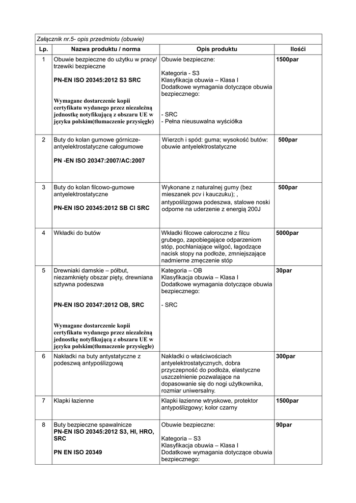 Załącznik nr.5- opis przedmiotu (obuwie) Lp. Nazwa produktu / norma Opis produktu Ilośći 1 1500par Obuwie bezpieczne do użytku w pracy/ Obuwie bezpieczne: trzewiki bezpieczne Kategoria - S3 PN-EN ISO 20345:2012 S3 SRC Klasyfikacja obuwia – Klasa I Dodatkowe wymagania dotyczące obuwia bezpiecznego: Wymagane dostarczenie kopii certyfikatu wydanego przez niezależną jednostkę notyfikującą z obszaru UE w - SRC języku polskim(tłumaczenie przysięgłe) - Pełna nieusuwalna wyściółka 2 Buty do kolan gumowe górnicze-Wi Wierzch i spód: guma; wysokość butów: antyelektrostatyczne całogumowe 37 cm; obuwie antyelektrostatyczne 500par PN -EN ISO 20347:2007/AC:2007 3 Buty do kolan filcowo-gumowe antyelektrostatyczne m • PN-EN ISO 20345:2012 SB CI SRC odp • Wykonane z naturalnej gumy (bez mieszanek pcv i kauczuku); , antypoślizgowa podeszwa, stalowe noski odporne na uderzenie z energią 200J 500par 4 Wkładki do butów Wkładki filcowe całoroczne z filcu grubego, zapobiegające odparzeniom stóp, pochłaniające wilgoć, łagodzące nacisk stopy na podłoże, zmniejszające nadmierne zmęczenie stóp 5 Drewniaki damskie – półbut, niezamknięty obszar pięty, drewniana sztywna podeszwa 30par Kategoria – OB Klasyfikacja obuwia – Klasa I Dodatkowe wymagania dotyczące obuwia bezpiecznego: PN-EN ISO 20347:2012 OB, SRC - SRC 5000par Wymagane dostarczenie kopii certyfikatu wydanego przez niezależną jednostkę notyfikującą z obszaru UE w języku polskim(tłumaczenie przysięgłe) 6 Nakładki na buty antystatyczne z podeszwą antypoślizgową Nakładki o właściwościach antyelektrostatycznych, dobra przyczepność do podłoża, elastyczne uszczelnienie pozwalające na dopasowanie się do nogi użytkownika, rozmiar uniwersalny. 300par 7 Klapki łazienne Klapki łazienne wtryskowe, protektor antypoślizgowy; kolor czarny 1500par 8 Buty bezpieczne spawalnicze PN-EN ISO 20345:2012 S3, HI, HRO, SRC Obuwie bezpieczne: 90par PN EN ISO 20349 Kategoria – S3 Klasyfikacja obuwia – Klasa I Dodatkowe wymagania dotyczące obuwia bezpiecznego: Wymagane dostarczenie kopii certyfikatu wydanego przez niezależną jednostkę notyfikującą z obszaru UE w języku polskim(tłumaczenie przysięgłe) - HI - HRO - SRC - Pełna nieusuwalna wyściółka 1.Wyroby muszą posiadać instrukcje przechowywania i konserwacji oraz instrukcję użytkowania w języku polskim. 2. Certyfikaty, atesty oraz deklaracje zgodności muszą być w języku polskim. W przypadku tłumaczenia na język polski muszą być to tłumaczenia przysięgłe. 3.Produkt musi posiadać wszytą wszywkę informacyjną z naniesioną nazwą producenta, nazwą wyrobu, rozmiarem, gatunkiem, rokiem produkcji, składem surowcowym, sposobem konserwacji oraz numerem normy wraz z piktogramem