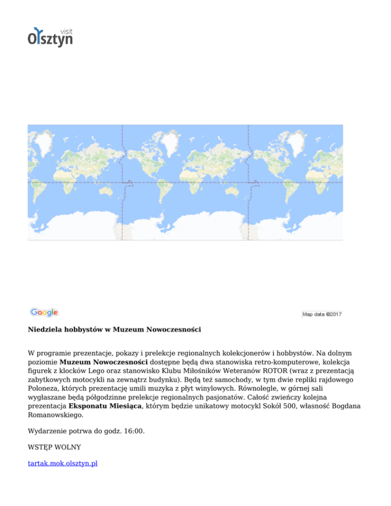 Niedziela hobbystów w Muzeum Nowoczesności W programie prezentacje, pokazy i prelekcje regionalnych kolekcjonerów i hobbystów. Na dolnym poziomie Muzeum Nowoczesności dostępne będą dwa stanowiska retro-komputerowe, kolekcja figurek z klocków Lego oraz stanowisko Klubu Miłośników Weteranów ROTOR (wraz z prezentacją zabytkowych motocykli na zewnątrz budynku). Będą też samochody, w tym dwie repliki rajdowego Poloneza, których prezentację umili muzyka z płyt winylowych. Równolegle, w górnej sali wygłaszane będą półgodzinne prelekcje regionalnych pasjonatów. Całość zwieńczy kolejna prezentacja Eksponatu Miesiąca, którym będzie unikatowy motocykl Sokół 500, własność Bogdana Romanowskiego. Wydarzenie potrwa do godz. 16:00. WSTĘP WOLNY tartak.mok.olsztyn.pl Współorganizacja: Klub Miłośników Weteranów ROTOR 1)Tartak Raphaelsohnów, (2016-09-25 12:00-2016-09-25 16:00) www.visit.olsztyn.eu