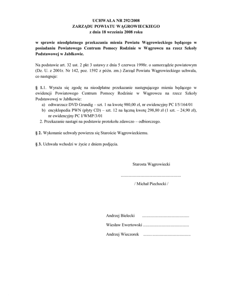 UCHWAŁA NR 292/2008 ZARZĄDU POWIATU WĄGROWIECKIEGO z dnia 18 września 2008 roku w sprawie nieodpłatnego przekazania mienia Powiatu Wągrowieckiego będącego w posiadaniu Powiatowego Centrum Pomocy Rodzinie w Wągrowcu na rzecz Szkoły Podstawowej w Jabłkowie. Na podstawie art. 32 ust. 2 pkt 3 ustawy z dnia 5 czerwca 1998r. o samorządzie powiatowym (Dz. U. z 2001r. Nr 142, poz. 1592 z późn. zm.) Zarząd Powiatu Wągrowieckiego uchwala, co następuje: § 1.1. Wyraża się zgodę na nieodpłatne przekazanie następującego mienia będącego w ewidencji Powiatowego Centrum Pomocy Rodzinie w Wągrowcu na rzecz Szkoły Podstawowej w Jabłkowie: a) odtwarzacz DVD Grundig – szt. 1 na kwotę 980,00 zł, nr ewidencyjny PC I/5/164/01 b) encyklopedia PWN (płyty CD) – szt. 12 na łączną kwotę 298,80 zł (1 szt. – 24,90 zł), nr ewidencyjny PC I/WMP/3/01 2. Przekazanie nastąpi na podstawie protokołu zdawczo – odbiorczego. § 2. Wykonanie uchwały powierza się Staroście Wągrowieckiemu. § 3. Uchwała wchodzi w życie z dniem podjęcia. Starosta Wągrowiecki ....................................................... / Michał Piechocki / Andrzej Bielecki ........................................... Wiesław Ewertowski .......................................... Andrzej Wieczorek ...........................................