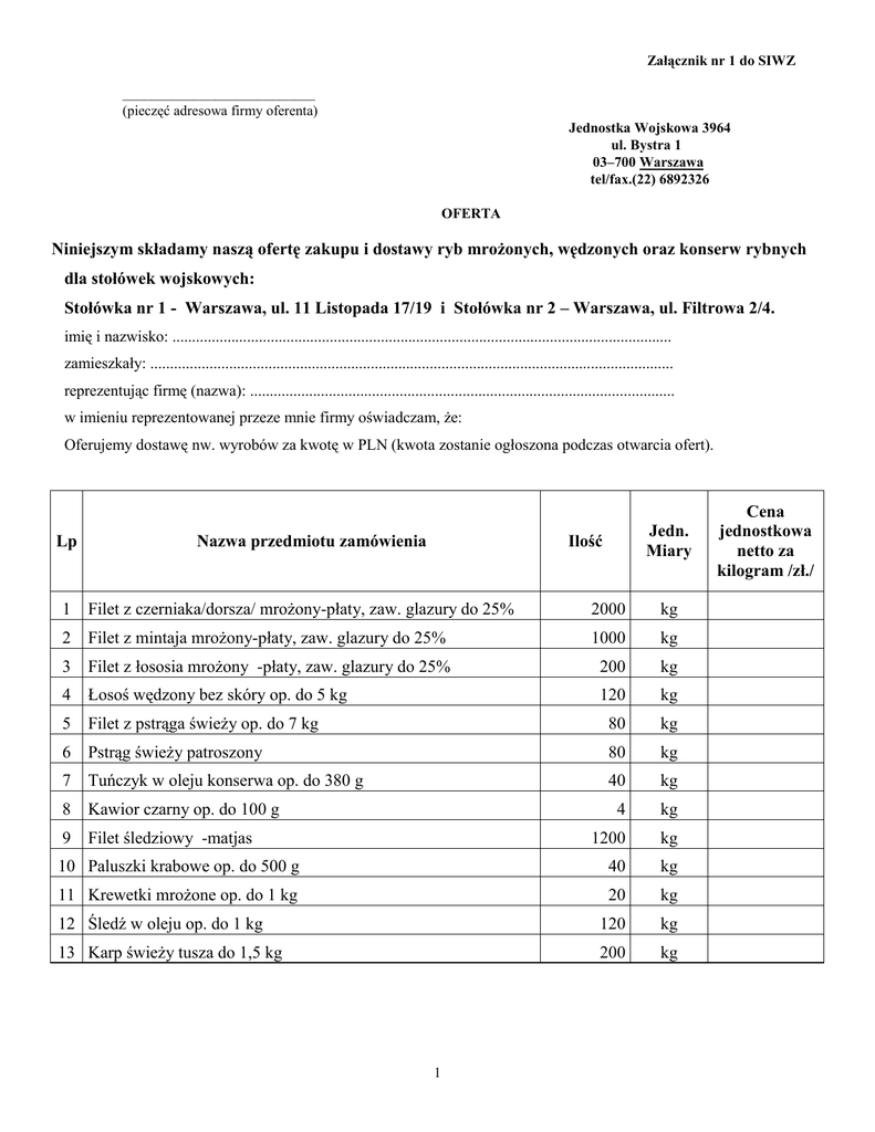 Załącznik nr 1 do SIWZ ___________________________ (pieczęć adresowa firmy oferenta) Jednostka Wojskowa 3964 ul. Bystra 1 03–700 Warszawa tel/fax.(22) 6892326 OFERTA Niniejszym składamy naszą ofertę zakupu i dostawy ryb mrożonych, wędzonych oraz konserw rybnych dla stołówek wojskowych: Stołówka nr 1 - Warszawa, ul. 11 Listopada 17/19 i Stołówka nr 2 – Warszawa, ul. Filtrowa 2/4. imię i nazwisko: ............................................................................................................................... zamieszkały: ..................................................................................................................................... reprezentując firmę (nazwa): ............................................................................................................ w imieniu reprezentowanej przeze mnie firmy oświadczam, że: Oferujemy dostawę nw. wyrobów za kwotę w PLN (kwota zostanie ogłoszona podczas otwarcia ofert). Lp Nazwa przedmiotu zamówienia Jedn. Miary Ilość 1 Filet z czerniaka/dorsza/ mrożony-płaty, zaw. glazury do 25% 2000 kg 2 Filet z mintaja mrożony-płaty, zaw. glazury do 25% 1000 kg 3 Filet z łososia mrożony -płaty, zaw. glazury do 25% 200 kg 4 Łosoś wędzony bez skóry op. do 5 kg 120 kg 5 Filet z pstrąga świeży op. do 7 kg 80 kg 6 Pstrąg świeży patroszony 80 kg 7 Tuńczyk w oleju konserwa op. do 380 g 40 kg 8 Kawior czarny op. do 100 g 4 kg 9 Filet śledziowy -matjas 1200 kg 10 Paluszki krabowe op. do 500 g 40 kg 11 Krewetki mrożone op. do 1 kg 20 kg 12 Śledź w oleju op. do 1 kg 120 kg 13 Karp świeży tusza do 1,5 kg 200 kg 1 Cena jednostkowa netto za kilogram /zł./ Wartość całości zamówienia wynosi: wartość netto (bez VAT) __ __ __ __ __ __ podatek VAT _ _ _ % cena brutto (z VAT) __ __ __ __ __ _ __ __ __ __ __ __ __ _ cena brutto (z VAT) słownie ....................................................................................................................................................................... Oświadczamy, że zapoznaliśmy się z projektem umowy /Załącznik nr 5 do SIWZ/ i nie wnosimy do niej zastrzeżeń. Zamówienie zobowiązujemy się wykonać w terminie określonym w umowie. Oświadczamy, że uważamy się za związanych niniejszą ofertą przez okres 30 dni. .......................................................... Miejscowość............................................ data:............................ 2 /podpis upoważnionego przedstawiciela/