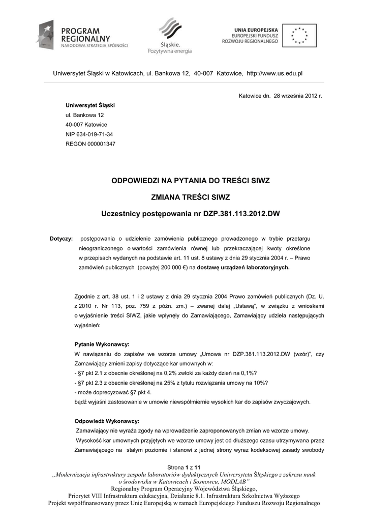 ODPOWIEDZI NA PYTANIA DO TREŚCI SIWZ ZMIANA TREŚCI