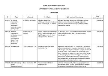 Budżet partycypacyjny Torunia 2016 LISTA PROJEKTÓW PODDANYCH POD GŁOSOWANIE CHEŁMIŃSKIE ID Tytuł Lokalizacja Krótki opis Opis na stronę internetową Koszt zaakceptowany CH0075 Wymiana nawierzchni asfaltowej, wykonanie chodnika i miejsc postojowych. ul. Żelazna w Toruniu. Wymiana nawierzchni Wymiana istniejącej nawierzchni asfaltowej na nową, asfaltowej, wykonanie chodnika i wykonanie chodnika umożliwiającego dojście do miejsc postojowych, ul. Żelazna. wieżowca, oraz wyznaczenie miejsc postojowych dla mieszkańców osiedla. 200 000,00 CH0076 Remont nawierzchni asfaltowej, wraz z miejscami postojowymi. Zjazd z Trasy Średnicowej Północnej. Ul. Wiązowa w Toruniu. Remont nawierzchni asfaltowej – Ul. Wiązowa, zjazd z Trasy Średnicowej Północnej. Remont zjazd z Trasy Średnicowej do ul. nawierzchni asfaltowej, wraz z remontem miejsc Wybickiego, remont 30 miejsc postojowych. parkingowych ul. Wiązowa. 160 000,00 CH0078 Budowa drogi. Szosa Chełmińska 75A Budowa pieszojezdni - Szosa Chełmińska 75a. Mieszkańcy Osiedla przy ul. Sz. Chełmińska 75A proszą o wykonanie pieszojezdni utwardzonej asfaltem lub kostką betonową na całej długości drogi prowadzącej do naszych lokali. Od ponad 30 lat chodzimy po niezliczonej ilości dziur i wybojów. Od tylu lat nie mamy „normalnej” drogi, po której moglibyśmy swobodnie się poruszać i nikt nie interesuje się tym tematem. Ponadto z naszej jedynej drogi prowadzącej do naszych domów pozostała skarpa. Jest to związane z trwającą budową drogi. 170 000,00 Postawienie dwóch latarni drogowych LED. Lokatorzy małego osiedla, którzy czują się zapomniani przez władze miasta Torunia, proszą w ramach budżetu partycypacyjnego o założenie 2 latarni. Jednej na CH0079 Oświetlona droga Szosa Chełmińska 75A. moim bezpieczeństwem. 11 000,00 1 podwórzu domów mieszkalnych, natomiast drugiej przy drodze lokalnej. Od ponad 30 lat nie możemy doprosić się o oświetlenie, które ma na celu zapewnienie nam bezpieczeństwa. Zamieszkujemy okolice na zadrzewionym uboczu miasta, przez co obawiamy się o bezpieczeństwo swoje i naszych dzieci. Wielokrotnie natykaliśmy się na lisy, które blisko osiedla mają swoje siedlisko. Natomiast na przydrożnej łące znajduje się lokalna pijalnia alkoholu ludzi zmierzających tam prosto z pobliskiego sklepu monopolowego. CH0080 Remont ulicy Dąbrówki. Chełmińskie Przedmieście. Kompleksowy remont ulicy (od wjazdu z ul. Legionów) wraz z budową chodników. Projekt zakłada remont ulicy Dąbrówki, która jest łącznikiem pomiędzy ulicą Legionów i Lecha. Ulica Dąbrówki ma status drogi gminnej, nieuporządkowanej. Jest drogą wąską i nieutwardzoną. W ramach projektu remontu ulicy Dąbrówki należy: wykonać dokumentację projektową, wymienić nawierzchnię jezdni, wymienić krawężniki, zaprojektować i wykonać chodniki dla pieszych, wykonać nowe oznakowanie pionowe ulicy. 215 000,00 CH0081 Rozbudowa placu zabaw i wypoczynku "Topolowy ludzik". Teren placu zabaw dla okolicznych bloków: Hurynowicz 2-20, Szosa Chełmińska 161-163, Szosa Chełmińska 155155c; dz. 54/14. Rozbudowa placu zabaw o siłownię zewnętrzną (5 urządzeń, ogrodzenie), huśtawkę „kwartet”, wbudowanie bramki w ogrodzenie, postawienie ławek i wykonanie nasadzeń, wymiana opraw oświetlenia (8 szt.). Projekt przewiduje rozbudowę placu zabaw i wypoczynku o: 1) siłownię zewnętrzną: a) wygrodzenie części terenu ogrodzeniem panelowym o wys. 1,2 m - ok. 300m2, b) montaż 5 urządzeń siłowni: jeździec, biegacz, orbitrek, twister, wioślarz; 2) huśtawkę "kwartet"; 3) wbudowanie w istniejące ogrodzenie bramki (1 komplet) zabezpieczenie przed zniszczeniem płotu przez piłkarzy; 4) urządzenie kącików seniorów i matek z wózkami: montaż 3 komplety ławek, nasadzenie 3 szt. drzew liściastych przy kącikach; 5) wymiana oświetlenia terenu placu: wymiana opraw istniejących typu parkowego na uliczne bez wymiany istniejących słupów (8 szt.) celem zwiększenia bezpieczeństwa osób oraz ochrony mienia publicznego. Plac "Topolowy ludzik" służy do zabawy i wypoczynku dzieciom, młodzieży i dorosłym mieszkańcom wszystkich bloków zlokalizowanych między ulicami: Sz. Chełmińska, Żwirki i Wigury oraz św. Józefa. 115 000,00 2 CH0083 Skwer Borowików rewitalizacja zielonych obszarów Chełmińskiego KaszubskaBorowiacka. Działki należące do gminy: 294, 303 + przyległy pas z oznaczeniem z mpzp S2-ZP1. Utworzenie skweru wypoczynkowego dla mieszkańców (równanie terenu, usunięcie śmieci i gruzu, wykonanie nasadzeń, budowa placu zabaw, postawienie ławek, posianie trawy). Na Chełmińskiej potrzeba więcej zieleni ! Projekt „Skwer Borowików” to zagospodarowanie nieużytku na potrzeby społeczności lokalnej. Potrzebujemy przestrzeni rekreacyjnej, miejsca do zabaw dla dzieci, otwartej przestrzeni do gier i spacerów. Zagospodarowanie miejskich działek przy Borowików i Kaszubskiej zgodnie z naszym projektem to podniesienie jakości i komfortu życia. To stworzenie przyjaznej przestrzeni publicznej. 140 000,00 /-/ 3