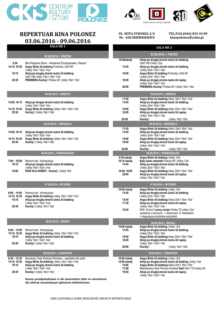 REPERTUAR KINA POLONEZ 03.06.2016 - 09.06.2016 UL. WITA STWOSZA 2/4 96 - 100 SKIERNIEWICE SALA NR 1 03.06.2016 r. PIĄTEK 9:30 14:15, 18:30 16:15 20:30 Mini Playbock Show – Akademia Przedszkolaka „Plastuś” Angry Birds 2d dubbing Finlandia, USA 99’ | bilety 18zł I 16zł I 14zł Alicja po drugiej stronie lustra 2d dubbing USA 108’| bilety 18zł I 16zł I 14zł PREMIERA Kochaj ! Polska 90’ | bilety 18zł I 16zł SALA NR 2 03.06.2016 r. PIĄTEK 10:00szkoły 13:45 16:00 18:00 20:00 04.06.2016 r. SOBOTA 12:00, 16:15 14:15, 18:30 20:30 Alicja po drugiej stronie lustra 2d dubbing | bilety 18zł I 16zł I 14zł Angry Birds 2d dubbing | bilety 18zł I 16zł I 14zł Kochaj ! | bilety 18zł I 16zł 11:45 13:45 16:00 18:00 05.06.2016 r. NIEDZIELA 14:15, 18:30 20:30 Alicja po drugiej stronie lustra 2d dubbing | bilety 18zł I 16zł I 14zł Angry Birds 2d dubbing | bilety 18zł I 16zł I 14zł Kochaj ! | bilety 18zł I 16zł 16:00 18:00 20:00 19:00 Remont sali - klimatyzacja Alicja po drugiej stronie lustra 2d dubbing | bilety 18zł I 16zł I 14zł KINO DLA KOBIET - Kochaj ! | bilety 18zł 8:30 szkoły 10:15 szkoły 13:45 16:00, 18:00 20:00 07.06.2016 r. WTOREK 6:00 – 14:00 14:15, 18:30 16:15 20:30 Remont sali - klimatyzacja Angry Birds 2d dubbing | bilety 18zł I 16zł I 14zł Alicja po drugiej stronie lustra 2d dubbing | bilety 18zł I 16zł I 14zł Kochaj ! | bilety 18zł I 16zł 20:30 Remont sali - klimatyzacja Angry Birds 2d dubbing | bilety 18zł I 16zł I 14zł Alicja po drugiej stronie lustra 2d dubbing | bilety 18zł I 16zł I 14zł Kochaj ! | bilety 18zł I 16zł 15:45 17:30 19:30 10:00 szkoły 13:45 16:00 18:00 20:00 09.06.2016 r. CZWARTEK 8:30 – 13:30 14:15, 18:30 16:15 20:30 Narodowy Teatr Edukacji Wrocław – spektakle dla szkół Angry Birds 2d dubbing | bilety 18zł I 16zł I 14zł Alicja po drugiej stronie lustra 2d dubbing | bilety 18zł I 16zł I 14zł Kochaj ! | bilety 18zł I 16zł Angry Birds 2d dubbing| bilety 18zł I 16zł I 14zł Alicja po drugiej stronie lustra 3d dubbing | bilety 20zł I 18zł I 16zł Angry Birds 3d dubbing| bilety 20zł I 18zł I 16zł Alicja po drugiej stronie lustra 2d napisy | bilety 18zł I 16zł I 14zł Kochaj ! | bilety 18zł I 16zł 06.06.2016 r. PONIEDZIAŁEK Angry Birds 3d dubbing | bilety 14zł Były sobie człowieki Francja 95’ | bilety 12zł Alicja po drugiej stronie lustra 3d dubbing | bilety 20zł I 18zł I 16zł Angry Birds 3d dubbing| bilety 20zł I 18zł I 16zł Alicja po drugiej stronie lustra 2d napisy | bilety 18zł I 16zł I 14zł 07.06.2016 r. WTOREK 10:00 szkoły 13:45 08.06.2016 r. ŚRODA 6:00 – 14:00 14:15, 18:30 16:15 Angry Birds 2d dubbing| bilety 18zł I 16zł I 14zł Alicja po drugiej stronie lustra 3d dubbing | bilety 20zł I 18zł I 16zł Angry Birds 3d dubbing| bilety 20zł I 18zł I 16zł Alicja po drugiej stronie lustra 2d napisy | bilety 18zł I 16zł I 14zł Kochaj ! | bilety 18zł I 16zł 05.06.2016 r. NIEDZIELA 11:45 13:45 06.06.2016 r. PONIEDZIAŁEK 7:00 – 16:00 16:15 Alicja po drugiej stronie lustra 2d dubbing USA 108’| bilety 12zł Alicja po drugiej stronie lustra 3d dubbing | bilety 20zł I 18zł I 16zł Angry Birds 3d dubbing Finlandia, USA 99’ | bilety 20zł I 18zł I 16zł Alicja po drugiej stronie lustra 2d napisy | bilety 18zł I 16zł I 14zł PREMIERA Kochaj ! Polska 90’ | bilety 18zł I 16zł 04.06.2016 r. SOBOTA 20:00 12:00, 16:15 TEL/FAX (046) 833 44 89 [email protected] Angry Birds 2d dubbing | bilety 12zł Alicja po drugiej stronie lustra 3d dubbing | bilety 20zł I 18zł I 16zł Angry Birds 3d dubbing| bilety 20zł I 18zł I 16zł Alicja po drugiej stronie lustra 2d napisy | bilety 18zł I 16zł I 14zł DKF „Eroica” Łowcy miodu Polska 75’| bilety 12zł spotkanie z twórcami: J. Barzanem, K. Matyskiem + degustacja produktów pszczelich 08.06.2016 r. ŚRODA Angry Birds 2d dubbing | bilety 12zł Alicja po drugiej stronie lustra 3d dubbing | bilety 20zł I 18zł I 16zł Angry Birds 3d dubbing| bilety 20zł I 18zł I 16zł Alicja po drugiej stronie lustra 2d napisy | bilety 18zł I 16zł I 14zł Kochaj ! | bilety 18zł I 16zł 09.06.2016 r. CZWARTEK 10:00 szkoły 12:00 szkoły 15:00 17:00 19:30 Seanse przedpołudniowe w dni powszednie tylko na zamówienie dla szkół po wcześniejszym zgłoszeniu telefonicznym. KINO ZASTRZEGA SOBIE MOŻLIWOŚĆ ZMIAN W REPERTUARZE Angry Birds 2d dubbing | bilety 12zł Alicja po drugiej stronie lustra 3d dubbing | bilety 14zł Angry Birds 3d dubbing| bilety 20zł I 18zł I 16zł Młodzieżowy Klub Filmowy Kinofeel Szef USA 115’| bilety 5zł Alicja po drugiej stronie lustra 2d napisy | bilety 18zł I 16zł I 14zł