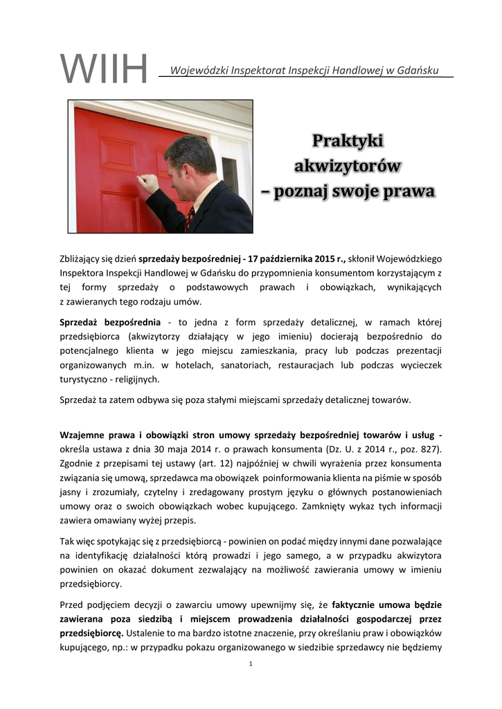 WIIH Wojewódzki Inspektorat Inspekcji Handlowej w Gdańsku Praktyki akwizytorów – poznaj swoje prawa Zbliżający się dzień sprzedaży bezpośredniej - 17 października 2015 r., skłonił Wojewódzkiego Inspektora Inspekcji Handlowej w Gdańsku do przypomnienia konsumentom korzystającym z tej formy sprzedaży o podstawowych prawach i obowiązkach, wynikających z zawieranych tego rodzaju umów. Sprzedaż bezpośrednia - to jedna z form sprzedaży detalicznej, w ramach której przedsiębiorca (akwizytorzy działający w jego imieniu) docierają bezpośrednio do potencjalnego klienta w jego miejscu zamieszkania, pracy lub podczas prezentacji organizowanych m.in. w hotelach, sanatoriach, restauracjach lub podczas wycieczek turystyczno - religijnych. Sprzedaż ta zatem odbywa się poza stałymi miejscami sprzedaży detalicznej towarów. Wzajemne prawa i obowiązki stron umowy sprzedaży bezpośredniej towarów i usług określa ustawa z dnia 30 maja 2014 r. o prawach konsumenta (Dz. U. z 2014 r., poz. 827). Zgodnie z przepisami tej ustawy (art. 12) najpóźniej w chwili wyrażenia przez konsumenta związania się umową, sprzedawca ma obowiązek poinformowania klienta na piśmie w sposób jasny i zrozumiały, czytelny i zredagowany prostym języku o głównych postanowieniach umowy oraz o swoich obowiązkach wobec kupującego. Zamknięty wykaz tych informacji zawiera omawiany wyżej przepis. Tak więc spotykając się z przedsiębiorcą - powinien on podać między innymi dane pozwalające na identyfikację działalności którą prowadzi i jego samego, a w przypadku akwizytora powinien on okazać dokument zezwalający na możliwość zawierania umowy w imieniu przedsiębiorcy. Przed podjęciem decyzji o zawarciu umowy upewnijmy się, że faktycznie umowa będzie zawierana poza siedzibą i miejscem prowadzenia działalności gospodarczej przez przedsiębiorcę. Ustalenie to ma bardzo istotne znaczenie, przy określaniu praw i obowiązków kupującego, np.: w przypadku pokazu organizowanego w siedzibie sprzedawcy nie będziemy 1 mieli do czynienia z zawarciem umowy poza lokalem przedsiębiorcy lub sprzedaży na odległość. Telefoniczne zawieranie umów w ramach sprzedaży bezpośredniej – w tym przypadku przedsiębiorca ma obowiązek poinformować konsumenta o celu rozmowy, podać identyfikujące go dane. Ponadto ma obowiązek potwierdzić treść proponowanej umowy pisemnie lub na innym trwałym nośniku. Do zawarcia umowy dochodzi tylko wtedy, gdy konsument otrzyma opisane wyżej potwierdzenie, a sam złoży oświadczenie o zawarciu umowy. Odstąpienie od umowy sprzedaży bezpośredniej - każdy konsument, który korzysta ze sprzedaży bezpośredniej, może odstąpić od zawartej umowy bez podawania przyczyny w ciągu 14 dni od dnia jej zawarcia. Bieg tego terminu liczy się w różny sposób w zależności od przedmiotu umowy: a) umowy przenoszące własność zakupionej rzeczy na kupującego – z chwilą objęcia rzeczy w posiadanie przez kupującego lub wskazaną przez niego osobę trzecią, za wyjątkiem przewoźnika, b) sprzedaż częściowa lub partiami - z dniem objęcia w posiadanie ostatniej części lub partii, c) dostarczanie rzeczy przez czas oznaczony - od objęcia w posiadanie pierwszej rzeczy, d) pozostałe umowy - od dnia ich zawarcia. Należy podkreślić, iż odstąpienie od umowy jest możliwe nawet gdy zakupiona rzecz nie jest wadliwa. Konsekwencją odstąpienia od umowy jest wzajemny zwrot świadczeń. Po stronie konsumenta jest to zwrot rzeczy, a po stronie sprzedawcy kwota uiszczonej należności za zakupiony towar. Zwroty te powinny nastąpić niezwłocznie, ale nie później niż w terminie 14 dni licząc od dnia otrzymania przez sprzedawcę oświadczenia o odstąpieniu umowy wraz z towarem. Brak poinformowania przez przedsiębiorcę konsumenta o jego prawie do odstąpienia od umowy - w przypadku w/w prawo do odstąpienia od umowy wygasa po upływie 12 miesięcy od dnia upływu pierwotnego 14 dniowego terminu. Skutki rozwiązania umowy sprzedaży - w sensie prawnym uznaje się umowę za niezawartą. Wszystkie związanie z nią umowy dodatkowe wygasają, a konsument nie ponosi kosztów z tym związanych. Prawa reklamacyjne klienta - konsument niezależnie od opisanego wyżej prawa do odstąpienia umowy, może zakupiony towar reklamować na ogólnych zasadach, czyli na takich samych zasadach, jak przy zakupie towaru w sprzedaży detalicznej (w sklepie). 2 Pomoc dla konsumentów - w przypadku pytań i wątpliwości związanych ze sprzedażą bezpośrednią, informacje (w tym porady) można uzyskać w: Wydziale Ochrony Konsumentów Wojewódzkiego Inspektoratu Inspekcji Handlowej w Gdańsku tel. (058) 3414675 wew. 32 email: [email protected] Stałym Polubownym Sądzie Konsumenckim w Gdańsku tel. (058) 3415113 email: [email protected] Delegaturze w Słupsku Wojewódzkiego Inspektoratu Inspekcji Handlowej w Gdańsku samodzielnie stanowisko ds. ochrony konsumentów / Ośrodek Zamiejscowy w Słupsku Stałego Polubownego Sądu Konsumenckiego w Gdańsku tel. (059) 8468545 email: [email protected] Dodatkowe informacje dla mediów: Waldemar Kołodziejczyk, p.o. Rzecznika Prasowego Wojewódzkiego Inspektoratu Inspekcji Handlowej w Gdańsku ul. Marii Konopnickiej 4 80–240 Gdańsk tel. (58) 3410924 wew. 33 tel. kom. 502255765 email: [email protected] 3