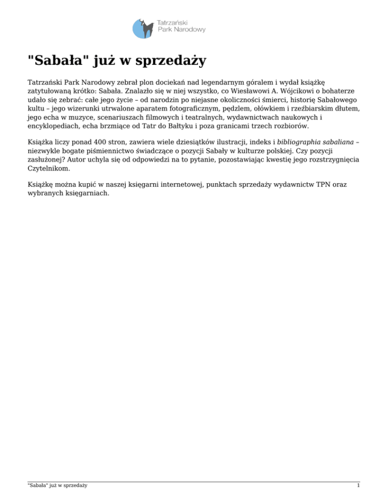 "Sabała" już w sprzedaży Tatrzański Park Narodowy zebrał plon dociekań nad legendarnym góralem i wydał książkę zatytułowaną krótko: Sabała. Znalazło się w niej wszystko, co Wiesławowi A. Wójcikowi o bohaterze udało się zebrać: całe jego życie – od narodzin po niejasne okoliczności śmierci, historię Sabałowego kultu – jego wizerunki utrwalone aparatem fotograficznym, pędzlem, ołówkiem i rzeźbiarskim dłutem, jego echa w muzyce, scenariuszach filmowych i teatralnych, wydawnictwach naukowych i encyklopediach, echa brzmiące od Tatr do Bałtyku i poza granicami trzech rozbiorów. Książka liczy ponad 400 stron, zawiera wiele dziesiątków ilustracji, indeks i bibliographia sabaliana – niezwykle bogate piśmiennictwo świadczące o pozycji Sabały w kulturze polskiej. Czy pozycji zasłużonej? Autor uchyla się od odpowiedzi na to pytanie, pozostawiając kwestię jego rozstrzygnięcia Czytelnikom. Książkę można kupić w naszej księgarni internetowej, punktach sprzedaży wydawnictw TPN oraz wybranych księgarniach. "Sabała" już w sprzedaży 1