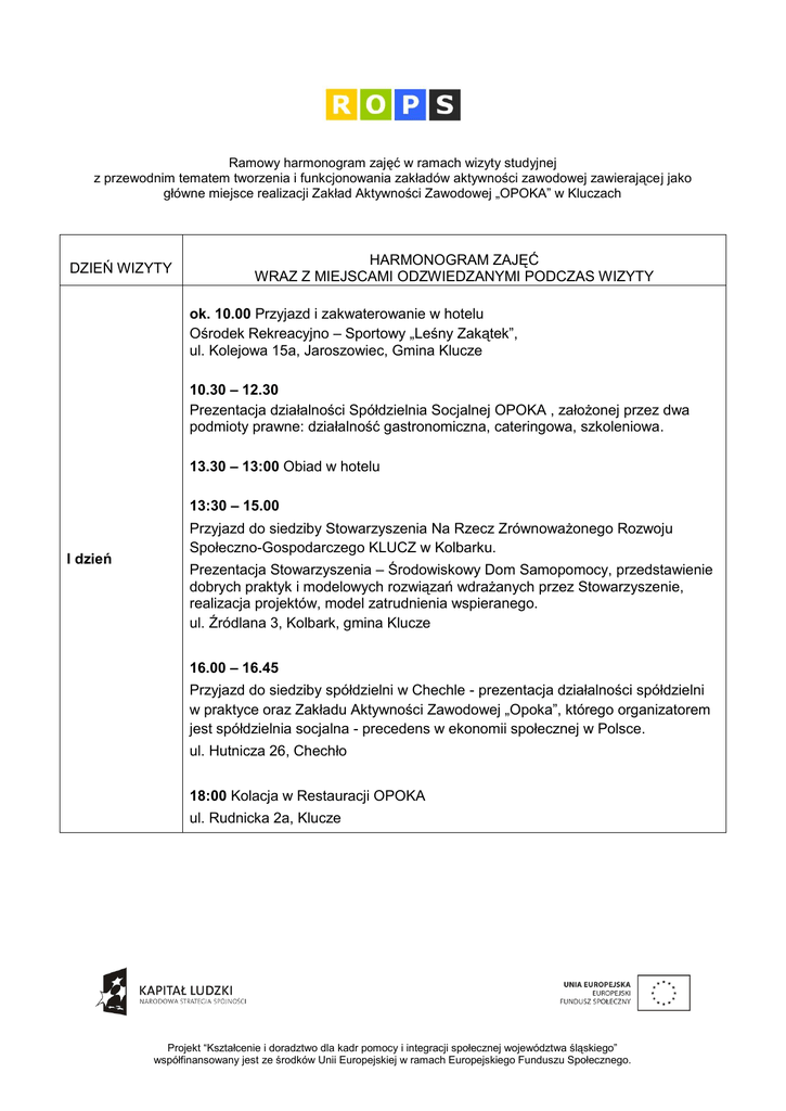 Ramowy harmonogram zajęć w ramach wizyty studyjnej z przewodnim tematem tworzenia i funkcjonowania zakładów aktywności zawodowej zawierającej jako główne miejsce realizacji Zakład Aktywności Zawodowej „OPOKA” w Kluczach DZIEŃ WIZYTY HARMONOGRAM ZAJĘĆ WRAZ Z MIEJSCAMI ODZWIEDZANYMI PODCZAS WIZYTY ok. 10.00 Przyjazd i zakwaterowanie w hotelu Ośrodek Rekreacyjno – Sportowy „Leśny Zakątek”, ul. Kolejowa 15a, Jaroszowiec, Gmina Klucze 10.30 – 12.30 Prezentacja działalności Spółdzielnia Socjalnej OPOKA , założonej przez dwa podmioty prawne: działalność gastronomiczna, cateringowa, szkoleniowa. 13.30 – 13:00 Obiad w hotelu 13:30 – 15.00 I dzień Przyjazd do siedziby Stowarzyszenia Na Rzecz Zrównoważonego Rozwoju Społeczno-Gospodarczego KLUCZ w Kolbarku. Prezentacja Stowarzyszenia – Środowiskowy Dom Samopomocy, przedstawienie dobrych praktyk i modelowych rozwiązań wdrażanych przez Stowarzyszenie, realizacja projektów, model zatrudnienia wspieranego. ul. Źródlana 3, Kolbark, gmina Klucze 16.00 – 16.45 Przyjazd do siedziby spółdzielni w Chechle - prezentacja działalności spółdzielni w praktyce oraz Zakładu Aktywności Zawodowej „Opoka”, którego organizatorem jest spółdzielnia socjalna - precedens w ekonomii społecznej w Polsce. ul. Hutnicza 26, Chechło 18:00 Kolacja w Restauracji OPOKA ul. Rudnicka 2a, Klucze Projekt “Kształcenie i doradztwo dla kadr pomocy i integracji społecznej województwa śląskiego” współfinansowany jest ze środków Unii Europejskiej w ramach Europejskiego Funduszu Społecznego. 7:00 – 8:30 Śniadanie w hotelu 9:00 – 10:30 Szkolenie z zakresu tworzenia i funkcjonowania Zakładów Aktywności Zawodowej: Spółdzielnia Socjalna jako organizator ZAZ – różnice i cechy wspólne przedsiębiorstw. Specyfika. Agnieszka Ścigaj – wykładowca Ośrodek Rekreacyjno-Sportowy, ul. Kolejowa 15a, Jaroszowiec II dzień: praktyczne szkolenie z zakresu tworzenia i funkcjonowania zakładów aktywności zawodowej 10.30 – 10.45 Przerwa kawowa 10:45 – 12:15 ZAZ jako firma społeczna – działalności gospodarcza i rynkowa ZAZ. Funkcjonowanie na lokalnym rynku. Podstawy prawne zakładania ZAZ, źródła finansowania. 12:30 – 13:00 Obiad 13:30 – 15:00 Program rehabilitacji oraz program działalności wytwórczej i usługowej – planowanie działalności ZAZ z uwzględnieniem tych programów. 15.00 – 15.15 Przerwa kawowa 15:15 – 16:30 Zarządzanie ZAZ – procesy i zasoby charakterystyczne w prowadzeniu ZAZ 18:00 Kolacja 07.30 – 08.30 Śniadanie w hotelu 09:00 – 11:15 Przyjazd do siedziby Chrześcijańskiego Stowarzyszenia Dobroczynnego w Kluczach, prowadzącego schronisko dla osób bezdomnych, Warsztaty Terapii Zajęciowej oraz Centrum Integracji Społecznej. Chrześcijańskie Stowarzyszenie Dobroczynne, ul. Bolesławska 23, Klucze III dzień 11.30 – 13.45 Wizyta w Klubie Integracji Społecznej prowadzonym przez Ośrodek Pomocy Społecznej w Kluczach ul. Zawierciańska 12, Klucze 14:00 Obiad 15:00 Podsumowanie i zakończenie wizyty Projekt “Kształcenie i doradztwo dla kadr pomocy i integracji społecznej województwa śląskiego” współfinansowany jest ze środków Unii Europejskiej w ramach Europejskiego Funduszu Społecznego.