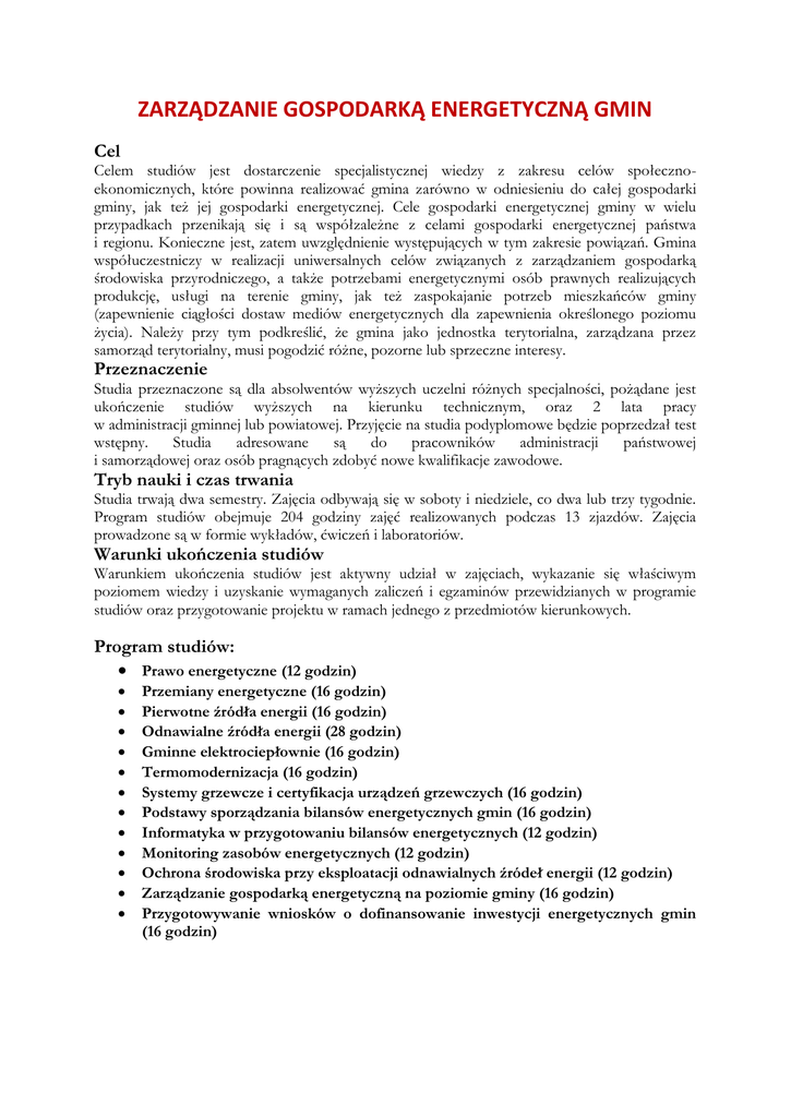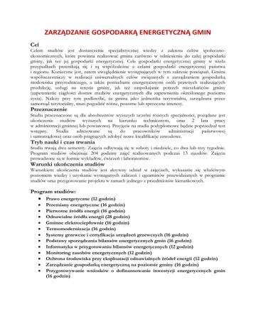 ZARZĄDZANIE GOSPODARKĄ ENERGETYCZNĄ GMIN Cel Celem studiów jest dostarczenie specjalistycznej wiedzy z zakresu celów społecznoekonomicznych, które powinna realizować gmina zarówno w odniesieniu do całej gospodarki gminy, jak też jej gospodarki energetycznej. Cele gospodarki energetycznej gminy w wielu przypadkach przenikają się i są współzależne z celami gospodarki energetycznej państwa i regionu. Konieczne jest, zatem uwzględnienie występujących w tym zakresie powiązań. Gmina współuczestniczy w realizacji uniwersalnych celów związanych z zarządzaniem gospodarką środowiska przyrodniczego, a także potrzebami energetycznymi osób prawnych realizujących produkcję, usługi na terenie gminy, jak też zaspokajanie potrzeb mieszkańców gminy (zapewnienie ciągłości dostaw mediów energetycznych dla zapewnienia określonego poziomu życia). Należy przy tym podkreślić, że gmina jako jednostka terytorialna, zarządzana przez samorząd terytorialny, musi pogodzić różne, pozorne lub sprzeczne interesy. Przeznaczenie Studia przeznaczone są dla absolwentów wyższych uczelni różnych specjalności, pożądane jest ukończenie studiów wyższych na kierunku technicznym, oraz 2 lata pracy w administracji gminnej lub powiatowej. Przyjęcie na studia podyplomowe będzie poprzedzał test wstępny. Studia adresowane są do pracowników administracji państwowej i samorządowej oraz osób pragnących zdobyć nowe kwalifikacje zawodowe. Tryb nauki i czas trwania Studia trwają dwa semestry. Zajęcia odbywają się w soboty i niedziele, co dwa lub trzy tygodnie. Program studiów obejmuje 204 godziny zajęć realizowanych podczas 13 zjazdów. Zajęcia prowadzone są w formie wykładów, ćwiczeń i laboratoriów. Warunki ukończenia studiów Warunkiem ukończenia studiów jest aktywny udział w zajęciach, wykazanie się właściwym poziomem wiedzy i uzyskanie wymaganych zaliczeń i egzaminów przewidzianych w programie studiów oraz przygotowanie projektu w ramach jednego z przedmiotów kierunkowych. Program studiów: Prawo energetyczne (12 godzin) Przemiany energetyczne (16 godzin) Pierwotne źródła energii (16 godzin) Odnawialne źródła energii (28 godzin) Gminne elektrociepłownie (16 godzin) Termomodernizacja (16 godzin) Systemy grzewcze i certyfikacja urządzeń grzewczych (16 godzin) Podstawy sporządzania bilansów energetycznych gmin (16 godzin) Informatyka w przygotowaniu bilansów energetycznych (12 godzin) Monitoring zasobów energetycznych (12 godzin) Ochrona środowiska przy eksploatacji odnawialnych źródeł energii (12 godzin) Zarządzanie gospodarką energetyczną na poziomie gminy (16 godzin) Przygotowywanie wniosków o dofinansowanie inwestycji energetycznych gmin (16 godzin)