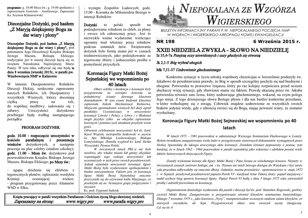 programie: g. 18.00 Msza św.; g. 19.00 spotkanie z zaproszonym Gościem – konferencja. Zapraszam Ks. Szymon Klimaszewski. - występy Zespołów Ludowych; godz. 15.00 - Koronka do Miłosierdzia Bożego w intencji Rolników. Diecezjalne Dożynki, pod hasłem „Z Maryją dziękujemy Bogu za dar wiary i plony" Dożynki to polski sposób na podziękowanie rolnikom za chleb, za plony i owoce ich całorocznej pracy. Jest to niezwykle ważne wydarzenie wieńczące ogromny trud włożony przez rolników podczas ostatnich żniw. Świętowanie dożynek było formą znana już w czasach średniowiecznych, jako podziękowanie za tegoroczne zbiory i jednocześnie prośba o pomyślność przyszłych. Diecezjalne Dożynki, pod hasłem „Z Maryją dziękujemy Bogu za dar wiary i plony", pod patronatem Jego Ekscelencji Księdza Biskupa Jerzego Mazura, Biskupa Ełckiego, tradycyjnie już w naszej diecezji łączą się ze świętem Narodzenia Najświętszej Maryi Panny. W tym roku, odbywać się one będą w dniu 8 września (wtorek) 2015r., w parafii pw. Wniebowzięcia NMP w Kalinowie. W imieniu Duszpasterstwa Rolników Diecezji Ełckiej, serdecznie zapraszamy naszych Rolników, ich Duszpasterzy i wszystkich Wiernych, którzy doceniają ciężką pracę na roli, do wspólnej modlitwy, radowania się i zabawy. Uroczystości dożynkowe przebiegać będą według następującego porządku: PROGRAM DOŻYNEK godz. 10.00 - rozpoczęcie uroczystości w kościele parafialnym i prezentacja wieńców dożynkowych, a następnie procesja na plac celebry (stadion szkolny); godz. 11.00 - Msza św. dożynkowa pod przewodnictwem Księdza Biskupa Jerzego Mazura, Biskupa Ełckiego; po Mszy św.: - agapa; dzielenie się chlebem z tegorocznych plonów; ogłoszenie werdyktu Komisji oceniającej wieńce; - program przygotowany przez Alumnów WSD w Ełku; Ołtarz celebry i kredencja z koronami były przygotowane na zewnątrz kościoła, na południowej ścianie dawnego klasztoru dominikanów. W tym czasie budynek klasztory zajmowała Szkoła Mechanizacji Rolnictwa. Miejscem zgromadzenia wiernych był duży ogród parafialny. Uczestniczący w uroczystości koronacji Litwini i Polacy z Litwy i z Białorusi mogli przybyć tylko na oficjalne zaproszenie krewnych i pomimo tych utrudnień przybyło wielu gości. Głównym celebransem uroczystości był ks. kard. Karol Wojtyła, metropolita krakowski w asyście ks. bpa Mikołaja Łasinowskiego, Biskupa Łomżyńskiego. Homilię wygłosił ks. kard. Stefan Wyszyński, Prymas Polski. W ówczesnych latach PRL-u nie było możliwe, aby władze miasta lub gminy oficjalnie wspomagały tego rodzaju uroczystości lub uczestniczyły w nich przez swoich przedstawicieli. Jednak sejneńska uroczystość koronacji figury Matki Bożej była wydarzeniem ogólnopolskim i bardzo emocjonalnym. Faktem jest, że koronacja figury Matki Bożej Sejneńskiej znacznie przyczyniła się do ożywienia kultu Maryjnego, co przełożyło się na liczniejsze grupy pielgrzymów i turystów. XXIII NIEDZIELA ZWYKŁA - SŁOWO NA NIEDZIELĘ Iz 35,4-7a Przejrzą oczy niewidomych i uszy głuchych się otworzą Jk 2,1-5 Bóg wybrał ubogich Konkretne sytuacje w życiu młodej wspólnoty chrześcijan w Jerozolimie posłużyły św. Jakubowi do przedstawienia prawdy, że Bóg w sposób szczególny pochyla się nad biednymi i ubogimi. Potwierdza to proroctwo Izajasza, który po raz kolejny rozpościera przed oczami słuchaczy wizję sytuacji, gdy zbawienie stanie się faktem. Prawdę ukazaną przez św. Jakuba potwierdza również sam Jezus, który uzdrawiając głuchoniemego, wskazał, na czym polega Jego misja. Z tego dzisiejszego słowa Bożego płynie i dla nas bardzo konkretne przesłanie, w które wsłuchajmy się z uwagą. Człowiek znajdzie uzdrowienie ze wszystkich swoich braków jedynie wtedy, gdy z ufnością zwróci się do Boga, mając pewność wiary, że zostanie wysłuchany. Koronacja Figury Matki Bożej Sejneoskiej we wspomnieniu po 40 latach W latach 1973 – 1981 pracowałem w administracji Wyższego Seminarium Duchownego w Łomży. Byłem świadkiem zaangażowania wielu ludzi w przygotowanie stosownych dokumentów wymaganych przez Stolicę Apostolską do takiego uroczystego aktu koronacji. Zostałem również poproszony o pomoc, tym bardziej, że w latach 1962 – 1966 pracowałem w parafii sejneńskiej jako wikariusz i zdołałem poznać wiele faktów historycznych dotyczących Figury. Zostały wykonane korony dla figury Matki Bożej i Pana Jezusa ze szlachetnego kruszcu. Niestety w ówczesnych czasach zarówno biskupi, jak i ks. Prymas nie mieli łatwego dostępu do Watykanu i być może cała procedura odbywałaby się znacznie dłużej. Jednakże, można powiedzieć - opatrznościowo w maju 1972 r. w Sejnach przebywał przedstawiciel papieża Pawła VI - kardynał Artur Tabera, który poparł inicjatywę i nadał szybszy bieg sprawie koronacji figury. Papież Paweł VI bullą z dnia 3 lutego 1973 roku zatwierdził prośbę i udzielił pozwolenia na koronację. Organizatorem doniosłego wydarzenia dla parafii i diecezji był ks. prał. Stanisław Rogowski, gorliwy czciciel Matki Bożej. Zaangażowano w przygotowania również kleryków seminarium łomżyńskiego. Dlatego 7 września 1975 r., jako kierowca „Nysy”, transportowałem wczesnym rankiem ośmiu kleryków, ze starszych roczników, do Sejn. Przygotowywali ołtarz oraz tworzyli asystę liturgiczną. Cd. na str. 4 Ks. prał. Zygmunt Sędziak www.wigry.pro 6 Września 2015 r. Mk 7,31-37 Uzdrowienie głuchoniemego Koronacja Figury Matki Bożej Sejneńskiej we wspomnieniu po 40 latach Księża pracujący w parafii wszystkim Parafianom i Gościom życzą błogo sławionej niedzieli. Zapraszamy na stronę: NR 198 www.parafia.wigry.pro 4 1 KALENDARIUM LITURGICZNE 06.09. – Niedziela XXIII Niedziela Zwykła. Dożynki Parafialne. 07.09. – Poniedziałek Dzień powszedni. Rocznica koronacji Figury Matki Bożej w Sejnach. 08.09. – Wtorek Święt