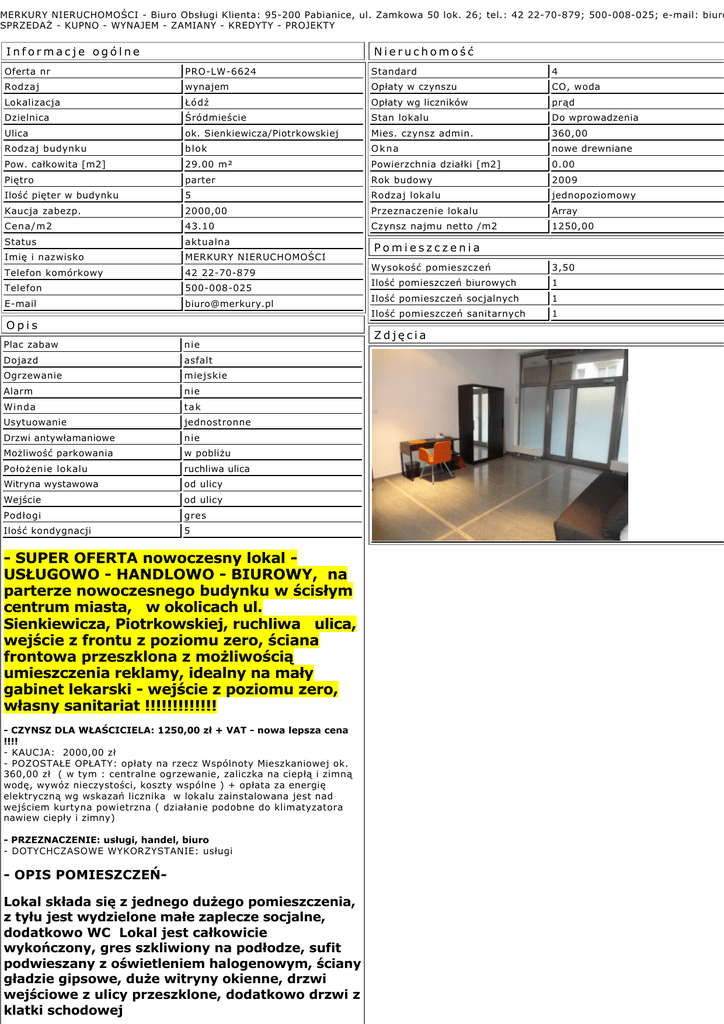 MERKURY NIERUCHOMOŚCI - Biuro Obsługi Klienta: 95-200 Pabianice, ul. Zamkowa 50 lok. 26; tel.: 42 22-70-879; 500-008-025; e-mail: biuro SPRZEDAŻ - KUPNO - WYNAJEM - ZAMIANY - KREDYTY - PROJEKTY Informacje ogólne Nieruchomość Oferta nr PRO-LW-6624 Standard 4 Rodzaj wynajem Opłaty w czynszu CO, woda Lokalizacja Łódź Opłaty wg liczników prąd Dzielnica Śródmieście Stan lokalu Do wprowadzenia Ulica ok. Sienkiewicza/Piotrkowskiej Mies. czynsz admin. 360,00 Rodzaj budynku blok Okna nowe drewniane Pow. całkowita [m2] 29.00 m² Powierzchnia działki [m2] 0.00 Piętro parter Rok budowy 2009 Ilość pięter w budynku 5 Rodzaj lokalu jednopoziomowy Kaucja zabezp. 2000,00 Przeznaczenie lokalu Array Cena/m2 43.10 Czynsz najmu netto /m2 1250,00 Status aktualna Imię i nazwisko MERKURY NIERUCHOMOŚCI Telefon komórkowy 42 22-70-879 Telefon 500-008-025 E-mail [email protected] Opis Plac zabaw nie Dojazd asfalt Ogrzewanie miejskie Alarm nie Winda tak Usytuowanie jednostronne Drzwi antywłamaniowe nie Możliwość parkowania w pobliżu Położenie lokalu ruchliwa ulica Witryna wystawowa od ulicy Wejście od ulicy Podłogi gres Ilość kondygnacji 5 - SUPER OFERTA nowoczesny lokal USŁUGOWO - HANDLOWO - BIUROWY, na parterze nowoczesnego budynku w ścisłym centrum miasta, w okolicach ul. Sienkiewicza, Piotrkowskiej, ruchliwa ulica, wejście z frontu z poziomu zero, ściana frontowa przeszklona z możliwością umieszczenia reklamy, idealny na mały gabinet lekarski - wejście z poziomu zero, własny sanitariat !!!!!!!!!!!!! - CZYNSZ DLA WŁAŚCICIELA: 1250,00 zł + VAT - nowa lepsza cena !!!! - KAUCJA: 2000,00 zł - POZOSTAŁE OPŁATY: opłaty na rzecz Wspólnoty Mieszkaniowej ok. 360,00 zł ( w tym : centralne ogrzewanie, zaliczka na ciepłą i zimną wodę, wywóz nieczystości, koszty wspólne ) + opłata za energię elektryczną wg wskazań licznika w lokalu zainstalowana jest nad wejściem kurtyna powietrzna ( działanie podobne do klimatyzatora nawiew ciepły i zimny) - PRZEZNACZENIE: usługi, handel, biuro - DOTYCHCZASOWE WYKORZYSTANIE: usługi - OPIS POMIESZCZEŃLokal składa się z jednego dużego pomieszczenia, z tyłu jest wydzielone małe zaplecze socjalne, dodatkowo WC Lokal jest całkowicie wykończony, gres szkliwiony na podłodze, sufit podwieszany z oświetleniem halogenowym, ściany gładzie gipsowe, duże witryny okienne, drzwi wejściowe z ulicy przeszklone, dodatkowo drzwi z klatki schodowej Pomieszczenia Wysokość pomieszczeń 3,50 Ilość pomieszczeń biurowych 1 Ilość pomieszczeń socjalnych 1 Ilość pomieszczeń sanitarnych 1 Zdjęcia - SALA GŁÓWNA ok. 25 m, podłoga gres szkliwiony , ściany gładzie , osiwietlenie halogenowe - WC OK. 2 m, umywalka z szafką, sedes, podłoga gres szkliwiony, ściany gladzie i glazura - ZAPLECZE ok. 2 m oddzielone od sali głównej ścianką z luksferów - RODZAJ I WYKOŃCZENIE BUDYNKU: elegancki budynek, na parterze działalność gospodarcza, na wyższych kondygnacjach eleganckie mieszkania - WEJŚCIE: 2 wejścia jedno z ulicy, drugie z klatki - OKNA/DRZWI: PCV na ulicę, drzwi przeszklone wejście z ulicy - OŚWIETLENIE: halogenowe - MEDIA/INSTALACJE: miejskie, co miejskie, dodatkowo kurtyna powietrzna nad wejściem - ZABEZPIECZENIA/SYSTEMY ALARMOWE/DOZóR: całodobowa ochrona budynku - PARKING/WJAZD DLA SAMOCHODóW: możliwe parkowanie na płatnym parkingu w pobliżu budynku - UWAGA! Oferty prezentowane na naszych stronach nie stanowią oferty w rozumieniu Kodeksu Cywilnego, a są jedynie zaproszeniem do rokowań. Podane dane mają charakter wyłącznie informacyjny i mogą odbiegać od stanu faktycznego. Opis obiektu został sporządzony na podstawie informacji przekazanych przez Oferującego. Oferta może być już nieaktualna. Prosimy o telefon. MERKURY NIERUCHOMOŚCI - Biuro Obsługi Klienta: 95-200 Pabianice, ul. Zamkowa 50 lok. 26; tel: 42 22-70-879; 500-008-025; e-mail: biu KUPNO - SPRZEDAŻ - WYNAJEM - ZAMIANA - KREDYTY - PROJEKTY
