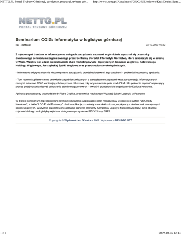 NETTG.PL Portal Trybuny Górniczej, górnictwo, przetargi, trybuna gór... 1z1 http://www.nettg.pl/Aktualnosci/G%C3%B3rnictwo/Kraj/Drukuj/Semi... Seminarium COIG: Informatyka w logistyce górniczej kaj - nettg.pl 03.10.2009 16:22 Z najnowszymi trendami w informatyce na usługach zarządzania zapasami w górnictwie zapoznali się uczestnicy dwudniowego seminarium zorganizowanego przez Centralny Ośrodek Informatyki Górnictwa, które zakończyło się w sobotę w Wiśle. Wzięli w nim udział przedstawiciele służb marketingowych i logistycznych Kompanii Węglowej, Katowickiego Holdingu Węglowego, Jastrzębskiej Spółki Węglowej oraz przedsiębiorstw okołogórniczych. - Informatyka odgrywa obecnie kluczową rolę w zarządzaniu przedsiębiorstwem i jego zasobami - podkreślali uczestnicy spotkania. - Tym razem skupiliśmy się na omówienie zagadnień związanych z zarządzaniem zapasami wraz z prezentacją informatycznych narzędzi autorstwa COIG wspierających ten proces. Kluczową rolę w tym zakresie pełni moduł "LMU Uzupełnienie zapasu" wspierający proces podejmowania decyzji odnowienia stanów magazynowych – wyjaśnił przedstawiciel organizatorów Dariusz Kotuchna. Aplikacja powstała przy współudziale dr Piotra Cyplika, pracownika naukowego Wyższej Szkoły Logistyki w Poznaniu. W trakcie seminarium zaprezentowano również rozwiązania wspierające obrót magazynowy w oparciu o system "LKK Kody Kreskowe", a także "LDO Portal Dostawcy". Jest to aplikacja pozwalająca na elektroniczną współpracę z dostawcami zewnętrznymi spółek węglowych. Wszystkie przedstawione aplikacje stanowią elementy Kompleksu Logistyki Materiałowej (KLM) czyli obszaru odpowiedzialnego za logistykę wejścia w zintegrowanym systemie SZYK2 klasy ERP2. Copyrights © Wydawnictwo Górnicze 2007. Wykonawca MENAGO.NET 2009-10-06 12:13