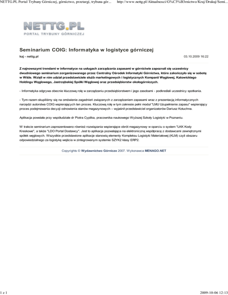 Seminarium COIG: Informatyka w logistycze górniczej
