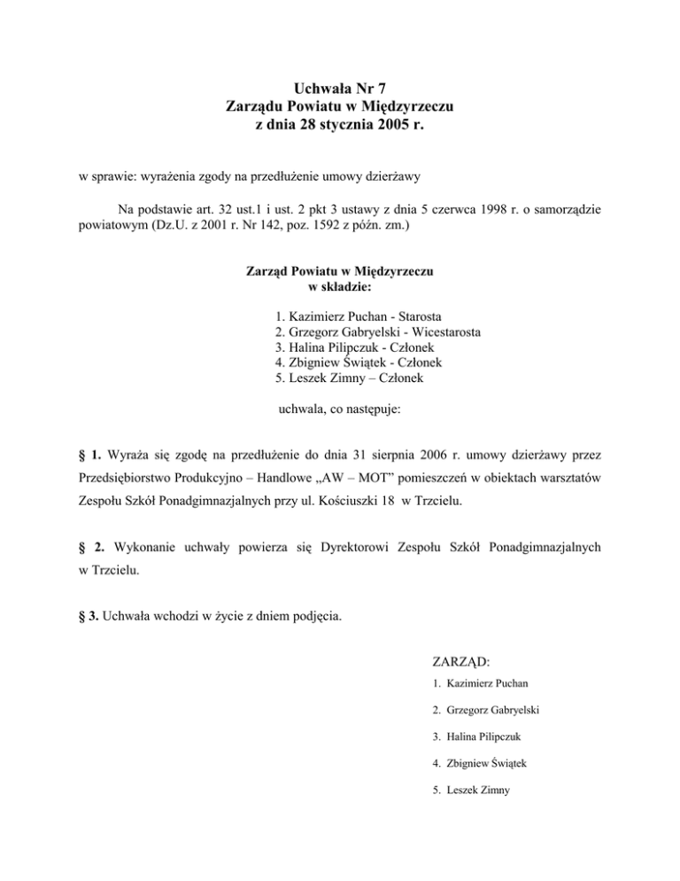 Uchwała Nr 7 Zarz du Powiatu w Mi dzyrzeczu z dnia 28 stycznia 2005 r. w sprawie: wyra enia zgody na przedłu enie umowy dzier awy Na podstawie art. 32 ust.1 i ust. 2 pkt 3 ustawy z dnia 5 czerwca 1998 r. o samorz dzie powiatowym (Dz.U. z 2001 r. Nr 142, poz. 1592 z pó n. zm.) Zarz d Powiatu w Mi dzyrzeczu w składzie: 1. Kazimierz Puchan - Starosta 2. Grzegorz Gabryelski - Wicestarosta 3. Halina Pilipczuk - Członek 4. Zbigniew wi tek - Członek 5. Leszek Zimny – Członek uchwala, co nast puje: § 1. Wyra a si zgod na przedłu enie do dnia 31 sierpnia 2006 r. umowy dzier awy przez Przedsi biorstwo Produkcyjno – Handlowe „AW – MOT” pomieszcze w obiektach warsztatów Zespołu Szkół Ponadgimnazjalnych przy ul. Ko ciuszki 18 w Trzcielu. § 2. Wykonanie uchwały powierza si Dyrektorowi Zespołu Szkół Ponadgimnazjalnych w Trzcielu. § 3. Uchwała wchodzi w ycie z dniem podj cia. ZARZ D: 1. Kazimierz Puchan 2. Grzegorz Gabryelski 3. Halina Pilipczuk 4. Zbigniew wi tek 5. Leszek Zimny