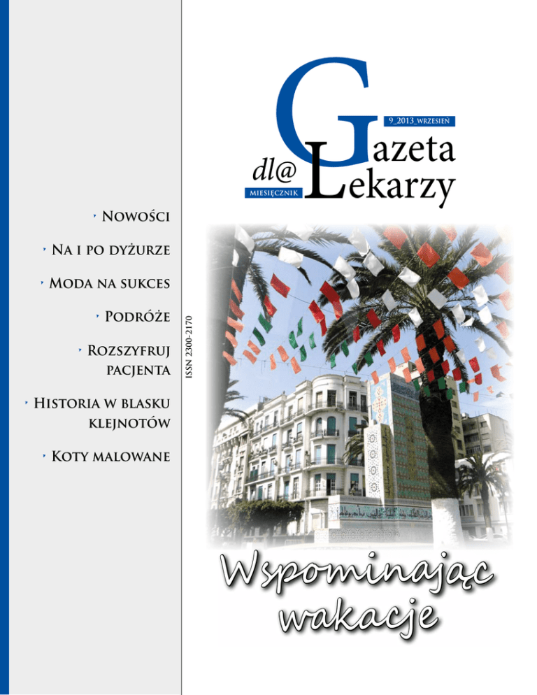 G L dl@ miesięcznik • Nowości 9_2013_wrzesień azeta ekarzy • Na i po dyżurze • Podróże • Rozszyfruj pacjenta ISSN 2300-2170 • Moda na sukces • Historia w blasku klejnotów • Koty malowane Wspominając wakacje Koleżanki i Koledzy, W akacje i urlopy mają to do siebie, że szybko przemijają. Na długie miesiące dzielące nas od następnych wyjazdów pozostają nam wspomnienia, które chyba są najprzyjemniejszym elementem związanym z podróżowaniem. Jesteśmy społecznością lubiącą dalekie i egzotyczne wyprawy, na których możemy w pełni oderwać się od realiów dnia codziennego. N adchodzące dni zapowiadają się raczej nieciekawie – dziury budżetowe powiększają się, a stawki za poszczególne procedury na różne sposoby są pomniejszane. Próby przeforsowania naszego punktu widzenia na ogół kończą się niepowodzeniem, a odważnych, którzy decydują się na pracę na własny rachunek, ciągle nie ma wielu. Na dyżurze pozostają etyka i empatia. Nie zapominamy o tych żelaznych tematach. U ważam, że zawsze warto spróbować, jeżeli nie trzymają nas w pracy ważne powody formalne typu specjalizacja czy staż. Ciągle zbyt mało w nas wiary w powodzenie pracy na wolnym rynku, choć nie słychać o masowych powrotach w niewolnicze dyby tych, którzy się odważyli i skonfrontowali swoje umiejętności z wolnym rynkiem. W pracy finansowanej przez państwowego płatnika można oczekiwać jedynie dalszego nasilenia rygoryzmów formalnych i skutecznego obcinania stawek. Czy więc za rok będziemy mogli pozwolić sobie na egzotyczne wakacje, dokończenie budowy domu i wspomnieniowy numer „Gazety dla Lekarzy”? Czas pokaże! Z astanawiając się nad tym, na co nas stać, warto pamiętać, że najlepsze inwestycje wiążą się ze zdobywaniem nowych umiejętności oraz edukacją dzieci. Jak piszę w artykule o nowych wytycznych leczenia nadciśnienia tętniczego, pamiętajmy jednak, że łatwo cel wytyczyć, trudniej go osiągnąć. Zatem życzę powodzenia zarówno w wytyczaniu, jak i osiąganiu ważnych celów! ISSN 2300-2170 Nr 9(19)_2013 Wydawca Krystyna Knypl Warszawa Redakcja Rysunki Zen. Krystyna Knypl, redaktor naczelna Okładka fot. Mieczysław Knypl [email protected] Projekt graficzny i opracowanie Mieczysław Knypl, sekretarz redakcji komputerowe Mieczysław Knypl [email protected] „Gazeta dla Lekarzy” jest miesięcznikiem redagowaKatarzyna Kowalska, z-ca sekretarza redakcji nym przez lekarzy i członków ich rodzin, przeznaczoWspółpraca przy bieżącym numerze nym dla osób uprawnionych do wystawiania recept. Alicja Barwicka, Jagoda Czurak, Ewa Dere- Opinie wyrażone w artykułach publikowanych szak-Kozanecka, Joanna Dusza-Kozera, Rafał w „Gazecie dla Lekarzy” są wyłącznie opiniami Stadryniak, Marzena Więckowska. ich autorów. Redakcja zastrzega sobie prawo do redagowania nadesłanych do publikacji tekstów, w tym skracania, zmiany tytułów i śródtytułów. Wydawca i redakcja mogą odmówić publikowania reklam i ogłoszeń, a w razie przyjęcia ich do druku nie ponoszą odpowiedzialności za ich treść. Wszelkie prawa zastrzeżone. www.gazeta-dla-lekarzy.com Krystyna Knypl W numerze Nowości ....................................................... 4, 13, 16, 20 Łatwo cel wytyczyć, trudniej go osiągnąć Krystyna Knypl ........................................................................... 6 Onkologia polska w naprawie? Krystyna Knypl ........................................................................... 9 11 4 Po dyżurze Poprawka z etyki Rafał Stadryniak = @Grypa .................................................... 11 Na dyżurze Czy w gabinecie lekarza rodzinnego potrzebna jest empatia? Marzena Więckowska .............................................................. 14 14 Wspominając wakacje Rogaś w dolinie Sanu 17 @Curcuma_Zedoaria ............................................................... 17 Osaczenie fałszywą troską jako forma indoktrynacji Krystyna Knypl ......................................................................... 19 19 Moda na sukces Szklanka @Curcuma_Zedoaria ............................................................... 21 Podróże 21 Moje odkrycia kulinarne Jagoda Czurak .......................................................................... 22 Singapur, czyli małe jest wielkie Alicja Barwicka ......................................................................... 24 Chorwacja – zerwany film 22 Jagoda Czurak .......................................................................... 31 24 Historia w blasku klejnotów Diamentowe gwiazdy i czarny diadem Joanna Dusza-Kozera .............................................................. 33 31 Po dyżurze O wielkiej przemianie małej świnki morskiej Monika Jezierska-Kazberuk .................................................... 53 Rozszyfruj pacjenta ................................................. 54 Koty malowane Wrzesień (całkiem osobisty) 33 53 55 Ewa Dereszak-Kozanecka ........................................................ 55 3 9_2013 wrzesień Nowości Nowe amerykańskie wytyczne w sprawie profilaktyki po ekspozycji zawodowej na HIV Na łamach pisma „Infection Control and Hospital Epidemiology” dr David T. Kuhar i wsp. opublikowali 6 sierpnia 2013 r. artykuł zatytułowany Updated US Public Health Service Guidelines for the Management of Occupational Exposures to Human Immunodeficiency Virus and Recommendations for Postexposure Prophylaxis, który jest nowymi wytycznymi amerykańskimi w sprawie profilaktyki po zawodowej ekspozycji na HIV. Pracownicy ochrony zdrowia po zawodowej ekspozycji na HIV powinni bezzwłocznie W testach pierwszej geneAutorzy podkreślają, że rozpocząć trwającą 4 tygo- racji antygenem był oczyszczo- ponieważ do rozwoju infekdnie kurację trzema lekami ny materiał wirusowy uzyski- cji dochodzi zaledwie u 0,3% antyretrowirusowymi – piszą wany z hodowli komórkowej, osó