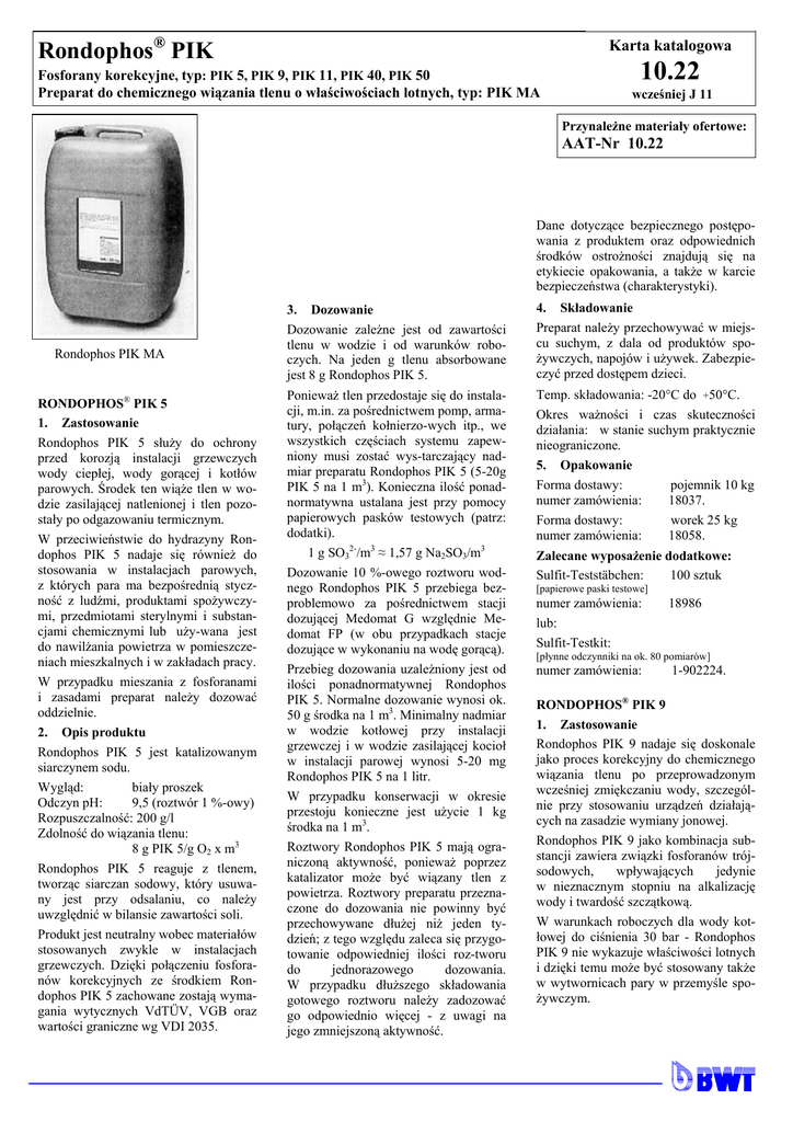 Rondophos® PIK Karta katalogowa Fosforany korekcyjne, typ: PIK 5, PIK 9, PIK 11, PIK 40, PIK 50 Preparat do chemicznego wiązania tlenu o właściwościach lotnych, typ: PIK MA 10.22 wcześniej J 11 Przynależne materiały ofertowe: AAT-Nr 10.22 Dane dotyczące bezpiecznego postępowania z produktem oraz odpowiednich środków ostrożności znajdują się na etykiecie opakowania, a także w karcie bezpieczeństwa (charakterystyki). Rondophos PIK MA RONDOPHOS® PIK 5 1. Zastosowanie Rondophos PIK 5 służy do ochrony przed korozją instalacji grzewczych wody ciepłej, wody gorącej i kotłów parowych. Środek ten wiąże tlen w wodzie zasilającej natlenionej i tlen pozostały po odgazowaniu termicznym. W przeciwieństwie do hydrazyny Rondophos PIK 5 nadaje się również do stosowania w instalacjach parowych, z których para ma bezpośrednią styczność z ludźmi, produktami spożywczymi, przedmiotami sterylnymi i substancjami chemicznymi lub uży-wana jest do nawilżania powietrza w pomieszczeniach mieszkalnych i w zakładach pracy. W przypadku mieszania z fosforanami i zasadami preparat należy dozować oddzielnie. 2. Opis produktu Rondophos PIK 5 jest katalizowanym siarczynem sodu. Wygląd: biały proszek Odczyn pH: 9,5 (roztwór 1 %-owy) Rozpuszczalność: 200 g/l Zdolność do wiązania tlenu: 8 g PIK 5/g O2 x m3 Rondophos PIK 5 reaguje z tlenem, tworząc siarczan sodowy, który usuwany jest przy odsalaniu, co należy uwzględnić w bilansie zawartości soli. Produkt jest neutralny wobec materiałów stosowanych zwykle w instalacjach grzewczych. Dzięki połączeniu fosforanów korekcyjnych ze środkiem Rondophos PIK 5 zachowane zostają wymagania wytycznych VdTÜV, VGB oraz wartości graniczne wg VDI 2035. 3. Dozowanie Dozowanie zależne jest od zawartości tlenu w wodzie i od warunków roboczych. Na jeden g tlenu absorbowane jest 8 g Rondophos PIK 5. Ponieważ tlen przedostaje się do instalacji, m.in. za pośrednictwem pomp, armatury, połączeń kołnierzo-wych itp., we wszystkich częściach systemu zapewniony musi zostać wys-tarczający nadmiar preparatu Rondophos PIK 5 (5-20g PIK 5 na 1 m3). Konieczna ilość ponadnormatywna ustalana jest przy pomocy papierowych pasków testowych (patrz: dodatki). 1 g SO32-/m3 ≈ 1,57 g Na2SO3/m3 Dozowanie 10 %-owego roztworu wodnego Rondophos PIK 5 przebiega bezproblemowo za pośrednictwem stacji dozującej Medomat G względnie Medomat FP (w obu przypadkach stacje dozujące w wykonaniu na wodę gorącą). Przebieg dozowania uzależniony jest od ilości ponadnormatywnej Rondophos PIK 5. Normalne dozowanie wynosi ok. 50 g środka na 1 m3. Minimalny nadmiar w wodzie kotłowej przy instalacji grzewczej i w wodzie zasilającej kocioł w instalacji parowej wynosi 5-20 mg Rondophos PIK 5 na 1 litr. W przypadku konserwacji w okresie przestoju konieczne jest użycie 1 kg środka na 1 m3. Roztwory Rondophos PIK 5 mają ograniczoną aktywność, ponieważ poprzez katalizator może być wiązany tlen z powietrza. Roztwory preparatu przeznaczone do dozowania nie powinny być przechowywane dłużej niż jeden tydzień; z tego względu zaleca się przygotowanie odpowiedniej ilości roz-tworu do jednorazowego dozowania. W przypadku dłuższego składowania gotowego roztworu należy zadozować go odpowiednio więcej - z uwagi na jego zmniejszoną aktywność. 4. Składowanie Preparat należy przechowywać w miejscu suchym, z dala od produktów spożywczych, napojów i używek. Zabezpieczyć przed dostępem dzieci. Temp. składowania: -20°C do +50°C. Okres ważności i czas skuteczności działania: w stanie suchym praktycznie nieograniczone. 5. Opakowanie Forma dostawy: numer zamówienia: Forma dostawy: numer zamówienia: pojemnik 10 kg 18037. worek 25 kg 18058. Zalecane wyposażenie dodatkowe: Sulfit-Teststäbchen: 100 sztuk [papierowe paski testowe] numer zamówienia: lub: Sulfit-Testkit: 18986 [płynne odczynniki na ok. 80 pomiarów] numer zamówienia: 1-902224. RONDOPHOS® PIK 9 1. Zastosowanie Rondophos PIK 9 nadaje się doskonale jako proces korekcyjny do chemicznego wiązania tlenu po przeprowadzonym wcześniej zmiękczaniu wody, szczególnie przy stosowaniu urządzeń działających na zasadzie wymiany jonowej. Rondophos PIK 9 jako kombinacja substancji zawiera związki fosforanów trójsodowych, wpływających jedynie w nieznacznym stopniu na alkalizację wody i twardość szczątkową. W warunkach roboczych dla wody kotłowej do ciśnienia 30 bar - Rondophos PIK 9 nie wykazuje właściwości lotnych i dzięki temu może być stosowany także w wytwornicach pary w przemyśle spożywczym. 2. Opis produktu Rondophos PIK 9 jest produktem kombinowanym, składającym się fosforanu i siarczynu sodowego. Charakterystyka: biały, higroskopijny proszek Odczyn pH: ok. 11 (roztwór 1%-owy) Ciężar nasypowy: ok. 1200 g/l Zawartość P2O5: ok. 8 % Zawartość SO2: ca 37 % Rozpuszczalność w wodzie przy 20 °C: 290 g/l Działanie: zapobiega korozji uwarunkowanej jakością wody, wiąże tlen i twardość resztkową, która przekształcana jest do postaci lekko usuwalnego szlamu, podwyższa zasadowość wody zasilającej kocioł, zwiększa przy stałym stosowaniu – opłacalność i bezpieczeństwo działania kotła. 3. Dozowanie Dozowanie Rondophos PIK 9 w roztworze wodnym przebiega bezproblemowo za pośrednictwem stacji dozującej do wody gorącej Medomat FP, Medomat G. Przy dozowaniu należy przestrzegać wskazówek producenta kotła względnie odnośnych przepisów (VDI, VDTÜV). Wartości orientacyjne w przypadku wody kotłowej: wartość P: 0,5 - 1,5 mmol/l P2O5: 2 - 20 mg/l ≈ PO43-: 3 - 27 mg/l dla wody zasilającej: SO32-: 5 - 40 mg/l. Ilości dozowania Rondophos PIK 9: - dawki zależne są od ilości tlenu w wodzie zasilającej kocioł: Temperatura °C rozpuszczony tlen g/m3 (przy 1 bar) Rondophos PIK 9 g/m3 10 30 50 70 90 11,3 7,5 5,5 3,8 1,6 140 95 70 50 20 Dozowanie powinno przebiegać w postaci 5-10 %-owego roztworu wodnego (woda zmiękcz