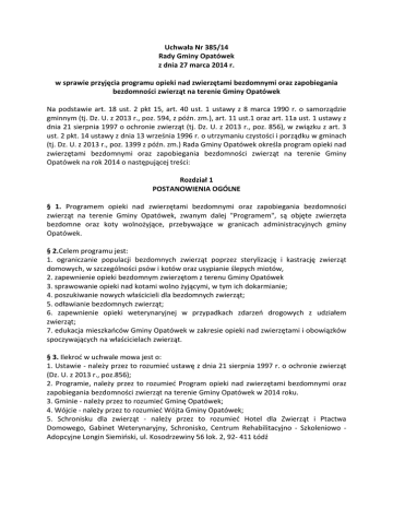 Uchwała Nr 385/14 Rady Gminy Opatówek z dnia 27 marca 2014 r. w sprawie przyjęcia programu opieki nad zwierzętami bezdomnymi oraz zapobiegania bezdomności zwierząt na terenie Gminy Opatówek Na podstawie art. 18 ust. 2 pkt 15, art. 40 ust. 1 ustawy z 8 marca 1990 r. o samorządzie gminnym (tj. Dz. U. z 2013 r., poz. 594, z późn. zm.), art. 11 ust.1 oraz art. 11a ust. 1 ustawy z dnia 21 sierpnia 1997 o ochronie zwierząt (tj. Dz. U. z 2013 r., poz. 856), w związku z art. 3 ust. 2 pkt. 14 ustawy z dnia 13 września 1996 r. o utrzymaniu czystości i porządku w gminach (tj. Dz. U. z 2013 r., poz. 1399 z późn. zm.) Rada Gminy Opatówek określa program opieki nad zwierzętami bezdomnymi oraz zapobiegania bezdomności zwierząt na terenie Gminy Opatówek na rok 2014 o następującej treści: Rozdział 1 POSTANOWIENIA OGÓLNE § 1. Programem opieki nad zwierzętami bezdomnymi oraz zapobiegania bezdomności zwierząt na terenie Gminy Opatówek, zwanym dalej "Programem", są objęte zwierzęta bezdomne oraz koty wolnożyjące, przebywające w granicach administracyjnych gminy Opatówek. § 2.Celem programu jest: 1. ograniczanie populacji bezdomnych zwierząt poprzez sterylizację i kastrację zwierząt domowych, w szczególności psów i kotów oraz usypianie ślepych miotów, 2. zapewnienie opieki bezdomnym zwierzętom z terenu Gminy Opatówek 3. sprawowanie opieki nad kotami wolno żyjącymi, w tym ich dokarmianie; 4. poszukiwanie nowych właścicieli dla bezdomnych zwierząt; 5. odławianie bezdomnych zwierząt; 6. zapewnienie opieki weterynaryjnej w przypadkach zdarzeń drogowych z udziałem zwierząt; 7. edukacja mieszkańców Gminy Opatówek w zakresie opieki nad zwierzętami i obowiązków spoczywających na właścicielach zwierząt. § 3. Ilekroć w uchwale mowa jest o: 1. Ustawie - należy przez to rozumieć ustawę z dnia 21 sierpnia 1997 r. o ochronie zwierząt (Dz. U. z 2013 r., poz.856); 2. Programie, należy przez to rozumieć Program opieki nad zwierzętami bezdomnymi oraz zapobiegania bezdomności zwierząt na terenie Gminy Opatówek w 2014 roku. 3. Gminie - należy przez to rozumieć Gminę Opatówek; 4. Wójcie - należy przez to rozumieć Wójta Gminy Opatówek; 5. Schronisku dla zwierząt - należy przez to rozumieć Hotel dla Zwierząt i Ptactwa Domowego, Gabinet Weterynaryjny, Schronisko, Centrum Rehabilitacyjno - Szkoleniowo Adopcyjne Longin Siemiński, ul. Kosodrzewiny 56 lok. 2, 92- 411 Łódź 6. Zwierzętach bezdomnych, należy przez to rozumieć zwierzęta domowe lub gospodarskie, które uciekły, zabłąkały się lub zostały porzucone przez człowieka, a nie ma możliwości ustalenia ich właściciela lub innej osoby, pod której opieką trwale dotąd pozostawały; 7. Zwierzętach domowych, należy przez to rozumieć zwierzęta domowe w rozumieniu ustawy z dnia 21 sierpnia 1997r o ochronie zwierząt (Dz. U. z 2013 r.,poz.856) 8. Kotach wolno żyjących, należy przez to rozumieć koty urodzone lub żyjące na wolności, żyjące w otoczeniu człowieka w stanie dzikim; 9. Zakładzie leczniczym - należy przez to rozumieć Specjalistyczną Przychodnię Małych Zwierząt, ul. Warszawska 63b, 62-800 Kalisz § 4. Realizację działań ujętych w Programie prowadzą: 1. Wójt Gminy Opatówek; 2. Schronisko dla zwierząt; 3. Zakład leczniczy; 4. Policja poprzez egzekwowanie przestrzegania przepisów Ustawy o ochronie zwierząt oraz Regulaminu utrzymania czystości i porządku na terenie Gminy Opatówek; 5. Gospodarstwo rolne w celu zapewnienia miejsca dla zwierząt gospodarskich, wskazuje się gospodarstwo rolne 62-860 Opatówek, Porwity 8; 6.Organizacje pozarządowe, których statutowym celem działania jest przeciwdziałanie bezdomności zwierząt, w sposób nie stwarzający zagrożenia dla zdrowia i życia zwierząt oraz nie zadający im cierpienia. Rozdział 2 FORMY PRZECIWDZIAŁANIA BEZDOMNOŚCI ZWIERZĄT ORAZ OGRANICZANIA ICH POPULACJI §. 5. Zapobieganie bezdomności zwierząt, a w szczególności psów i kotów: 1. Zmniejszenie populacji bezdomnych zwierząt, w tym kotów wolnożyjących, poprzez sterylizację lub kastrację; 2. Dokonywanie usypiania ślepych miotów bezdomnych zwierząt i kotów wolnożyjących; 3. Poszukiwanie dla zwierząt nowych właścicieli poprzez umieszczanie ogłoszeń na stronie internetowej Schroniska, w "Wiadomościach Gminnych" tablicach ogłoszeń w szkołach; 4. Edukację społeczeństwa w zakresie obowiązków spoczywających na właścicielach domowych psów i kotów. §. 6. Ograniczanie populacji bezdomnych zwierząt domowych, w szczególności psów i kotów, poprzez ich sterylizację lub kastrację, realizują: 1. Schronisko; 2. Gmina Opatówek poprzez finansowanie sterylizacji lub kastracji bezdomnych zwierząt, którymi po wykonaniu zabiegu zaopiekują się mieszkańcy gminy; 3. Organizacje pozarządowe poprzez realizację zadań publicznych obejmujących zabiegi sterylizacji lub kastracji zwierząt bezdomnych i kotów wolno żyjących z terenu Gminy Opatówek po uzyskaniu zgody; 4. Wójt poprzez prowadzenie akcji zachęcającej właścicieli psów i kotów do wykonywania zabiegów sterylizacji i kastracji; Rozdział 3 OPIEKA NAD ZWIERZĘTAMI § 7. Zapewnienie opieki bezdomnym zwierzętom z terenu Gminy Opatówek realizują: 1. Wójt Gminy poprzez: a) zgłaszanie bezdomnych zwierząt w celu umieszczenia ich w Schronisku lub innej instytucji zajmującej się opieką nad zwierzętami bądź przekazania do adopcji osobom prywatnym, b) wskazanie gospodarstwa rolnego, zapewniającego miejsce dla zwierząt gospodarskich, z którym każdorazowo w umowie określone zostaną warunki przetrzymywania zwierząt ; 2. Organizacje pozarządowe poprzez realizację zadań publicznych, obejmujących opiekę nad zwierzętami bezdomnymi. § 8. Sprawowanie opieki nad kotami wolnożyjącymi, w tym ich dokarmianie będzie realizowane przez: 1. monitorowanie znanych i wskazanych przez mieszkańców miejsc bytowania dużej ilości kotów