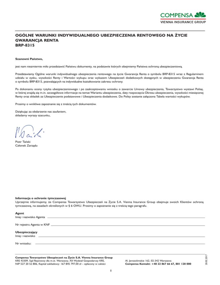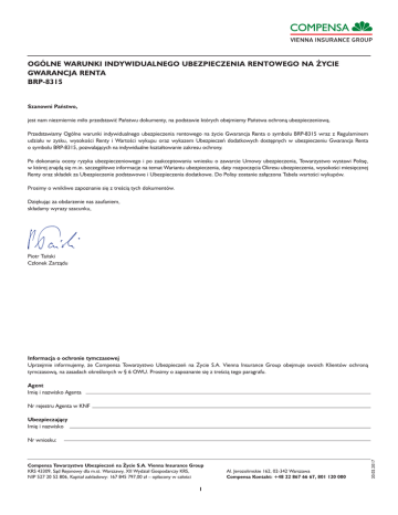 OGÓLNE WARUNKI INDYWIDUALNEGO UBEZPIECZENIA RENTOWEGO NA ŻYCIE GWARANCJA RENTA BRP-8315 Szanowni Państwo, jest nam niezmiernie miło przedstawić Państwu dokumenty, na podstawie których obejmiemy Państwa ochroną ubezpieczeniową. Przedstawiamy Ogólne warunki indywidualnego ubezpieczenia rentowego na życie Gwarancja Renta o symbolu BRP-8315 wraz z Regulaminem udziału w zysku, wysokości Renty i Wartości wykupu oraz wykazem Ubezpieczeń dodatkowych dostępnych w ubezpieczeniu Gwarancja Renta o symbolu BRP-8315, pozwalających na indywidualne kształtowanie zakresu ochrony. Po dokonaniu oceny ryzyka ubezpieczeniowego i po zaakceptowaniu wniosku o zawarcie Umowy ubezpieczenia, Towarzystwo wystawi Polisę, w której znajdą się m.in. szczegó∏owe informacje na temat Wariantu ubezpieczenia, daty rozpoczęcia Okresu ubezpieczenia, wysokości miesięcznej Renty oraz składek za Ubezpieczenie podstawowe i Ubezpieczenia dodatkowe. Do Polisy zostanie załączona Tabela wartości wykupów. Prosimy o wnikliwe zapoznanie się z treścią tych dokumentów. Dziękując za obdarzenie nas zaufaniem, sk∏adamy wyrazy szacunku, Piotr Tański Członek Zarządu Informacja o ochronie tymczasowej Uprzejmie informujemy, że Compensa Towarzystwo Ubezpieczeń na Życie S.A. Vienna Insurance Group obejmuje swoich Klientów ochroną tymczasową, na zasadach określonych w § 6 OWU. Prosimy o zapoznanie się z treścią tego paragrafu. Agent Imię i nazwisko Agenta Nr rejestru Agenta w KNF Ubezpieczający Imię i nazwisko Compensa Towarzystwo Ubezpieczeń na Życie S.A. Vienna Insurance Group KRS 43309, Sąd Rejonowy dla m.st. Warszawy, XII Wydzia∏ Gospodarczy KRS, NIP 527 20 52 806, Kapita∏ zak∏adowy: 167 845 797,00 z∏ – op∏acony w ca∏ości 1 Al. Jerozolimskie 162, 02-342 Warszawa Compensa Kontakt: +48 22 867 66 67, 801 120 000 20.02.2017 Nr wniosku: SPIS TREŚCI INFORMACJE DOTYCZĄCE OGÓLNYCH WARUNKÓW INDYWIDUALNEGO UBEZPIECZENIA RENTOWEGO NA ŻYCIE GWARANCJA RENTA O SYMBOLU BRP-8315 4 OGÓLNE WARUNKI INDYWIDUALNEGO UBEZPIECZENIA RENTOWEGO NA ŻYCIE GWARANCJA RENTA O SYMBOLU BRP-8315 5 Postanowienia ogólne 5 Definicje 5 Przedmiot ubezpieczenia 7 Zakres odpowiedzialności Towarzystwa 7 Początek i koniec odpowiedzialności Towarzystwa 7 Ochrona tymczasowa 7 Zasady zawarcia Umowy ubezpieczenia 8 Zasady wskazania Uposażonego do Renty i Uposażonych 9 Wysokość Renty, Składki regularnej i Wartość wykupu 10 Zasady opłacania Składek regularnych 10 Zasady opłacania Składek dodatkowych i zmiany Składek dodatkowych na Rentę 10 Skutki niezapłacenia Składki regularnej 11 Zmiany zakresu odpowiedzialności Towarzystwa, wysokości Renty i Składki regularnej 11 Indeksacja Składki regularnej i miesięcznej Renty 12 Udział w zysku z lokat aktywów stanowiących pokrycie rezerwy ubezpieczeń na życie 12 Wykup ubezpieczenia i zasady ustalania jego kwoty 13 Zasady zmiany Umowy ubezpieczenia ze Składką regularną na umowę ubezpieczenia bezskładkowego ze zredukowaną wysokością Renty i ograniczonym zakresem odpowiedzialności 14 Zasady zmiany umowy ubezpieczenia bezskładkowego ze zredukowaną wysokością Renty i ograniczonym zakresem odpowiedzialności na Umowę ubezpieczenia ze Składką regularną 14 Rozwiązanie Umowy ubezpieczenia 16 Odstąpienie od Umowy ubezpieczenia 16 Wypowiedzenie Umowy ubezpieczenia 16 Wznowienie Umowy ubezpieczenia 16 Wypłata Renty 18 Wypłata Świadczeń 19 Dochodzenie roszczeń wynikających z Umowy ubezpieczenia, składanie skarg i zażaleń przez Ubezpieczającego, Uposażonego lub osobę uprawnioną do Świadczenia niebędących osobą fizyczną 20 Dochodzenie roszczeń wynikających z Umowy ubezpieczenia, składanie reklamacji przez Ubezpieczającego, Ubezpieczonego, Uposażonego lub osobę uprawnioną do Świadczenia będących osobą fizyczną (w tym osobą fizyczną wykonującą działalność gospodarczą lub zawodową w ramach tzw. jednoosobowej działalności gospodarczej lub spółki cywilnej) 21 2 Dokonywanie zmian, zawiadomień i składanie oświadczeń 21 Informacja o wypłacalności i kondycji finansowej 22 Akty prawne stosowane w sprawach nieuregulowanych w OWU 22 Data wejścia w życie OWU 23 REGULAMIN UDZIAŁU W ZYSKU, WYSOKOŚCI RENTY I WARTOŚCI WYKUPU O SYMBOLU BRP-8315 24 Zastosowanie Regulaminu 24 Definicje pojęć 24 Zasady naliczania i wypłaty udziału w zysku w Okresie ubezpieczenia 24 Zasady naliczania i wypłaty udziału w zysku w Okresie wypłaty Renty 24 Minimalna Wartość wykupu ubezpieczenia oraz minimalna zredukowana wysokość Renty wymagane przy zmianie Umowy ubezpieczenia ze Składką regularną na umowę ubezpieczenia bezskładkowego ze zredukowaną wysokością Renty i ograniczonym zakresem odpowiedzialności 25 Wartość Stopy technicznej 25 Wejście Regulaminu w życie 25 ANEKS NR 1 DO OGÓLNYCH WARUNKÓW INDYWIDUALNEGO UBEZPIECZENIA RENTOWEGO NA ŻYCIE GWARANCJA RENTA O SYMBOLU BRP-8315 26 WYKAZ INDYWIDUALNYCH UBEZPIECZEŃ DODATKOWYCH DOSTĘPNYCH W UBEZPIECZENIU GWARANCJA RENTA O SYMBOLU BRP-8315 27 OŚWIADCZENIE DO WNIOSKU O ZAWARCIE UMOWY UBEZPIECZENIA GWARANCJA RENTA O SYMBOLU BRP-8315 29 3 INFORMACJE DOTYCZĄCE OGÓLNYCH WARUNKÓW INDYWIDUALNEGO UBEZPIECZENIA RENTOWEGO NA ŻYCIE GWARANCJA RENTA BRP-8315 Numer jednostki redakcyjnej z wzorca umownego Rodzaj informacji 1. Przesłanki wypłaty odszkodowania i innych świadczeń lub wartości wykupu ubezpieczenia § 2, § 4, § 6 ust. 1 i 4, § 16, § 19, § 21, § 23, § 24 2. Ograniczenia oraz wyłączenia odpowiedzialności zakładu ubezpieczeń uprawniające do odmowy wypłaty odszkodowania i innych świadczeń lub ich obniżenia § 2, § 6 ust. 5, § 7 ust. 6 i 8 4. Wartości wykupu ubezpieczenia w poszczególnych okresach trwania ochrony ubezpieczeniowej oraz okresu, w którym roszczenie o wypłatę wartości wykupu nie przysługuje § 11 ust. 5 pkt 2) i ust. 8 pkt 2), § 13 ust. 2 pkt 1) lit. b) i ust. 3 pkt 4), § 14, § 16 ust. 3, § 17 ust. 5 pkt 3)