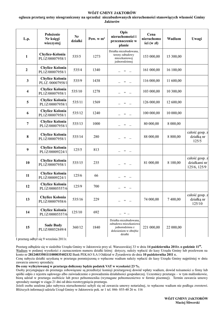 WÓJT GMINY JAKTORÓW ogłasza przetarg ustny nieograniczony na sprzedaż niezabudowanych nieruchomości stanowiących własność Gminy Jaktorów Pow. w m² Opis nieruchomości i przeznaczenie w planie Cena nieruchomo ści (w zł) Wadium Działka niezabudowana, tereny zabudowy mieszkaniowej jednorodzinnej 153 000,00 15 300,00 L.p. Położenie Nr księgi wieczystej 1 Chylice-Kolonia PL1Z/00007958/1 535/5 1273 2 Chylice Kolonia PL1Z/00007958/1 535/4 1340 _ „ _ 161 000,00 16 100,00 3 Chylice Kolonia PL1Z /00007958/1 535/9 1438 _ „ _ 116 000,00 11 600,00 4 Chylice Kolonia PL1Z/00007958/1 535/10 1278 _ „ _ 103 000,00 10 300,00 5 Chylice Kolonia PL1Z/00007958/1 535/11 1569 _ „ _ 126 000,00 12 600,00 6 Chylice Kolonia PL1Z/00007958/1 535/12 1240 _ „ _ 100 000,00 10 000,00 7 Chylice Kolonia PL1Z/00007958/1 535/13 1000 _ „ _ 80 000,00 8 000,00 8 Chylice Kolonia PL1Z/00007958/1 535/14 280 _ „ _ 88 000,00 8 800,00 całość gosp. z działką nr 125/5 9 Chylice Kolonia PL1Z/00009224/1 125/5 813 _ „ _ 10 Chylice Kolonia PL1Z/00007958/1 535/15 235 _ „ _ 81 000,00 8 100,00 całość gosp. z działkami nr 125/6, 125/9 11 Chylice Kolonia PL1Z/00009224/1 125/6 66 _ „ _ 12 Chylice Kolonia PL1Z/00005557/6 125/9 700 _ „ _ 13 Chylice Kolonia PL1Z/00007958/6 535/16 229 _ „ _ 74 000,00 7 400,00 całość gosp. z działką nr 125/10 14 Chylice Kolonia PL1Z/00005557/6 125/10 692 _ „ _ 15 Sade Budy PL1Z/00052849/4 1840 Działka niezabudowana, zabudowa mieszkaniowa jednorodzinna z dolesieniem w obrębie działki 221 000,00 22 000,00 Nr działki 360/12 Uwagi I przetarg odbył się 9 września 2011r. Przetarg odbędzie się w siedzibie Urzędu Gminy w Jaktorowie przy ul. Warszawskiej 33 w dniu 14 października 2011r. o godzinie 1100. Wadium w podanej wysokości z zaznaczeniem numeru działki której dotyczy, należy wpłacić do kasy Urzędu Gminy lub przelewem na konto nr 28124033501111000035402132 Bank PEKAO S.A I Oddział w Żyrardowie do dnia 10 października 2011 r.. Cenę nabycia działki uzyskaną w przetargu pomniejszoną o wpłacone wadium należy wpłacić do kasy Urzędu Gminy najpóźniej w dniu zawarcia umowy sprzedaży. Do ceny wylicytowanej w przetargu doliczony będzie podatek VAT w wysokości 23 %. Osoby przystępujące do przetargu zobowiązane są przedłożyć komisji przetargowej dowód wpłaty wadium, dowód tożsamości a firmy lub spółki odpis z rejestru sądowego albo zaświadczenie o prowadzeniu działalności gospodarczej. Uczestnicy przetargu – w tym małżonkowie, biorą udział w przetargu osobiście lub przez pełnomocnika (wymagane pełnomocnictwo w formie pisemnej). Termin zawarcia umowy sprzedaży nastąpi w ciągu 21 dni od dnia rozstrzygnięcia przetargu. Jeżeli osoba ustalona jako nabywca nieruchomości uchyli się od zawarcia umowy notarialnej, to wpłacone wadium nie podlega zwrotowi. Bliższych informacji udziela Urząd Gminy w Jaktorowie pok. nr 1 tel. 046- 855-40 26 w. 116 WÓJT GMINY JAKTORÓW Maciej Śliwerski