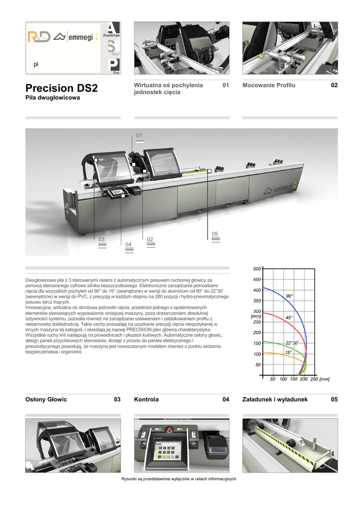 pl Wirtualna oś pochylenia jednostek cięcia Precision DS2 Piła dwugłowicowa 01 Mocowanie Profilu 02 Załadunek i wyładunek 05 01 05 02 03 04 Dwugłowicowa piła z 3 sterowanymi osiami z automatycznym posuwem ruchomej głowicy za pomocą sterowanego cyfrowo silnika bezszczotkowego. Elektroniczne zarządzanie jednostkami cięcia dla wszystkich pochyleń od 90° do 15° (zewnętrzne) w wersji do aluminium od 90° do 22°30’ (wewnętrzne) w wersji do PVC, z precyzją w każdym stopniu na 280 pozycji i hydro-pneumatycznego posuwu tarcz tnących. Innowacyjna, wirtualna oś obrotowa jednostki cięcia, przedmiot jednego z opatentowanych elementów stanowiących wyposażenie niniejszej maszyny, poza dostarczeniem absolutnej sztywności systemu, pozwala również na zarządzanie ustawieniem i zablokowaniem profilu z niesamowitą dokładnością. Takie cechy pozwalają na uzyskanie precyzji cięcia niespotykanej w innych maszyna tej kategorii, i określają jej nazwę PRECISION jako główna charakterystyka. Wszystkie ruchy linii następują na prowadnicach i płozach kulowych. Automatyczne osłony głowic, design paneli przyciskowych sterowania, dostęp z przodu do panela elektrycznego i pneumatycznego powodują, że maszyna jest nowoczesnym modelem również z punktu widzenia bezpieczeństwa i ergonomii. Osłony Głowic 03 Kontrola 04 Rysunki są przedstawione wyłącznie w celach informacyjnych Precision DS2 Dwugłowicowa obcinarka elektroniczna z przednim ostrzem 01 02 03 04 05 Wirtualna oś pochylenia jednostek cięcia Blokowanie profilu Osłony Głowic Kontrola Załadunek i wyładunek Pochylenie każdej głowicy, do 15° na zewnątrz w wersji aluminiowej i 22°30’ do wewnątrz w wersji PVC, następuje za pomocą dwóch obrotowych prowadnic umieszczonych na czterech parach stalowych kółek. Takie opatentowane rozwiązanie pozwala na usunięcie jakiejkolwiek przeszkody ze strefy cięcia, gwarantując wszystkie zalety związane z ustawieniem i zablokowaniem profilu oraz oferuje sztywność wyższą niż w tradycyjnych systemach. Ustawianie za pomocą taśmy magnetycznej z odczytem absolutnym eliminuje konieczność wykonywania wzorcowania osi. Mocowanie profilu do cięcia następuje w niesamowicie precyzyjny i bezpieczny sposób za pomocą dwóch poziomych siłowników. W razie konieczności pionowego mocowania jest dostępny opatentowany system poziomych siłowników z funkcja pionowego docisku. Maszyna może być wyposażona w unikalny system DIGICLAMP (opcja), który w łatwy i czytelny sposób informuje operatora jak ustawić mocowania i nie pozwala na uruchomienie piły jeżeli mocowania są w konflikcie z tarczą. Automatyczne miejscowe osłony głowic, wykonane z poliwęglanu odpornego na zarysowania są uruchamiane za pomocą siłownika pneumatycznego z urządzeniem zapobiegającym przygnieceniu, które zeruje ładunek pneumatyczny na etapie zamykania. Są zamontowane na bocznie przesuwanym systemie, aby jak najlepiej zabezpieczyć operatora podczas każdej czynności cięcia. Panel kontrolny, ergonomiczny i ekstremalnie zaawansowany, używa wyświetlacza dotykowego 10,4” i oprogramowania o własnych ustawieniach oraz bogatego w funkcje stworzone dla tej maszyny, w środowisku Microsoft Windows®. Dzięki tworzeniu list cięcia jest optymalizowany cykl roboczy, pozwalając na redukcję odpadów i zmniejszenie czasów faz załadunku-wyładunku elementów. Maszyna Precision może być wyposażona w podajnik rolkowy umieszczony na ruchomej głowicy, do załadunku i wyładunku typu standard lub na głowicy stałej do załadunku z lewej strony. Pneumatyczny siłownik na podajniku służy do łatwego ustawienia i mocowania profilu. ALUMINIUM PVC WŁAŚCIWOŚCI MASZYNY ● Elektroniczna kontrola osi X Prędkość pozycjonowania osi X standard 25 m/min Odczytanie pozycji ruchomej głowicy za pomocą systemu bezpośredniego pomiaru z absolutnym pasmem magnetycznym ● Odczytanie pochylenia ruchomej głowicy za pomocą systemu bezpośredniego pomiaru z absolutnym pasmem magnetycznym ● Kontrola elektroniczna pochyleń pośrednich ● Max pochylenie zewnętrzne (wersja z aluminium) 15° Max pochylenie wewnętrzne (wersja z PVC) 22°30’ ● Posuw ostrzy olejowo-pneumatyczny Cięcie użyteczne, zgodne z modelem (m) 5/6 Ostrza widiowe 2 Średnica ostrza 550 Moc silnika ostrza (kW) 2,2 Elektroniczny miernik grubości profilu (w wersji aluminium) ○ ZABEZPIECZENIA I OSŁONY Miejscowa osłona przednia z napędem pneumatycznym ● USTAWIENIE I ZABLOKOWANIE PROFILU Para poziomych zacisków pneumatycznych z urządzeniem “niskiego ciśnienia” ● Para pionowych zacisków z pionowym zamocowaniem ○ Para dodatkowych poziomych zacisków ○ Pośredni wspornik mechaniczny profilu ● Przenośnik rolkowy na ruchomej głowicy z mechanicznymi wspornikami profilu ○ Przenośnik rolkowy wspornika profilu na stałej głowicy do wejścia profilu z lw, z mechanicznymi wspornikami profilu ○ Pneumatyczny ogranicznik odniesienia na ruchomej głowicy do wejścia profilu z lw ○ ● włączone ○ dostępne 2012/04/01 Rysunki są przedstawione wyłącznie w celach informacyjnych www.randdtech.pl