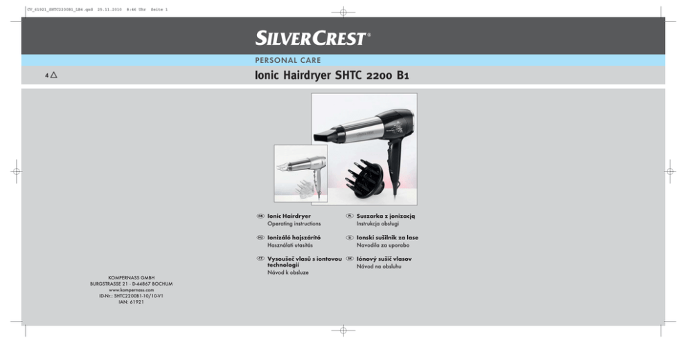 CV_61921_SHTC2200B1_LB4.qxd 25.11.2010 8:46 Uhr Seite 1 PERSONAL CARE Ionic Hairdryer SHTC 2200 B1 4 KOMPERNASS GMBH BURGSTRASSE 21 · D-44867 BOCHUM www.kompernass.com ID-Nr.: SHTC2200B1-10/10-V1 IAN: 61921 Ionic Hairdryer Operating instructions Suszarka z jonizacją Instrukcja obsługi Ionizáló hajszárító Használati utasítás Ionski sušilnik za lase Navodila za uporabo Vysoušeč vlasů s iontovou technologií Návod k obsluze Iónový sušič vlasov Návod na obsluhu CV_61921_SHTC2200B1_LB4.qxd 25.11.2010 8:46 Uhr Seite 4 SHTC 2200 B1 2 1 7 6 5 4 3 8 IB_61921_SHTC2200B1_LB4 01.12.2010 15:14 Uhr Content Seite 1 Page Safety information 2 Intended use 3 Items supplied 3 Appliance description 3 Operation 3 Heat and blower levels . . . . . . . . . . . . . . . . . . . . . . . . . . . . . . . . . . . . . . . . . . . . . . . . . . . . . . .3 Cool level . . . . . . . . . . . . . . . . . . . . . . . . . . . . . . . . . . . . . . . . . . . . . . . . . . . . . . . . . . . . . . . . . .4 Ionic Function . . . . . . . . . . . . . . . . . . . . . . . . . . . . . . . . . . . . . . . . . . . . . . . . . . . . . . . . . . . . . . .4 Drying and styling hair 4 Cleaning 4 Troubleshooting 5 Disposal 5 Technical data 6 Warranty and Service 6 Importer 6 Read the operating instructions carefully before using the appliance for the first time and preserve this booklet for later reference. Pass the manual on to whomsoever might acquire the appliance at a later date. -1- IB_61921_SHTC2200B1_LB4 01.12.2010 15:14 Uhr Ionic Hairdryer Seite 2 • Do not pinch or squeeze the power cable and lay it in such a way that no one can tread on or trip over it. • Do not use extension cables. • Never touch or handle the Professional Hair Dryer, the power cale or plug with wet hands. • Immediately separate the Professional Hair Dryer from the power source after use. The appliance is completely free of electrical power only when you unplug it . • You are not permitted to open the housing of the Professional Hair Dryer or carry out repairs to it. Should you do so, the safety of the appliance may be compromised and the warranty becomes void. Only permit the Professional Hair Dryer to be serviced and repaired by authorised specialists. Safety information Risk of electrocution! • Connect the hair dryer only to a correctly installed wall power socket providing electrical energy at the level detailed on the rating plate. • Under no circumstances may the Professional Hair Dryer be submerged in fluids, or fluids be permitted to enter the housing of the Professional Hair Dryer. Do not expose the appliance to humidity and do not use it outdoors. Should liquids enter the housing, unplug the appliance from the power socket immediately and arrange for it to be repaired by a qualified technician. Risk of fire and burns • This appliance is not intended for use by individuals (including children) with restricted physical, physiological or intellectual abilities or deficiences in experience and/or knowledge unless they are supervised by a person responsible for their safety or receive from this person instruction in how the appliance is to be used. Children should be supervised to ensure that they do not play with the appliance. • When it is switched on, never lay the Professional Hair Dryer down or leave it unsupervised. • Never place the Professional Hair Dryer close to sources of heat and protect the power cable against potential damage. • Should the Professional Hair Dryer be dropped or otherwise sustain damage, it may no longer be used. Arrange for the appliance to be checked and, if necessary, repaired by qualified technicians. • Do not cover the ventilation grill when using the appliance. Clean it at regular intervals. • The Professional Hair Dryer becomes hot during use. Hold it only by the grip when it is hot. Never use the appliance near water, particularly not near sinks, baths or other vessels. The proximity of moisture presents a risk, even when the appliance is switched off. After use, always remove the plug from the power socket. As additional protection, the installation of a faulty-current protection unit with an activation power rating of not more than 30 mA is recommended for the power circuit in the bathroom. Ask your electrician for advice. • Remove the plug of the Professional Hair Dryer from the power socket in the event of functional irregularity and before cleaning the appliance. • To disconnect, pull only on the plug itself, not on the cable. • Do not wrap the power cable around the Professional Hair Dryer and protect it from damage. • Should the power supply cable of this appliance become damaged, to avoid risks it must be replaced by the manufacturer, his Customer Service or a similarly qualified person. -2- IB_61921_SHTC2200B1_LB4 01.12.2010 15:14 Uhr Intended use Operation The Professional Hair Dryer is intended only for the drying and shaping of human hair, under no circumstances is it to be used for wigs and hairpieces made of synthetic material. You may use it exclusively in domestic households. Pay heed to all of the information in this operating manual, especially the safety instructions. This appliance is not designed for use in commercial or industrial applications. Heat and blower levels ➪ Insert the plug into a wall socket. ➪ Switch the hair dryer on with the blower level switch t. The hair dryer is fitted with two function switches. With these you can separately select the strength of the air flow (Blower switch t) and the level of heat (Heat level switch y): Items supplied • • • • Seite 3 Blower levels 0/ The hair dryer is switched off 1/ reduced air flow 2/ full power air flow Ionic Hairdryer Styling Jet Finger Diffusor Operating Instructions Heat levels 1/ Cold air flow 2/ Low heating level 3/ High heating level Appliance description q Concentrator w Air suction grill e Suspension hook r Ion switch t Blower level switch (2 levels) y Heat level switch (3 