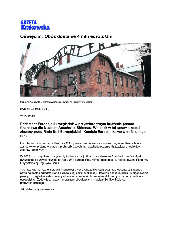 Oświęcim: Obóz dostanie 4 mln euro z Unii Muzeum Auschwitz-Birkenau wymaga renowacji (© Przemysław Malisz) Ewelina Żebrak, (PAP) 2010-12-15 Parlament Europejski uwzględnił w przyszłorocznym budżecie pomoc finansową dla Muzeum Auschwitz-Birkenau. Wniosek w tej sprawie został złożony przez Radę Unii Europejskiej i Komisję Europejską we wrześniu tego roku. Uwzględniona w budżecie Unii na 2011 r. pomoc finansowa wynosi 4 miliony euro. Kwota ta ma zostać wykorzystana w ciągu trzech najbliższych lat na zabezpieczenie niszczejących obiektów, zbiorów i archiwum. W 2009 roku z apelem o zajęcie się trudną sytuacją finansową Muzeum Auschwitz zwrócił się do ówczesnego przewodniczącego Rady Unii Europejskiej, Mirka Topolanka, eurodeputowany Platformy Obywatelskiej Bogusław Sonik. - Sprawa dramatycznej sytuacji finansowej byłego Obozu Koncentracyjnego Auschwitz-Birkenau powinna zostać przedstawiona europejskiej opinii publicznej. Ratowanie tego miejsca i pielęgnowanie pamięci o zagładzie setek tysięcy obywateli europejskich i mordzie dokonanym na ponad milionie europejskich Żydów jest naszym moralnym obowiązkiem - napisał Sonik w liście do przewodniczącego. Jak widać osiągnął sukces.
