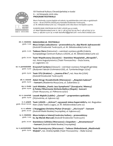 XX Festiwal Kultury Chrześcijańskiej w Łodzi 6 – 20 listopada 2016 roku PROGRAM FESTIWALU Biuro Festiwalu czynne będzie od soboty 29 października 2016 roku w godzinach 10.00 – 18.00 (TEATR LOGOS przy Kościele Środowisk Twórczych, ul. M. Skłodowskiej-Curie 22). 1 listopada 2016 roku biuro nie będzie czynne. EUROPEJSKIE CENTRUM KULTURY LOGOS 90-571 Łódź, ul. Marii Skłodowskiej-Curie 22 tel. (+ 48 42) 637 65 45; fax (+ 48 42) 637 37 31 kom. (+ 48) 601 25 61 29 e-mail: [email protected] www.fkch.wlodzi.com 06. 11. niedziela godz. 11.00 INAUGURACJA FESTIWALU Msza święta zaduszkowa – przewodniczy ks. abp Marek Jędraszewski (Kościół Środowisk Twórczych, ul. M. Skłodowskiej-Curie 22) godz. 12.00 Tadeusz Siara (Katowice) – wernisaż wystawy grafik (Galeria Europejskiego Centrum Kultury LOGOS, ul. M. Skłodowskiej-Curie 22) godz. 20.00 Teatr Współczesny (Szczecin) – Stanisław Wyspiański „Akropolis”, reż. Anna Augustynowicz (Teatr Powszechny – Duża Scena, ul. Legionów 21) 07. 11. poniedziałek godz. 13.00 Krzysztof Gardyna (Cieszyn) – wernisaż wystawy fotografii górskiej (Budynek Fabryki Grohmana ŁSSE, ul. Tymienieckiego 22/24) godz. 19.00 Teatr STU (Kraków) – „Joanna d’Arc”, reż. Noa Ain (USA) (Kościół Środowisk Twórczych) 08. 11. wtorek godz. 19.00 Adam Strug i Kwadrofonik (Warszawa) – „Requiem ludowe” – koncert (Akademia Muzyczna, ul. Żubardzka 2) 09. 11. środa godz. 19.00 Lech Wieleba „Poetic Jazz Symphonic” (Szwajcaria / Niemcy) & Polska Filharmonia Sinfonia Baltica (Słupsk) - koncert (Teatr Muzyczny, ul. Północna 47/51) 10. 11. czwartek godz. 19.00 11. 11. piątek godz. 18.00 i 20.00 12. 11. sobota godz. 20.00 13. 11. niedziela godz. 11.00 godz. 20.00 14. 11. poniedziałek godz. 19.00 Leszek Mądzik (Lublin) - „Gorset” – prapremiera spektaklu (Wytwórnia, ul. Łąkowa 29) Teatr LOGOS – „Schron”, wg poezji Julesa Supervielle’a, reż. Bogusław Kierc (Sala Teatru Logos, ul. M. Skłodowskiej-Curie 22) L’Arpeggiata Christina Pluhar (Francja) – „Via Crucis” – koncert (Kościół Matki Boskiej Zwycięskiej, ul. Łąkowa 42) Msza święta w intencji twórców kultury – przewodniczy ks. bp Marek Marczak (Kościół Środowisk Twórczych) Stanisława Celińska (Warszawa) z Zespołem – „Atramentowa” – koncert (Kościół Matki Boskiej Zwycięskiej) Teatr Dramatyczny (Warszawa) – Tadeusz Słobodzianek „Niedźwiedź Wojtek”, reż. Ondrej Spišăk (Teatr Powszechny – Mała Scena) 15. 11. wtorek godz. 19.00 16. 11. środa godz. 19.00 17. 11. czwartek godz. 19.00 Hanka Rybka z Zespołem (Podhale) – koncert muzyki góralskiej (Zespół Szkół Salezjańskich, ul. Wodna 34) Marek Dyżewski (Wrocław) – „W kręgu chorału protestanckiego” – konferencja (Kościół Środowisk Twórczych) Rozalia Kierc (Wrocław) – koncert fortepianowy (Kościół Środowisk Twórczych) 18. 11. piątek godz. 19.00 Joseph Tawadros (wirtuoz oud, Egipt / Australia), Tamar Halperin (fortepian, Izrael), Valeriy Sokolov (skrzypce, Ukraina), Morphing Chamber Orchestra (Austria) – koncert (Wytwórnia) 19. 11. sobota godz. 19.00 Teatr Miniatura (Gdańsk) – „Remus” wg „Życia i przygód Remusa” Aleksandra Majkowskiego, reż. Remigiusz Brzyk (Teatr Powszechny – Duża Scena) 20. 11. niedziela godz. 11.00 godz. 20.00 Msza święta dziękczynna – przewodniczy ks. bp Adam Lepa (Kościół Środowisk Twórczych) ZAKOŃCZENIE FESTIWALU The Tallis Scholars (Wielka Brytania) – koncert (Kościół Matki Boskiej Zwycięskiej)