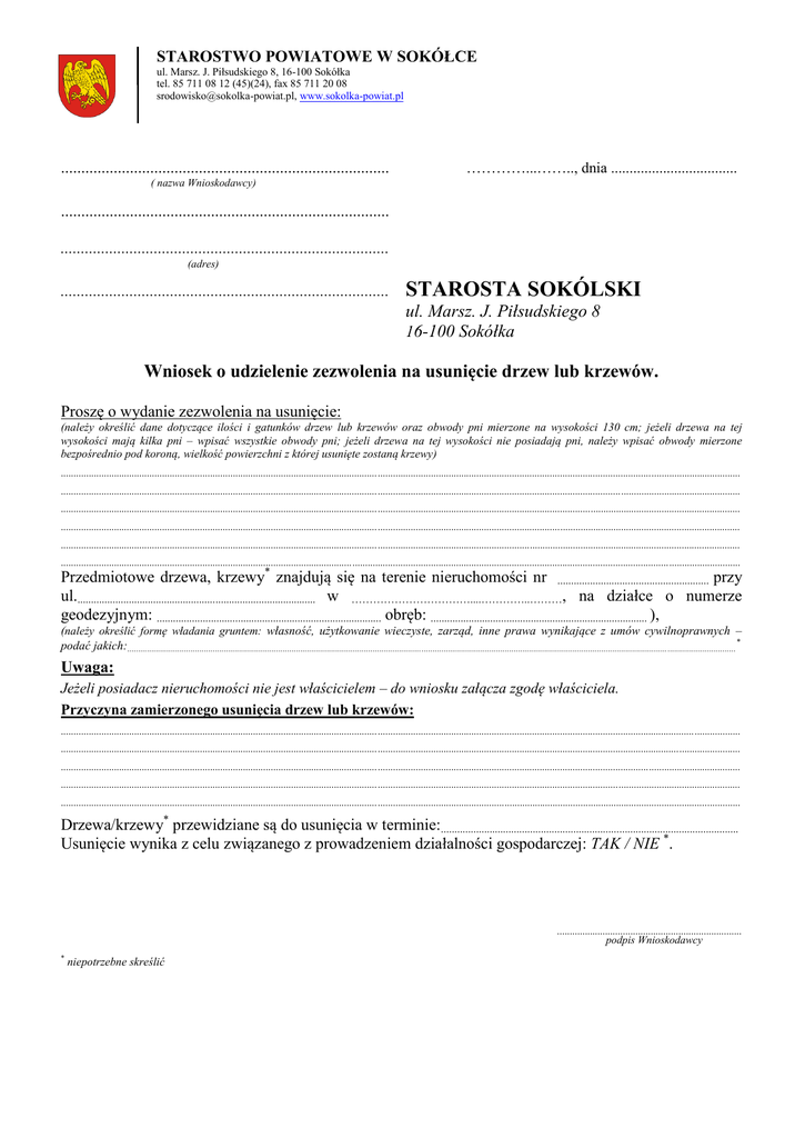 STAROSTWO POWIATOWE W SOKÓŁCE ul. Marsz. J. Piłsudskiego 8, 16-100 Sokółka tel. 85 711 08 12 (45)(24), fax 85 711 20 08 [email protected], www.sokolka-powiat.pl ................................................................................. …………...…….., dnia .................................. ( nazwa Wnioskodawcy) ................................................................................. ................................................................................. (adres) ................................................................................. STAROSTA SOKÓLSKI ul. Marsz. J. Piłsudskiego 8 16-100 Sokółka Wniosek o udzielenie zezwolenia na usunięcie drzew lub krzewów. Proszę o wydanie zezwolenia na usunięcie: (należy określić dane dotyczące ilości i gatunków drzew lub krzewów oraz obwody pni mierzone na wysokości 130 cm; jeżeli drzewa na tej wysokości mają kilka pni – wpisać wszystkie obwody pni; jeżeli drzewa na tej wysokości nie posiadają pni, należy wpisać obwody mierzone bezpośrednio pod koroną, wielkość powierzchni z której usunięte zostaną krzewy) ............................................................................................................................................................................................................................................................................ ............................................................................................................................................................................................................................................................................ ............................................................................................................................................................................................................................................................................ ............................................................................................................................................................................................................................................................................ ............................................................................................................................................................................................................................................................................ ............................................................................................................................................................................................................................................................................ Przedmiotowe drzewa, krzewy* znajdują się na terenie nieruchomości nr ........................................................ przy ul......................................................................................... w ……………………………....…………..………, na działce o numerze geodezyjnym: ................................................................................... obręb: ................................................................................ ), (należy określić formę władania gruntem: własność, użytkowanie wieczyste, zarząd, inne prawa wynikające z umów cywilnoprawnych – podać jakich:.....................................................................................................................................................................................................................................................................................* Uwaga: Jeżeli posiadacz nieruchomości nie jest właścicielem – do wniosku załącza zgodę właściciela. Przyczyna zamierzonego usunięcia drzew lub krzewów: ............................................................................................................................................................................................................................................................................ ............................................................................................................................................................................................................................................................................ ............................................................................................................................................................................................................................................................................ ............................................................................................................................................................................................................................................................................ ............................................................................................................................................................................................................................................................................ Drzewa/krzewy* przewidziane są do usunięcia w terminie:.............................................................................................................. Usunięcie wynika z celu związanego z prowadzeniem działalności gospodarczej: TAK / NIE *. ......................................................................... podpis Wnioskodawcy * niepotrzebne skreślić STAROSTWO POWIATOWE W SOKÓŁCE ul. Marsz. J. Piłsudskiego 8, 16-100 Sokółka tel. 85 711 08 12 (45)(24), fax 85 711 20 08 [email protected], www.sokolka-powiat.pl Do wniosku należy obowiązkowo dołączyć: oświadczenie o posiadanym tytule prawnym władania nieruchomością albo oświadczenie o posiadanym prawie własności urządzeń, o których mowa w art. 49 § 1 Kodeksu cywilnego; pełnomocnictwo (wyma