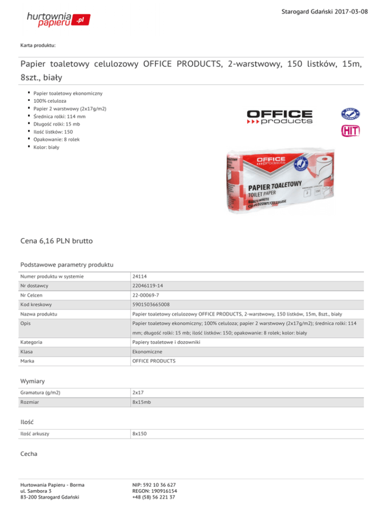 Starogard Gdański 2017-03-08 Karta produktu: Papier toaletowy celulozowy OFFICE PRODUCTS, 2-warstwowy, 150 listków, 15m, 8szt., biały Papier toaletowy ekonomiczny 100% celuloza Papier 2 warstwowy (2x17g/m2) Średnica rolki: 114 mm Długość rolki: 15 mb Ilość listków: 150 Opakowanie: 8 rolek Kolor: biały Cena 6,16 PLN brutto Podstawowe parametry produktu Numer produktu w systemie 24114 Nr dostawcy 22046119-14 Nr Celcen 22-00069-7 Kod kreskowy 5901503665008 Nazwa produktu Papier toaletowy celulozowy OFFICE PRODUCTS, 2-warstwowy, 150 listków, 15m, 8szt., biały Opis Papier toaletowy ekonomiczny; 100% celuloza; papier 2 warstwowy (2x17g/m2); średnica rolki: 114 mm; długość rolki: 15 mb; ilość listków: 150; opakowanie: 8 rolek; kolor: biały Kategoria Papiery toaletowe i dozowniki Klasa Ekonomiczne Marka OFFICE PRODUCTS Wymiary Gramatura (g/m2) 2x17 Rozmiar 8x15mb Ilość Ilość arkuszy 8x150 Cecha Hurtowania Papieru - Borma ul. Sambora 3 83-200 Starogard Gdański NIP: 592 10 36 627 REGON: 190916154 +48 (58) 56 221 37 Starogard Gdański 2017-03-08 Karta katalogowa produktu cd. Papier toaletowy celulozowy OFFICE PRODUCTS, 2-warstwowy, 150 listków, 15m, 8szt., biały W ofercie od 2015-01 Typ 2-warstwowy Produkt Papier toaletowy Wspólny słownik zamówień CPV 33761000-2 Certyfikaty Nowy produkt w ofercie Standard Hit Standard Kolor Kolor Biały Serdecznie zapraszamy do współpracy Hurtowania Papieru - Borma zespół. Hurtowania Papieru - Borma ul. Sambora 3 83-200 Starogard Gdański NIP: 592 10 36 627 REGON: 190916154 +48 (58) 56 221 37