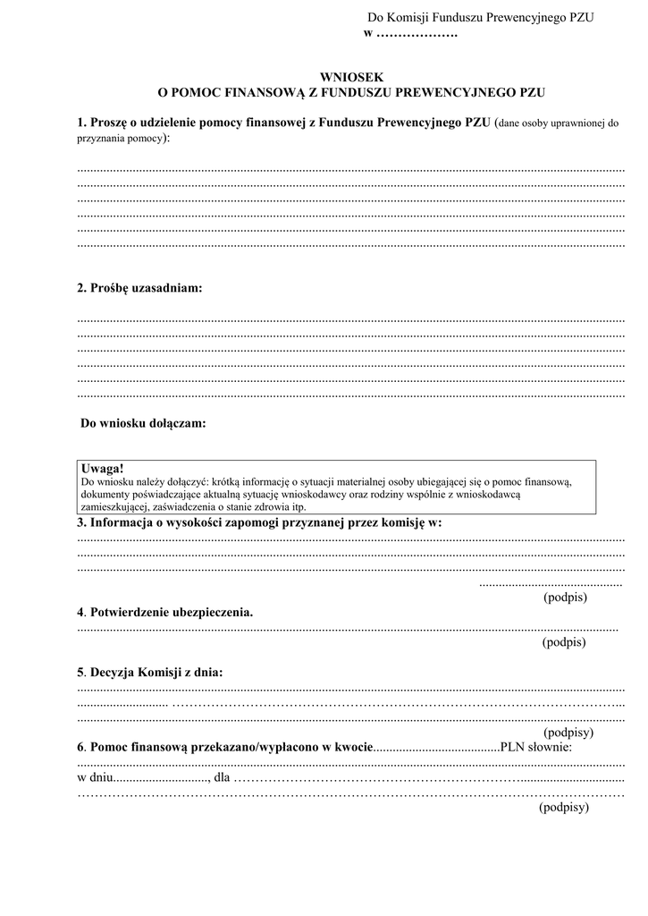 Do Komisji Funduszu Prewencyjnego PZU w ………………. WNIOSEK O POMOC FINANSOWĄ Z FUNDUSZU PREWENCYJNEGO PZU 1. Proszę o udzielenie pomocy finansowej z Funduszu Prewencyjnego PZU (dane osoby uprawnionej do przyznania pomocy): ........................................................................................................................................................................ ........................................................................................................................................................................ ........................................................................................................................................................................ ........................................................................................................................................................................ ........................................................................................................................................................................ ........................................................................................................................................................................ 2. Prośbę uzasadniam: ........................................................................................................................................................................ ........................................................................................................................................................................ ........................................................................................................................................................................ ........................................................................................................................................................................ ........................................................................................................................................................................ ........................................................................................................................................................................ Do wniosku dołączam: Uwaga! Do wniosku należy dołączyć: krótką informację o sytuacji materialnej osoby ubiegającej się o pomoc finansową, dokumenty poświadczające aktualną sytuację wnioskodawcy oraz rodziny wspólnie z wnioskodawcą zamieszkującej, zaświadczenia o stanie zdrowia itp. 3. Informacja o wysokości zapomogi przyznanej przez komisję w: ........................................................................................................................................................................ ........................................................................................................................................................................ ........................................................................................................................................................................ ............................................ (podpis) 4. Potwierdzenie ubezpieczenia. ...................................................................................................................................................................... (podpis) 5. Decyzja Komisji z dnia: ........................................................................................................................................................................ ............................ …………………………………………………………………………………………... ........................................................................................................................................................................ (podpisy) 6. Pomoc finansową przekazano/wypłacono w kwocie.......................................PLN słownie: ........................................................................................................................................................................ w dniu............................., dla …………………………………………………………................................ ……………………………………………………………………………………………………………… (podpisy) WYWIAD RODZINNY Oświadczenia o dochodach rodziny, osoby występującej z wnioskiem o przyznanie świadczenia Nazwisko i imię zainteresowanego ………………………………………………………………. Adres i telefon: ……………………………………………………………………………………………. Struktura rodziny: Rodzina moja składa się z następujących osób wspólnie ze mną zamieszkujących i pozostających we wspólnym gospodarstwie domowym. Lp Członek rodziny Nazwisko imię Stopień Data urodzenia pokrewieństwa dziecka Zakład pracy małżonka. Nazwa szkoły dziecka Informacja o dochodach: Moim stałym dochodem jest wynagrodzenie netto w wysokości wg zaświadczenia ……………zł Osiągam dodatkowe dochody z tytułu: …………………………………………………………… w wysokości …………………………………………………..zł. .Dochód współmałżonka wg zaświadczenia ……………………………………………….zł Dochód członków rodziny (podać nazwisko i imię i wysokość dochodów netto) ……………………………………………………………………………………………………… ……………………………………………………………………………………………………… (należy podać jakie i w jakiej wysokości np. stypendia, zasiłki rodzinne, pielęgnacyjne, świadczenia alimentacyjne, renta rodzinna) Dochody z gospodarstwa 