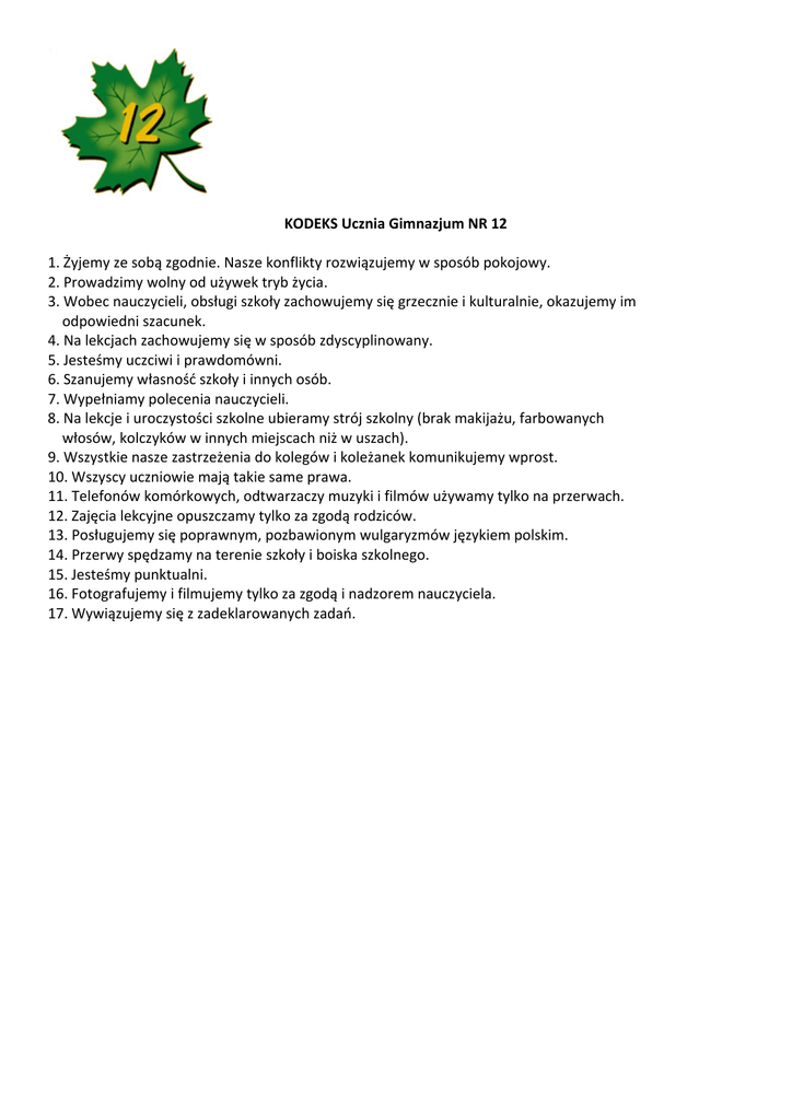 KODEKS Ucznia Gimnazjum NR 12 1. Żyjemy ze sobą zgodnie. Nasze konflikty rozwiązujemy w sposób pokojowy. 2. Prowadzimy wolny od używek tryb życia. 3. Wobec nauczycieli, obsługi szkoły zachowujemy się grzecznie i kulturalnie, okazujemy im odpowiedni szacunek. 4. Na lekcjach zachowujemy się w sposób zdyscyplinowany. 5. Jesteśmy uczciwi i prawdomówni. 6. Szanujemy własność szkoły i innych osób. 7. Wypełniamy polecenia nauczycieli. 8. Na lekcje i uroczystości szkolne ubieramy strój szkolny (brak makijażu, farbowanych włosów, kolczyków w innych miejscach niż w uszach). 9. Wszystkie nasze zastrzeżenia do kolegów i koleżanek komunikujemy wprost. 10. Wszyscy uczniowie mają takie same prawa. 11. Telefonów komórkowych, odtwarzaczy muzyki i filmów używamy tylko na przerwach. 12. Zajęcia lekcyjne opuszczamy tylko za zgodą rodziców. 13. Posługujemy się poprawnym, pozbawionym wulgaryzmów językiem polskim. 14. Przerwy spędzamy na terenie szkoły i boiska szkolnego. 15. Jesteśmy punktualni. 16. Fotografujemy i filmujemy tylko za zgodą i nadzorem nauczyciela. 17. Wywiązujemy się z zadeklarowanych zadań.