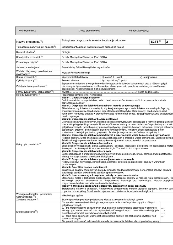 Rok akademicki: Grupa przedmiotów: Nazwa przedmiotu1): Biologiczne oczyszczanie ścieków i utylizacja odpadów Tłumaczenie nazwy na jęz. angielski3): Biological purification of wastewaters and disposal of wastes 4) Kierunek studiów : ECTS 2) 2 Biologia 5) Koordynator przedmiotu : Dr hab. Mieczysław Błaszczyk, Prof. SGGW Prowadzący zajęcia6): Dr hab. Mieczysław Błaszczyk, Prof. SGGW 7) Jednostka realizująca : Wydział, dla którego przedmiot jest realizowany8): Status przedmiotu9): Cykl dydaktyczny10): Założenia i cele przedmiotu12): Formy dydaktyczne, liczba godzin13): Metody dydaktyczne14): Pełny opis przedmiotu15): Wymagania formalne (przedmioty wprowadzające)16): Założenia wstępne17): Efekty kształcenia18): Numer katalogowy: Samodzielny Zakład Biologii Mikroorganizmów Wydział Rolnictwa i Biologii a) przedmiot fakultatywny b) stopień II rok II c) stacjonarne Semestr zimowy Jęz. wykładowy11): polski Zapoznanie studentów z różnymi metodami oczyszczania ścieków komunalnych oraz z różnych gałęzi bioprzemysłu i przemysłu oraz problemami po ich oczyszczeniu: problemy nadmiernych osadów oraz pozostałości. Koszty związane z ich oczyszczaniem. Wykład…………………………………………………………………………...; liczba godzin ..30h...; Prezentacje komputerowe, Konsultacje Moduł 1. Charakterystyka ścieków Definicja ścieków, rodzaje ścieków, skład chemiczny ścieków, konieczność ich oczyszczania, metody oczyszczania ścieków Moduł 2. Oczyszczanie ścieków komunalnych metodą osadu czynnego Skład chemiczny ścieków komunalnych, trzy kolejne etapy oczyszczania ścieków komunalnych: fizyczny, chemiczny i biologiczny. Osad czynny, jego skład i charakterystyka. Osad surowy, osad czynny i osad nadmierny. Produkcja biogazu w procesie utylizacji nadmiernego osadu. Zagospodarowywanie pozostałości osadu czynnego. Moduł 3. Oczyszczanie ścieków bioprzemysłowych Definicja ścieków przemysłowych. Rodzaje ścieków przemysłowych: pochodzące z różnych gałęzi przemysłu oraz z różnych gałęzi bioprzemysłu. Nowe współczesne metody oczyszczania ścieków pochodzących z różn gałęzi bioprzemysłu (szeroko pojęty przemysł spożywczy, gorzelnie, browary, cukrownie, przemysł celulozow papierniczy, przemysł ziemniaczany, przemysł farmaceutyczny, rolnictwo, ścieki pochodzące z ferm hodowlanych takie jak gnojowica, gnojówka). Produkcja biogazu ze ścieków bioprzemysłowych. Moduł 4. Oczyszczanie ścieków pochodzących z przetwarzania węgla kamiennego i ropy naftowej Rodzaje ścieków. Skład chemiczny ścieków pochodzących z przeróbki węgla kamiennego. Ścieki koksownic Ścieki rafineryjno-petrochemiczne, metody konwencjonalne i nowoczesne ich oczyszczania. Moduł 5. Oczyszczanie ścieków mleczarskich Skład ścieków mleczarskich: białka, węglowodany i tłuszcze. Możliwości biologiczne ich oczyszczania metod tlenowymi i beztlenowymi. Nowoczesne technologie. Trudności z ich oczyszczaniem. Moduł 6. Oczyszczanie ścieków mineralnych Ścieki pochodzące z produkcji kwasów mineralnych: kwasu siarkowego, kwasu solnego, kwasu azotowego. Metody ich oczyszczania: chemiczne, biologiczne. Moduł 7. Oczyszczanie ścieków z produkcji nawozów sztucznych Hodowle glonów, nitryfikacja, denitryfikacja, anamoks, defosfatacja przez osad czynny w warunkach beztlenowych Moduł 8. Przeróbka osadów nadmiernych Właściwości osadów nadmiernych. Metody eliminacji osadów nadmiernych. Fermentacja osadów, tlenowa stabilizacja osadów, odwadnianie osadów, spalanie osadów. Moduł 9. Nowoczesne wysokowydajne metody oczyszczania ścieków Stosowanie metod i technologii beztlenowego oczyszczania ścieków w różnego typu bioreaktorach. Roz technologii ostatnich dwudziestu lat. Proponowane instalacje oraz technologie. Metody pogłębion oczyszczania ścieków oraz eliminacji osadów ściekowych. Moduł 10. Utylizacja odpadów z bioprzemysłu oraz różnych gałęzi przemysłu Zreferowanie ustawy o odpadach. Proponowane zintegrowane metody utylizacji odpadów. Systemy utyliz odpadów i ich recykling. Składowanie odpadów jako ostateczność w systemach utylizacji. Mikrobiologia ogólna Student powinien posiadać podstawową wiedzę z zakresu mikrobiologii ogólnej 01- ma wiedzę o możliwości biologicznego oczyszczania ścieków pochodzących z różnych gałęzi bioprzemysłu 02- zna metody hodowli odpowiednich grup bakterii oraz technologie stosowane w eliminacji różnego typu zanieczyszczeń oraz utylizacji odpadów organicznych i minerałów zawierających niewielkie ilości metali oraz domieszki rud tych metali 03- zdaje sobie sprawę jak ważne jest oczyszczanie ścieków dla zachowania czystości wód powierzchniowych 04- potrafi zastosować odpowiednie metody oczyszczania ścieków dla odpowiedniej grupy …………- ścieków bioprzemysłowych i przemysłowych Sposób weryfikacji efektów kształcenia19): 01, 02, 03, 04- egzamin pisemny Forma dokumentacji osiągniętych efektów kształcenia 20): Elementy i wagi mające wpływ na ocenę końcową21): Egzamin pisemny w postaci odpowiedzi na pięć pytań z zakresu tematyki prezentowanej na wykładach. Prac będą przechowywane przez okres 5 lat przez wykładowcę. Do weryfikacji elementów kształcenia służy: egzamin pisemny (40%), obecność na zajęciach (40.%), udzi konsultacjach (20%) Miejsce realizacji zajęć22): Sala dydaktyczna Literatura podstawowa i uzupełniająca23): Różne podręczniki o oczyszczaniu ścieków przemysłowych „Biotechnologia w ochronie środowiska” Ewa Klimiuk, Maria Łebkowska, Wydawnictwo Naukowe PWN, 2013 UWAGI24): Wskaźniki ilościowe charakteryzujące moduł/przedmiot25) : Szacunkowa sumaryczna liczba godzin pracy studenta (kontaktowych i pracy własnej) niezbędna dla osiągnięcia zakładanych efektów kształcenia18) - na tej podstawie należy wypełnić pole ECTS2: Wykłady 30h Udział w konsultacjach (1/3