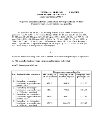 UCHWAŁA NR II/15/06 RADY MIEJSKIEJ W BIAŁEJ z dnia 6 grudnia 2006 r. PROJEKT w sprawie ustalenia na terenie Gminy Biała stawek podatku od środków transportowych oraz zwolnień z tego podatku. Na podstawie art. 18 ust. 2 pkt 8 ustawy z dnia 8 marca 1990 r. o samorządzie gminnym / Dz. U. z 2001 r. Nr 142 poz. 1591; z 2002 r. Nr 23, poz. 220, Nr 62, poz. 558, Nr 113, poz. 984, Nr 153, poz. 1271, Nr 214, poz. 1806; z 2003 r. Nr 80, poz. 717, Nr 162, poz. 1568; z 2004 r. Nr 116, poz.1203; z 2005 r. Nr 172, poz. 1441, Nr 175, poz. 1457; z 2006 r. Nr 17, poz. 128, Nr 181, poz. 1337 / oraz art. 10 ust. 1 i 2 i art. 12 ust. 4 ustawy z dnia 12 stycznia 1991 r. o podatkach i opłatach lokalnych / tj. Dz.U. z 2006 r. Nr 121, poz. 844 / Rada Miejska w Białej uchwala co następuje: §1 Ustala się na terenie Gminy Biała stawki podatku od środków transportowych w wysokości: 1. Od samochodu ciężarowego o dopuszczalnej masie całkowitej: a) od 3,5 tony i poniżej 12 ton Lp. Rodzaj środka transportu 1 2 1. Samochody posiadające katalizatory wyprodukowane po 1995 roku 2. Samochody posiadające katalizatory wyprodukowane w 1995 roku i wcześniej 3. Samochody nie posiadające katalizatora wyprodukowane po 1995 roku 4. Samochody nie posiadające katalizatory wyprodukowane w 1995 roku i wcześniej Dopuszczalna masa całkowita Od 3,5 tony do Powyżej 5,5 ton Powyżej 9 ton a 5,5 ton włącznie do 9 ton włącznie poniżej 12 ton 3 4 5 476,57 688,38 1.112,00 529,54 794,26 1.164,93 582,47 900,21 1.217,86 626,72 1.044,51 1.253,42 b) równej lub wyższej 12 ton Liczba osi i dopuszczalna masa całkowita / w tonach / nie mniej niż mniej niż 12 13 14 15 13 14 15 12 17 19 21 23 25 17 19 21 23 25 12 25 27 29 31 25 27 29 31 Stawka podatku w złotych oś jezdna (osie) z zawieszeniem pneumatycznym lub zawieszeniem uznanym za równoważne Dwie osie 1.151,96 1.186,52 1.222,10 1.255,63 Trzy osie 1.369,45 1.410,54 1.452,84 1.496,43 1.541,36 1.588,57 Cztery osie i więcej 1.270,88 1.482,68 2.118,09 2.118,09 2.118,09 inne systemy zawieszenia osi jezdnych 1.457,40 1.501,12 1.546,15 1.588,57 1.643,37 1.692,64 1.743,41 1.795,72 1.849,59 1.906,27 1.588,57 1.906,27 2.468,48 2.477,33 2.477,33 2. od ciągnika siodłowego i balastowego przystosowanego do używania łącznie z naczepą lub przyczepą o dopuszczalnej masie całkowitej zespołu pojazdu a) od 3,5 tony i poniżej 12 ton Lp. Rodzaj środka transportu 1 2 1. Ciągniki siodłowe i balastowe przystosowane do używania łącznie z naczepą lub przyczepą posiadające katalizatory wyprodukowane po 1995 roku Dopuszczalna masa całkowita Od 3,5 tony do Powyżej 5,5 ton Powyżej 9 ton a 5,5 ton włącznie do 9 ton włącznie poniżej 12 ton 3 4 5 900,21 1.164,93 1.112,00 2 2. Ciągniki siodłowe i balastowe przystosowane do używania łącznie z naczepą lub przyczepą posiadające katalizatory wyprodukowane w 1995 roku i wcześniej 3. Ciągniki siodłowe i balastowe przystosowane do używania łącznie z naczepą lub przyczepą nie posiadające katalizatora wyprodukowane po 1995 roku 4. Ciągniki siodłowe i balastowe przystosowane do używania łącznie z naczepą lub przyczepą nie posiadające katalizatory wyprodukowane w 1995 roku i wcześniej 953,14 1.270,88 1.323,81 1.006,06 1.376,75 1.429,72 1.059,05 1.270,88 1.462,32 b) równej lub wyższej niż 12 ton Stawka podatku w złotych Liczba osi i dopuszczalna masa całkowita zespołu pojazdów: ciągnik siodłowy + naczepa, ciągnik balastowy + przyczepa / w tonach/ nie mniej niż mniej niż 12 18 25 31 powyżej 36 12 40 oś jezdna (osie) z zawieszeniem pneumatycznym lub zawieszeniem uznanym za równoważne Dwie osie 18 1.698,47 25 1.749,42 31 1.800,38 36 włącznie 1.907,95 1.907,95 Trzy osie 40 1.747,42 1.906,27 3 inne systemy zawieszenia osi jezdnych 1.799,95 1.853,96 1.907,95 1.955,65 1.957,14 1.800,38 2.527,70 3. Przyczepy i naczepy, które łącznie z pojazdem silnikowym posiadają dopuszczalną masę całkowitą z wyjątkiem związanych z działalnością rolniczą prowadzona przez podatnika podatku rolnego a) od 7 ton i poniżej 12 ton Lp. Masa całkowita Przyczepy i naczepy 1 2 3 1. Od 7 ton i poniżej 12 ton 889,58 b) równą lub wyższą niż 12 ton Lp. Dopuszczalna masa całkowita Ilość osi jezdnych 1 2 3 Zawieszenie osi Inne systemy jezdnych pneumatyczne zawieszenia osi lub uznanym za jezdnych równoważne 4 5 1. Równa lub wyższa Jedna oś niż 12 ton do 36 ton Dwie osie włącznie Trzy osie 847,24 1.376,76 931,92 1.429,72 889,51 1.419,10 2. Wyższej niż 36 ton 847,24 1.376,76 Dwie osie 1.160,52 1.716,87 Trzy osie 951,74 1.293,49 Jedna oś 4. Autobusy Liczba Lp. miejsc do siedzenia 1 2 1. Mniejszej niż 30 miejsc 2. Równej lub wyższej niż 30 miejsc Autobusy posiadające katalizatory wyprodukowane po 1995 roku Autobusy posiadające katalizatory wyprodukowane w 1995 roku i wcześniej 3 4 5 6 1.165,00 1.270,88 1.376,76 1.462,32 1.482,66 1.588,57 1.694,48 1.848,78 4 Autobusy nie Autobusy nie posiadające posiadające katalizatory katalizatory wyprodukowane wyprodukowane po 1995 roku w 1995 roku i wcześniej §2 Zwalnia się z podatku od środków transportowych autobusy wykorzystywane wyłącznie do przewozu dzieci do szkół. §3 Traci moc Uchwała Nr XXVI/257/05 Rady Miejskiej w Białej z dnia 6 grudnia 2005 r. w sprawie ustalenia na terenie Gminy Biała stawek podatku od środków transportowych oraz zwolnień z tego podatku. §4 Wykonanie uchwały powierza się Burmistrzowi Białej. §5 Uchwała wchodzi w życie w terminie 14 dni od jej ogłoszenia w Dzienniku Urzędowym Województwa Opolskiego, z mocą obowiązującą od dnia 1 stycznia 2007 r. 5 Uzasadnienie: Zgodnie z art.10 ustawy z dnia 12 stycznia 1991 r. o podatkach i opłatach lokalnych rada gminy określa wysokość stawek podatku od środków transportowych, z tym że stawki te nie mogą przekroczyć górnych granic stawek kwotowych określonych w Obwieszczeniu Ministra Finansów z dnia 25 października 2006 r. Dodatkowo w przypadku 