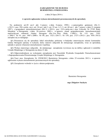 ZARZĄDZENIE NR 201/B/2014 BURMISTRZA STRZEGOMIA z dnia 24 lipca 2014 r. w sprawie ogłoszenia wykazu nieruchomości przeznaczonych do sprzedaży Na podstawie art.30 ust.2 pkt 3 ustawy z dnia 8 marca 1990 r. o samorządzie gminnym (Dz. U. z 2013 r. poz. 594 z późn. zm.), art. 34 ust.1 pkt 3, art. 35 ust. 1,2 i 3, art. 68 ust.1 pkt 7 ustawy z dnia 21 sierpnia 1997 r. o gospodarce nieruchomościami (Dz. U. z 2014 r. poz. 518 z późn.zm.) oraz Uchwały Nr 57/03 Rady Miejskiej w Strzegomiu z dnia 26 czerwca 2003 r. w sprawie zasad gospodarowania nieruchomościami stanowiącymi własność Gminy Strzegom (Dz. Urz. Woj. Doln. z 2003 r. Nr 115, poz. 2101 z 2005 r. Nr 91, poz. 1987 z 2006 r. Nr 89, poz. 1521 z 2011 r. Nr 159, poz. 2727 z 2012 r. poz. 930 i 3413) zarządza się co następuje: § 1. Przeznacza się do sprzedaży lokal mieszkalny położony w budynku stanowiącym mienie komunalne Gminy Strzegom opisany w wykazie, który stanowi załącznik do niniejszego zarządzenia, wraz ze sprzedażą udziału w prawie własności nieruchomości wspólnej. § 2. Wykaz stanowiący załącznik, do niniejszego zarządzenia wywiesza się na tablicy ogłoszeń w siedzibie Urzędu Miejskiego w Strzegomiu na okres 21 dni. § 3. Odpowiedzialnym za wykonanie zarządzenia jest Naczelnik Wydziału Gospodarki Nieruchomościami i Zagospodarowania Przestrzennego Urzędu Miejskiego w Strzegomiu. § 4. Traci moc Zarządzenie Nr 259/B/2013 Burmistrza Strzegomia z dnia 25 września 2013 r. w sprawie ogłoszenia wykazu nieruchomości przeznaczonych do sprzedaży. § 5. Zarządzenie wchodzi w życie z dniem podpisania. Burmistrz Strzegomia mgr Zbigniew Suchyta Id: 6E2F0042-BDA2-4C69-9286-3A6E208E2B39. Uchwalony Strona 1 Załącznik Nr 1 do Zarządzenia Nr 201/B/2014 Burmistrza Strzegomia z dnia 24 lipca 2014 r. w sprawie wykazu nieruchomości przeznaczonych do sprzedaży 1.Lokal mieszkalny Nr 2 o powierzchni użytkowej – 67,40 m2 oraz pomieszczenie przynależne – dwie 2.Położenie lokalu – Goczałków ul. Strzegomska 21 komórki o pow. 10,20 m2, 10,30 m2 3.Działka Nr 166/5, AM-2, Obr.Goczałków , o pow. 2.049 m2 4.Księga Wieczysta – SW1S/00033475/6 5.Przeznaczenie w miejscowym planie zagospodarowania przestrzennego – budownictwo mieszkaniowe 6. Udział w częściach wspólnych budynku i działki Nr 166/5 – 1637/10000 7.Cena lokalu mieszkalnego (zgodnie z wykonanym operatem szacunkowym przez rzeczoznawcę majątkowego) – 71.850,00 zł 8.Wartość udziału w działce – 10.100,00 zł (wykup udziału w gruncie na własność) 9. Pierwszeństwo w nabyciu nieruchomości z zastrzeżeniem art.216a ustawy o gospodarce nieruchomościami przysługuje osobie, która spełnia jeden z następujących warunków: 1/ przysługuje jej roszczenie o nabycie nieruchomości z mocy ustawy o gospodarce nieruchomościami lub odrębnych przepisów, jeżeli złożył wniosek o nabycie w terminie 6 tygodni od dnia wywieszenia niniejszego wykazu. 2/ jest poprzednim właścicielem zbywanej nieruchomości pozbawionym prawa własności tej nieruchomości przed dniem 5 grudnia 1990 r. albo jego spadkobiercą, jeżeli złożył wniosek o nabycie w terminie 6 tygodni od dnia wywieszenia niniejszego wykazu 3/ jest najemcą lokalu mieszkalnego. 10. W przypadku skorzystania przez najemcę z pierwszeństwa w nabyciu lokalu w terminie 21 dni od daty otrzymania zawiadomienia o przeznaczeniu nieruchomości do zbycia, sprzedaż lokalu następuje w trybie bezprzetargowym, udzielając 95% bonifikaty od wartości lokalu określonej zgodnie z wykonanym operatem szacunkowym przez rzeczoznawcę majątkowego oznaczonego jako przedmiot odrębnej własności, obejmującej lokal wraz z pomieszczeniami przynależnymi oraz udział w nieruchomości wspólnej, sprzedawanego jako odrębną nieruchomość. Pozostała po udzieleniu bonifikaty cena sprzedaży lokalu może być rozłożona na raty na okres do trzech lat. Wierzytelność gminy w stosunku do nabywcy tego tytułu podlega zabezpieczeniu hipotecznemu na nieruchomości. Pierwsza rata płatna jest przed zawarciem aktu notarialnego w wysokości nie mniejszej niż 25 % ceny sprzedaży lokalu po uwzględnieniu udzielonej bonifikaty. Rozłożona na raty nie spłacona część ceny podlega oprocentowaniu przy zastosowaniu stopy procentowej równej stopie redyskonta weksli stosowanej przez Narodowy Bank Polski. Id: 6E2F0042-BDA2-4C69-9286-3A6E208E2B39. Uchwalony Strona 1 UZASADNIENIE DO ZARZĄDZENIA Nr 201/B/2014 BURMISTRZA STRZEGOMIA z dnia 24 lipca 2014 roku. w sprawie wykazu nieruchomości przeznaczonych do sprzedaży Zgodnie z art. 35 ust. 1 i ust. 2 ustawy z dnia 21 sierpnia 1997 r. o gospodarce nieruchomościami(Dz. U. z 2014 r. poz. 518 z późn. zm.) Burmistrz Strzegomia jest zobowiązany do sporządzenia i podania do publicznej wiadomości wykazu nieruchomości przeznaczonych do sprzedaży. W związku z powyższym wydanie niniejszego zarządzenia jest uzasadnione. Id: 6E2F0042-BDA2-4C69-9286-3A6E208E2B39. Uchwalony Strona 1