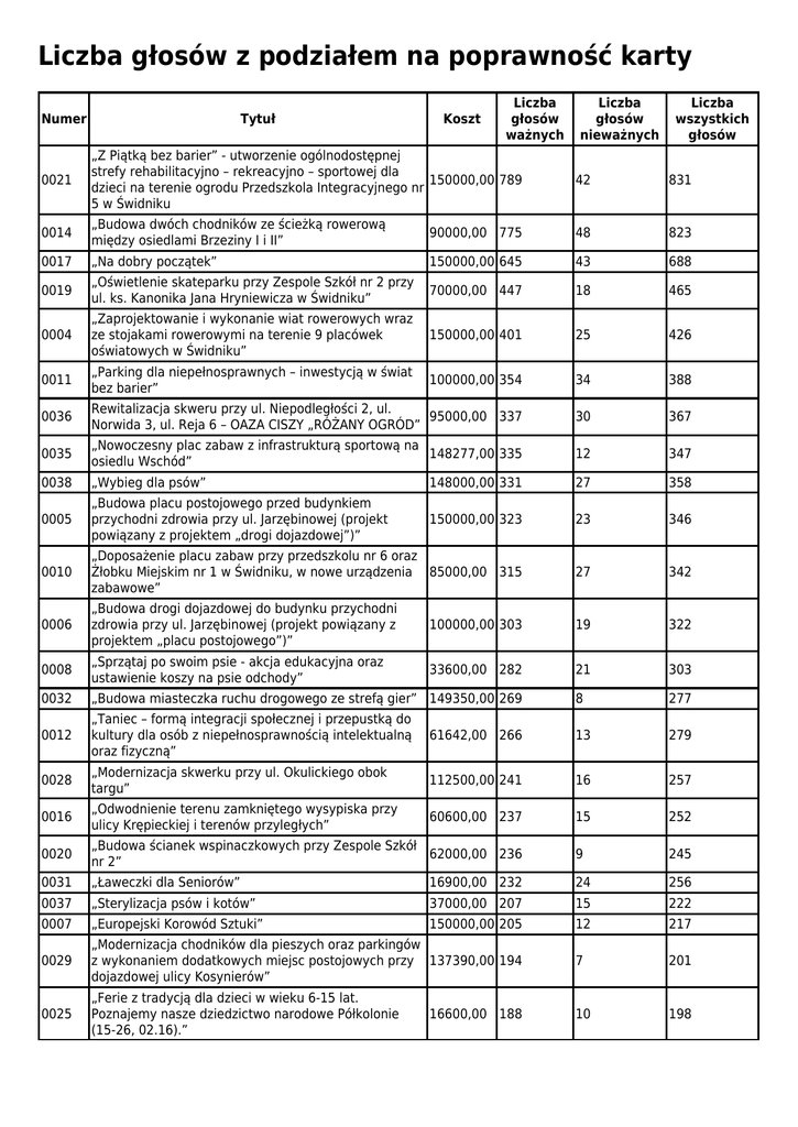 Liczba głosów z podziałem na poprawność karty Numer Tytuł Koszt Liczba głosów ważnych Liczba głosów nieważnych Liczba wszystkich głosów 0021 „Z Piątką bez barier” - utworzenie ogólnodostępnej strefy rehabilitacyjno – rekreacyjno – sportowej dla 150000,00 789 dzieci na terenie ogrodu Przedszkola Integracyjnego nr 5 w Świdniku 42 831 0014 „Budowa dwóch chodników ze ścieżką rowerową między osiedlami Brzeziny I i II” 90000,00 775 48 823 0017 „Na dobry początek” 150000,00 645 43 688 0019 „Oświetlenie skateparku przy Zespole Szkół nr 2 przy ul. ks. Kanonika Jana Hryniewicza w Świdniku” 70000,00 447 18 465 0004 „Zaprojektowanie i wykonanie wiat rowerowych wraz ze stojakami rowerowymi na terenie 9 placówek oświatowych w Świdniku” 150000,00 401 25 426 0011 „Parking dla niepełnosprawnych – inwestycją w świat bez barier” 100000,00 354 34 388 0036 Rewitalizacja skweru przy ul. Niepodległości 2, ul. 95000,00 337 Norwida 3, ul. Reja 6 – OAZA CISZY „RÓŻANY OGRÓD” 30 367 0035 „Nowoczesny plac zabaw z infrastrukturą sportową na 148277,00 335 osiedlu Wschód” 12 347 0038 „Wybieg dla psów” 148000,00 331 27 358 0005 „Budowa placu postojowego przed budynkiem przychodni zdrowia przy ul. Jarzębinowej (projekt powiązany z projektem „drogi dojazdowej”)” 150000,00 323 23 346 0010 „Doposażenie placu zabaw przy przedszkolu nr 6 oraz Żłobku Miejskim nr 1 w Świdniku, w nowe urządzenia 85000,00 315 zabawowe” 27 342 0006 „Budowa drogi dojazdowej do budynku przychodni zdrowia przy ul. Jarzębinowej (projekt powiązany z projektem „placu postojowego”)” 100000,00 303 19 322 0008 „Sprzątaj po swoim psie - akcja edukacyjna oraz ustawienie koszy na psie odchody” 33600,00 282 21 303 0032 „Budowa miasteczka ruchu drogowego ze strefą gier” 149350,00 269 8 277 0012 „Taniec – formą integracji społecznej i przepustką do kultury dla osób z niepełnosprawnością intelektualną oraz fizyczną” 61642,00 266 13 279 0028 „Modernizacja skwerku przy ul. Okulickiego obok targu” 112500,00 241 16 257 0016 „Odwodnienie terenu zamkniętego wysypiska przy ulicy Krępieckiej i terenów przyległych” 60600,00 237 15 252 0020 „Budowa ścianek wspinaczkowych przy Zespole Szkół 62000,00 236 nr 2” 9 245 0031 „Ławeczki dla Seniorów” 16900,00 232 24 256 0037 „Sterylizacja psów i kotów” 37000,00 207 15 222 0007 „Europejski Korowód Sztuki” 150000,00 205 12 217 0029 „Modernizacja chodników dla pieszych oraz parkingów z wykonaniem dodatkowych miejsc postojowych przy 137390,00 194 dojazdowej ulicy Kosynierów” 7 201 0025 „Ferie z tradycją dla dzieci w wieku 6-15 lat. Poznajemy nasze dziedzictwo narodowe Półkolonie (15-26, 02.16).” 10 198 16600,00 188 Numer Tytuł Koszt 0003 „Lustro drogowe na skrzyżowaniu ulic Niepodległości i 1500,00 Kosynierów w Świdniku” 0009 Liczba głosów ważnych Liczba głosów nieważnych Liczba wszystkich głosów 187 12 199 „Świdnicki Klub Projektantów” 150000,00 186 14 200 0018 „Budowa boiska do plażowej piłki siatkowej” 25000,00 176 8 184 0022 „Życie z autyzmem” 22000,00 159 7 166 0040 „Przystanki autobusowe” 149850,00 153 7 160 0002 „Rewitalizacja kolorem i sztuką” – murale na wielko powierzchniowych płaszczyznach budynków 72000,00 141 2 143 0039 „Zaplecze higieniczno–rekreacyjne dla psów na terenie 107106,00 126 Gminy Miejskiej Świdnik” 5 131 0024 „Warsztaty edukacyjne - wędrówki taneczne po Polsce” 10000,00 125 7 132 0034 „Ogólna koncepcja zabezpieczenia miasta Świdnik na obszarze zlewni Stawek-Stoki przy występowaniu maksymalnych opadów miarodajnych” 70000,00 110 3 113 0026 „JEDNO KOŁO – Centrum Rekreacji” 30000,00 106 9 115 0001 „Prace konserwacyjne rzeźb i pomników w Świdniku" 149540,00 81 8 89 0030 „Stojaki na rowery” 3000,00 17 84 0027 „Utwardzenie nawierzchni drogi poprzez wysypanie kory asfaltowej przy ul. Kruczkowskiego” 30000,00 45 2 47 0033 „Oświetlenie północnego odcinka ul. Brzegowej” 150000,00 43 2 45 0023 „WarszTaty dla ojców” 10800,00 41 0 41 0013 „Świdnicki Inkubator Przedsiębiorczości Społecznej” 126400,00 29 0 29 0015 „Stacja – inspiracja. Świdnik droga ku wolności.” 15500,00 7 2 9 603 10297 SUMA 67 9694