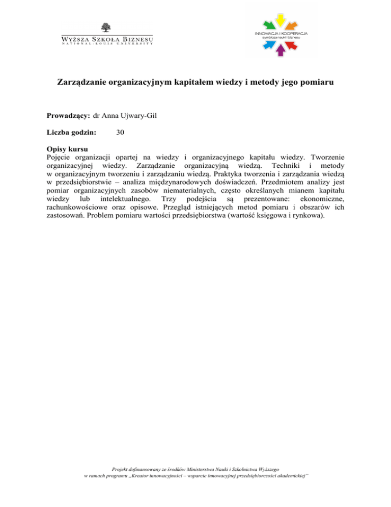 Zarządzanie organizacyjnym kapitałem wiedzy i metody jego pomiaru Prowadzący: dr Anna Ujwary-Gil Liczba godzin: 30 Opisy kursu Pojęcie organizacji opartej na wiedzy i organizacyjnego kapitału wiedzy. Tworzenie organizacyjnej wiedzy. Zarządzanie organizacyjną wiedzą. Techniki i metody w organizacyjnym tworzeniu i zarządzaniu wiedzą. Praktyka tworzenia i zarządzania wiedzą w przedsiębiorstwie – analiza międzynarodowych doświadczeń. Przedmiotem analizy jest pomiar organizacyjnych zasobów niematerialnych, często określanych mianem kapitału wiedzy lub intelektualnego. Trzy podejścia są prezentowane: ekonomiczne, rachunkowościowe oraz opisowe. Przegląd istniejących metod pomiaru i obszarów ich zastosowań. Problem pomiaru wartości przedsiębiorstwa (wartość księgowa i rynkowa). Projekt dofinansowany ze środków Ministerstwa Nauki i Szkolnictwa Wyższego w ramach programu „Kreator innowacyjności – wsparcie innowacyjnej przedsiębiorczości akademickiej”