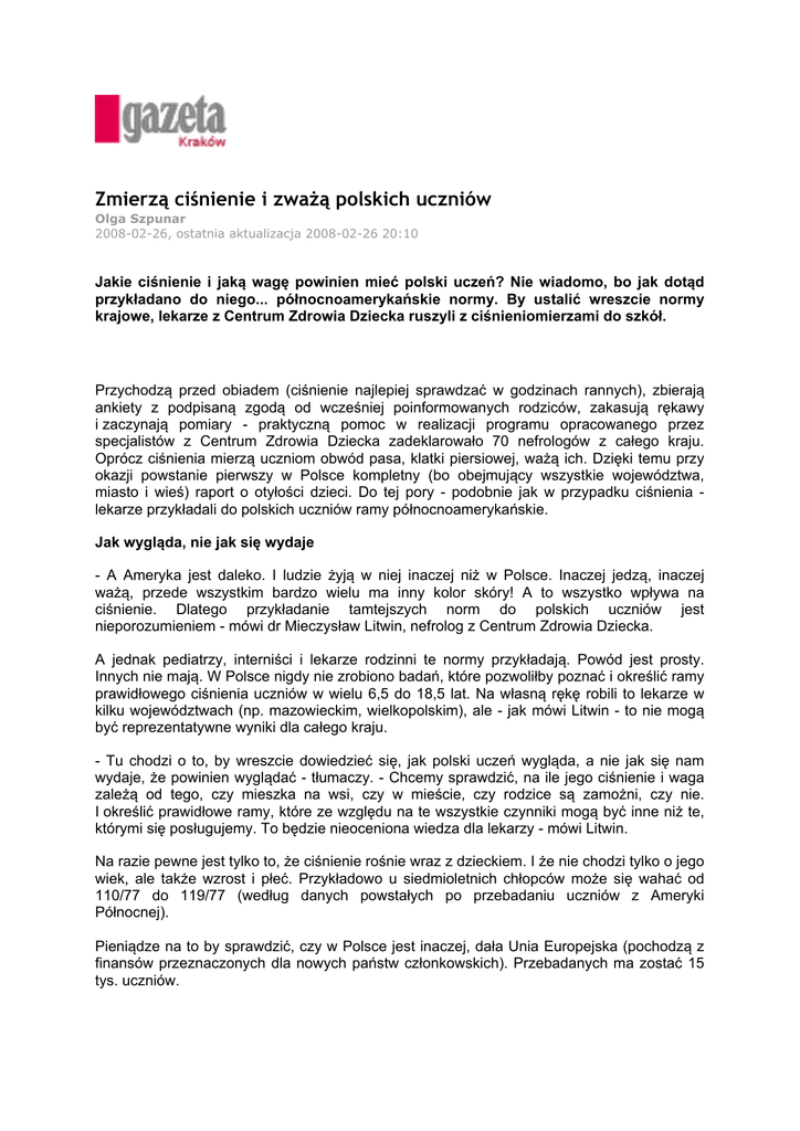 Zmierzą ciśnienie i zważą polskich uczniów Olga Szpunar 2008-02-26, ostatnia aktualizacja 2008-02-26 20:10 Jakie ciśnienie i jaką wagę powinien mieć polski uczeń? Nie wiadomo, bo jak dotąd przykładano do niego... północnoamerykańskie normy. By ustalić wreszcie normy krajowe, lekarze z Centrum Zdrowia Dziecka ruszyli z ciśnieniomierzami do szkół. Przychodzą przed obiadem (ciśnienie najlepiej sprawdzać w godzinach rannych), zbierają ankiety z podpisaną zgodą od wcześniej poinformowanych rodziców, zakasują rękawy i zaczynają pomiary - praktyczną pomoc w realizacji programu opracowanego przez specjalistów z Centrum Zdrowia Dziecka zadeklarowało 70 nefrologów z całego kraju. Oprócz ciśnienia mierzą uczniom obwód pasa, klatki piersiowej, ważą ich. Dzięki temu przy okazji powstanie pierwszy w Polsce kompletny (bo obejmujący wszystkie województwa, miasto i wieś) raport o otyłości dzieci. Do tej pory - podobnie jak w przypadku ciśnienia lekarze przykładali do polskich uczniów ramy północnoamerykańskie. Jak wygląda, nie jak się wydaje - A Ameryka jest daleko. I ludzie żyją w niej inaczej niż w Polsce. Inaczej jedzą, inaczej ważą, przede wszystkim bardzo wielu ma inny kolor skóry! A to wszystko wpływa na ciśnienie. Dlatego przykładanie tamtejszych norm do polskich uczniów jest nieporozumieniem - mówi dr Mieczysław Litwin, nefrolog z Centrum Zdrowia Dziecka. A jednak pediatrzy, interniści i lekarze rodzinni te normy przykładają. Powód jest prosty. Innych nie mają. W Polsce nigdy nie zrobiono badań, które pozwoliłby poznać i określić ramy prawidłowego ciśnienia uczniów w wielu 6,5 do 18,5 lat. Na własną rękę robili to lekarze w kilku województwach (np. mazowieckim, wielkopolskim), ale - jak mówi Litwin - to nie mogą być reprezentatywne wyniki dla całego kraju. - Tu chodzi o to, by wreszcie dowiedzieć się, jak polski uczeń wygląda, a nie jak się nam wydaje, że powinien wyglądać - tłumaczy. - Chcemy sprawdzić, na ile jego ciśnienie i waga zależą od tego, czy mieszka na wsi, czy w mieście, czy rodzice są zamożni, czy nie. I określić prawidłowe ramy, które ze względu na te wszystkie czynniki mogą być inne niż te, którymi się posługujemy. To będzie nieoceniona wiedza dla lekarzy - mówi Litwin. Na razie pewne jest tylko to, że ciśnienie rośnie wraz z dzieckiem. I że nie chodzi tylko o jego wiek, ale także wzrost i płeć. Przykładowo u siedmioletnich chłopców może się wahać od 110/77 do 119/77 (według danych powstałych po przebadaniu uczniów z Ameryki Północnej). Pieniądze na to by sprawdzić, czy w Polsce jest inaczej, dała Unia Europejska (pochodzą z finansów przeznaczonych dla nowych państw członkowskich). Przebadanych ma zostać 15 tys. uczniów. Złym się nie chce, dobrym też W Małopolsce testom poddanych zostanie 38 szkół. Kraków już wystartował (w sumie badanie zostanie przeprowadzone w pięciu szkołach). Nefrolodzy pojawili się w piątek w XV Liceum Profilowanym. - Uczniowie grzecznie stawili się na badania - cieszy się dr Zbigniew Kułaga odpowiedzialny za realizację projektu. To ważne, bo nie wszystkie szkoły i wszyscy rodzice podchodzą poważnie do problemu. Najgorzej jest w szkołach uchodzących za złe, bo tam nikomu nic się nie chce, i w szkołach uchodzących za najlepsze, bo tam mądralińscy uczniowie uważają, że są ponad takie akcje mówi Litwin. CZD ma też kłopoty z ankietami, o których wypełnienie prosi rodziców. Litwin: Pytamy w nich o status materialny, by sprawdzić, czy stopa życiowa ma wpływ na wysokość ciśnienia. No i dostajemy ankiety pełne obraźliwych uwag i pytań, co nas to obchodzi. Jakby rodzice nie rozumieli, że te badania mogą pomóc ich dzieciom. Cała akcja nosi nazwę "Olaf" i jej pierwszy etap (badania w szkołach) ma się zakończyć w grudniu 2008 r. Potem lekarze zabiorą się za wyciąganie wniosków i opracowanie polskich norm. Patronat nad badaniami objęło Ministerstwo Edukacji. Źródło: Gazeta Wyborcza Kraków