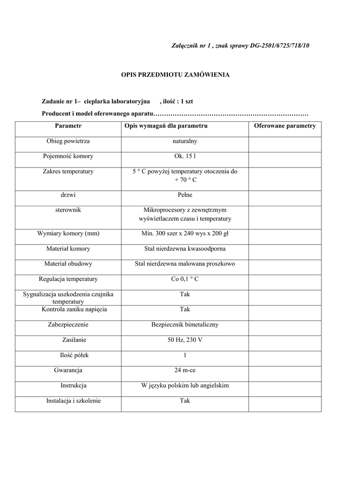 Załącznik nr 1 , znak sprawy DG-2501/6725/718/10 OPIS PRZEDMIOTU ZAMÓWIENIA Zadanie nr 1– cieplarka laboratoryjna , ilość : 1 szt Producent i model oferowanego aparatu……………………………………………………………… Parametr Opis wymagań dla parametru Obieg powietrza naturalny Pojemność komory Ok. 15 l Zakres temperatury 5 ° C powyŜej temperatury otoczenia do + 70 ° C drzwi Pełne sterownik Mikroprocesory z zewnętrznym wyświetlaczem czasu i temperatury Wymiary komory (mm) Min. 300 szer x 240 wys x 200 gł Materiał komory Stal nierdzewna kwasoodporna Materiał obudowy Stal nierdzewna malowana proszkowo Regulacja temperatury Co 0,1 ° C Sygnalizacja uszkodzenia czujnika temperatury Kontrola zaniku napięcia Tak Tak Zabezpieczenie Bezpiecznik bimetaliczny Zasilanie 50 Hz, 230 V Ilość półek 1 Gwarancja 24 m-ce Instrukcja W języku polskim lub angielskim Instalacja i szkolenie Tak Oferowane parametry Zadanie nr 2 – termomikser z blokiem grzejnym na probówki 1,5 ml, ilość : 1 szt Producent i model oferowanego aparatu……………………………………………………………… Parametr Opis wymagań dla parametru Praca w zakresie temperatur +1 °C do 99 ° C Ruch rotacyjny przystawki 300-1,400 rpm Wzrost temperatury 5 ° C/min Wyświetlacz ciekłokrystaliczny tak termoblok 24 x 1,5 ml Blok chłodzący Na 0 ° C, 24x1,5 ml Zakres termostatowania Od 4 ° C powyŜej temperatury pokojowej do 99 ° C Dokładność utrzymywania temperatury ± 1 ° C pomiędzy 20 ° C a 45 ° C, ± 2 ° C poniŜej 20 ° C i powyŜej 45 ° C Tak Prędkość ogrzewania Ok. 5 ° C Szybkość mieszania 300-1400 obr/min Suw mieszania 3 mm Wymiary ( szer x głęb x wys) 16, 5 x 24 x 14,5 cm Masa 2,4 kg Autoryzowany serwis na terenie Polski Tak Gwarancja 24 m-ce Instrukcja W języku polskim lub angielskim Instalacja i szkolenie Tak Oferowane parametry Zadanie nr 3 – stół wagowy, ilość : 1 szt Producent i model oferowanego aparatu……………………………………………………………… Parametr Opis wymagań dla parametru Rama stalowa nogi Stalowe o regulowanej wysokości płyta Marmurowa wbudowana w powierzchnię roboczą o wym. min 40 x 40 cm osadzona na elementach gumowych absorbujących drgania Wymiary całkowite stołu ( szer x gł x wys) 80 x 60 x 78 cm Wymiary powierzchni roboczej Szer 400 x gł. 450 mm Masa całkowita 88 KG Gwarancja 12 miesięcy Instalacja Tak Oferowane parametry Zadanie nr 4- cieplarka CO2, ilość : 1 szt Producent i model oferowanego aparatu……………………………………………………………… Parametr Opis wymagań dla parametru Pojemność Ok. 167 l. Wymiary wewnętrzne sxgxw Ok. 520 x 500 x 650 mm Wymiary zewnętrzne sxgxw Ok. 710 x 740 x 990 Zakres temperatury od T otocz.+ 8° C do 50°C Jednorodność temperatury. +/-0,35° przy 37°C Zasilanie 230V Częstotliwość 50/60Hz Oferowane parametry Zakres CO2 0-20% Dokładność pomiaru CO2 w zakresie 5% CO2 monitorowane za pośrednictwem +/- 0,1% Czujnika podczerwieni IR Szybkość odzyskania poziomu CO2 do 5% Wilgotność względna w temp. 37°C < 5 minut Sterownie temperaturą Mikroprocesorowe Alarm temperatury Tak Alarm CO2 Tak Zabezpieczenie nadtemperaturowe Tak Filtr HEPA na wejściu CO2 do komory inkubatora System wcześniejszego podgrzewania CO2 z komorą miedzianą Rodzaj płaszcza TAK Powietrzny Umieszczenie portów danych Z przodu aparatu Ilość półek w dostawie 4 Gwarancja 12 miesięcy 95% TAK Instrukcja W języku polskim lub angielskim Instalacja i szkolenie Tak Sterylizacja komory 180 ° C przez co najmniej 1 h Tak Zadanie nr 5 – wytrząsarka laboratoryjna, ilość : 1 szt Producent i model oferowanego aparatu……………………………………………………………… Parametr Ruch Opis wymagań dla parametru okręŜny Oferowane parametry Orbita 10 mm Max. obciąŜenie wraz z wyposaŜeniem Zakres obrotów 7,5 kg 10 do 500 obr/min Wyświetlacz prędkości cyfrowy Zegar 0-9 h 59 min/oprac. ciągła Wymiary ( szer x gł x wys ) 360 x 420 x 98 mm CięŜar 8,8 kg Klasa IP obudowy zgodna z normą DIN EN 60529 Moc znamionowa silnika Wejście/wyjście Interfejs IP 21 RS 323/analogowy Wymagane zasilanie 230 V 50/60 Hz Gwarancja 12 miesięcy 45/10 W Instrukcja W języku polskim lub angielskim Instalacja i szkolenie Tak Zadanie nr 6 – wirówkowy koncentrator próŜniowy , ilość : 1 szt Producent i model oferowanego aparatu……………………………………………………………… Parametr Pompa Opis wymagań dla parametru Prędkość obrotowa Zintegrowana z wirówką , pompa przeponowa odporna na czynniki chemiczne, z powłoką PTFE Min 1400 obr/min Podciśnienie Min 20 mBa Rotory UmoŜliwiające wirowanie probówek typu eppendorf o pojemności 1,5-2 ml oraz falcon o pojemności 15 m Stopnie ogrzewania 30 ° C, 45 ° C, 60 ° C Regulacja temperatury Programowanie Programy operacji dobierane w zaleŜności od stosowanego rozpuszczalnika ( woda , Oferowane parametry Komora Gwarancja alkohol) Odporna na czynniki chemiczne , ze stali szlachetnej Min. 12 miesięcy Instrukcja W języku polskim lub angielskim Instalacja i szkolenie Tak Zadanie nr 7 – szafa termostatyczna z drzwiami pełnymi oraz wymuszonym obiegiem powietrza ilość : 1 szt Producent i model oferowanego aparatu……………………………………………………………… Parametr Opis wymagań dla parametru Pojemność 68 l Zakres temperatur Od 3 ° C do 40 ° C regulacja co 0,1 ° C Wyświetlacz LCD tak Wymiary komory ( szer x wys x gł) 470 x 430 x 300 Obudowa Z blachy malowanej proszkowo Wnętrze z aluminium tak Ilość półek 2 półki Regulowane połoŜenie prowadnic Tak Gwarancja 24 miesiące Instrukcja W języku polskim lub angielskim Instalacja i szkolenie Tak Oferowane parametry Zadanie nr 8 – suchy blok cyfrowy z komorą grzejną z pokrywą ilość : 1 szt Producent i model oferowanego aparatu…………………………