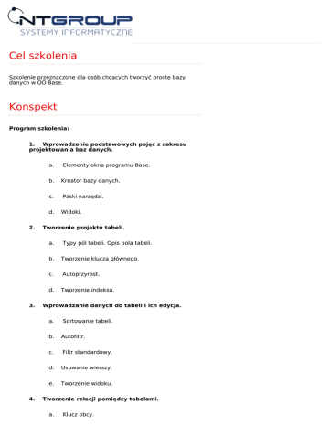 Cel szkolenia Szkolenie przeznaczone dla osób chcacych tworzyć proste bazy danych w OO Base. Konspekt Program szkolenia: 1. Wprowadzenie podstawowych pojęć z zakresu projektowania baz danych. a. Elementy okna programu Base. b. Kreator bazy danych. c. Paski narzędzi. d. Widoki. 2. Tworzenie projektu tabeli. a. Typy pól tabeli. Opis pola tabeli. b. Tworzenie klucza głównego. c. Autoprzyrost. d. Tworzenie indeksu. 3. Wprowadzanie danych do tabeli i ich edycja. a. Sortowanie tabeli. b. Autofiltr. c. Filtr standardowy. d. Usuwanie wierszy. e. Tworzenie widoku. 4. Tworzenie relacji pomiędzy tabelami. a. Klucz obcy. b. Rodzaje relacji. 5. Tworzenie prostego projektu kwerendy. 6. Budowania zapytań za pomocą operatorów AND, OR, NOT. Nazwa: 7. Tworzenie formularzy z wykorzystaniem a. Kreatora formularzy. Szkolenie Open Office Base - baza danych podstawy Czas trwania: 2 dni b. Tworzenie projektu formularza. Ilość godzin: 8. Kreator raportów. 16 Język: a. Wybór pól raportu. b. Nazywanie pól raportu. Prowadzący: Wieloletni trener Microsoft Lokalizacja: NT Group Łódź, siedziba klienta, lub dowolne miasto w Polsce Cena szkolenia: 345 PLN c. Wybór wyglądu raportu. Dodatkowe informacje Dostępne terminy W cenę szkolenia wliczony jest: Certyfikat ukończenia szkolenia NT Group Sp. z o.o. Materiały szkoleniowe, notatnik, długopis Kontakt z trenerem po szkoleniu Kawa, herbata, słodki poczęstunek Obiad NT GROUP Sp. z o.o. 90-418 Łódź, Al. T. Kościuszki 39 III piętro Firma posiada wpis w Urzędzie Miasta Łodzi jako placówka kształcenia ustawicznego. infolina 801 011 684 Tel.: +48 42 655-33-77; Fax: +48 42 630-15-63 e-mail: [email protected] NT Group Systemy Informatyczne Sp. z o.o. Krajowy Rejestr Sądowy Konto Bankowe 90-418 Łódź, Al. T. Kościuszki 39 III piętro KRS 0000214993 Kredyt Bank S.A. tel.: +42 6553377 Sąd Rejonowy dla Łodzi-Śródmieścia Rozliczenie Krajowe: tel. / fax. +42 6301563 w Łodzi, XX Wydział KRS 71 1500 1246 1215 4005 5991 0000 e-mail: [email protected] www.ntgroup.pl Rozliczenie Zagraniczne: Regon: 470557218 PL 71 1500 1246 1215 4005 5991 0000 NIP: 7251888624 KRDBPLPW