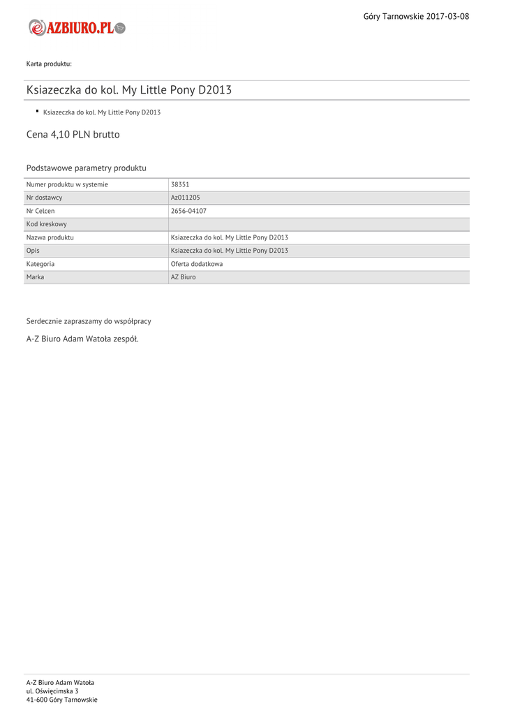 Góry Tarnowskie 2017-03-08 Karta produktu: Ksiazeczka do kol. My Little Pony D2013 Ksiazeczka do kol. My Little Pony D2013 Cena 4,10 PLN brutto Podstawowe parametry produktu Numer produktu w systemie 38351 Nr dostawcy Az011205 Nr Celcen 2656-04107 Kod kreskowy Nazwa produktu Ksiazeczka do kol. My Little Pony D2013 Opis Ksiazeczka do kol. My Little Pony D2013 Kategoria Oferta dodatkowa Marka AZ Biuro Serdecznie zapraszamy do współpracy A-Z Biuro Adam Watoła zespół. A-Z Biuro Adam Watoła ul. Oświęcimska 3 41-600 Góry Tarnowskie