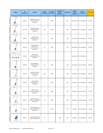 NR PRODUKTU NAZWA WAGA CAŁKOWITA DŁUGOŚĆ CAŁKOWITA WYSOKOŚĆ CZĘŚCI ROBOCZEJ SZEROKOŚĆ narzędzia ogrodnicze No 001 szpadel wzmocniony utwardzony trzon metalowy 2 1200 _ 200 utwardzana trzon metalowy 22,90 zł narzędzia ogrodnicze No 002 szpadel szpiczasty utwardzony trzon metalowy 1,95 1200 _ 200 utwardzana trzon metalowy 22,90 zł narzędzia ogrodnicze No 003 szpadel prosty utwardzony trzon metalowy 2 1200 _ 200 utwardzana trzon metalowy 22,90 zł narzędzia ogrodnicze No 004 łopata piaskowa wzmocniona utwardzona trzon metalowy 2,2 1200 _ 240 utwardzana trzon metalowy 22,90 zł narzędzia ogrodnicze No 005 zestaw łopat utwardzonych trzon metalowy _ _ _ _ utwardzana trzon metalowy _ narzędzia ogrodnicze No 006 łopata piaskowa hartowana trzon metalowy 2,2 1200 _ 240 hartowana trzon metalowy 30,00 zł narzędzia ogrodnicze No 007 szpadel szpiczasty hartowany trzon metalowy 1,95 1200 _ 200 hartowana trzon metalowy 30,00 zł narzędzia ogrodnicze No 008 szpadel prosty hartowany trzon metalowy 2 1200 _ 200 hartowana trzon metalowy 30,00 zł narzędzia ogrodnicze No 009 szpadel prosty hartowany z tuleją trzon drewniany 1,6 1200 _ 200 hartowana trzon drewniany 17,50 zł narzędzia ogrodnicze No 010 szpadel szpiczasty hartowany z tuleją trzon drewniany 1,6 1200 _ 200 hartowana trzon drewniany 17,50 zł narzędzia ogrodnicze No 011 szpadel ogrodniczy prosty standard trzon drewniany 2 1200 _ 200 standard trzon drewniany 12,83 zł narzędzia ogrodnicze No 012 szpadel ogrodniczy prosty standard N OP 1,2 _ 480 200 standard nie oprawiony 10,13 zł ZDJĘCIE www.zmwalkiewicz.pl [email protected] Strona 1 z 17 RODZAJ CZĘŚCI ROBOCZEJ WERSJA WYKONANIA CENA NETTO narzędzia ogrodnicze No 013 szpadel wzmocniony standard trzon drewniany 2 1200 480 200 standard trzon drewniany 12,83 zł narzędzia ogrodnicze No 014 łopata piaskowa standard trzon drewniany 1,8 1200 _ 250 standard trzon drewniany 10,13 zł narzędzia ogrodnicze No 015 łopata piaskowa standard N OP 1 _ 350 250 standard nie oprawiony 7,43 zł narzędzia ogrodnicze No 016 saperka metalowa 1,2 760 _ 155 standard trzon metalowy 13,50 zł narzędzia ogrodnicze No 017 saperka trzon drewniany 0,7 620 _ 150 standard trzon drewniany 8,10 zł narzędzia ogrodnicze No 018 łopata węglowa nr 1 trzon drewniany 1,8 1250 _ 200 standard trzon drewniany 13,50 zł narzędzia ogrodnicze No 019 łopata węglowa nr 2 trzon drewniany 2 1300 _ 250 standard trzon drewniany 14,85 zł narzędzia ogrodnicze No 020 łopata węglowa nr 3 trzon drewniany DY 2,5 1250 _ 295 standard trzon drewniany DY 16,20 zł narzędzia ogrodnicze No 021 łopata węglowa nr 4 trzon drewniany DY 3 1300 _ 465 standard trzon drewniany DY 17,55 zł narzędzia ogrodnicze No 022 łopata aluminiowa nr 3 trzon drewniany DY 1,5 1250 _ 295 standard trzon drewniany DY 31,05 zł narzędzia ogrodnicze No 023 łopata aluminiowa nr 4 trzon drewniany DY 1,7 1300 _ 465 standard trzon drewniany DY 33,75 zł narzędzia ogrodnicze No 024 łopata do śniegu aluminiowa trzon aluminium DY 1,5 1330 480 350 standard trzon aluminium DY 47,25 zł narzędzia ogrodnicze No 025 łopata do śniegu aluminiowa trzon drewniany 1,8 1250 350 480 standard trzon drewniany 33,75 zł www.zmwalkiewicz.pl [email protected] Strona 2 z 17 narzędzia ogrodnicze łopata do śniegu metalowa trzon drewniany 2,3 1250 350 480 standard trzon drewniany 14,85 zł narzędzia ogrodnicze No 027 łopata do śniegu plastikowa trzon drewniany DY 1,1 1320 390 460 standard trzon drewniany DY 13,50 zł narzędzia ogrodnicze No 028 widły amerykany hartowane N OP 1,4 _ 410 195 hartowana nie oprawiony 24,30 zł narzędzia ogrodnicze No 029 widły amerykany hartowane trzon drewniany DY 2,1 1300 410 195 hartowana trzon drewniany DY 29,70 zł No 030 -8 grabie metalowe z tuleją spawaną tłoczone kątowo trzon drewniany 8 0,9 1350 90 200 standard trzon drewniany 7,56 zł No 030 -10 grabie metalowe z tuleją spawaną tłoczone kątowo trzon drewniany 10 1 1350 90 260 standard trzon drewniany 7,83 zł No 030 -12 grabie metolowe z tuleją spawaną tłoczone kątowo trzon drewniany 12 1,05 1350 90 320 standard trzon drewniany 8,10 zł narzędzia ogrodnicze No 030 - 14 grabie metolowe z tuleją spawaną tłoczone kątowo trzon drewniany 14 1,15 1350 90 380 standard trzon drewniany 8,37 zł narzędzia ogrodnicze No 030 - 16 grabie metolowe z tuleją spawaną tłoczone kątowo trzon drewniany 16 1,25 1350 90 440 standard trzon drewniany 8,64 zł narzędzia ogrodnicze No 030 - 18 grabie metolowe z tuleją spawaną tłoczone kątowo trzon drewniany 18 1,3 1350 90 490 standard trzon drewniany 8,91 zł narzędzia ogrodnicze No 031 - 8 grabie metolowe z tuleją spawaną tłoczone kątowo N OP 8 0,4 _ 90 200 standard nie oprawiony 4,86 zł narzędzia ogrodnicze No 031 - 10 grabie metolowe z tuleją spawaną tłoczone kątowo N OP 10 0,5 _ 90 260 standard nie oprawiony 5,13 zł narzędzia ogrodnicze No 031 - 12 grabie metolowe z tuleją spawaną tłoczone kątowo N OP 12 0,55 _ 90 320 standard nie oprawiony 5,40 zł narzędzia ogrodnicze narzędzia ogrodnicze narzędzia ogrodnicze No 026 www.zmwalkiewicz.pl [email protected] Strona 3 z 17 _ 90 380 standard nie oprawiony 5,67 zł No 031 - 16 grabie metolowe z tuleją spawaną tłoczone kątowo N OP 16 0,75 _ 90 440 standard nie oprawiony 5,94 zł narzędzia ogrodnicze No 031 - 18 grabie metolowe z tuleją spawaną tłoczone kątowo N OP 18 0,08 _ 90 490 standard nie oprawiony 6,21 zł narzędzia ogrodnicze No 032 - 8 grabie metalowe z tuleją nitowaną trzon drewniany 8 0,9 1350 90 200 standard trzon drewniany 7,56 zł narzędzia ogrodnicze No 032 - 10 grabie metalowe z tuleją nitowaną trzon drewniany 10 1 1350 90 260 standard trzon drewniany 7,83 zł narzędzia ogrodnicze No 032 - 12 grabie metalowe z tuleją nitowaną trzon drewniany 12 1,05 1350 90 320 standard trzon drewniany 8,10 zł narzędzia ogrodnicze No 032 - 14 grabie metalowe z tuleją nitowaną trzon drewniany 14 1,15 1350 90 380 stand