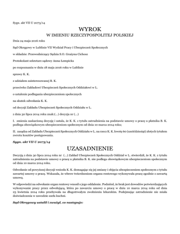 Sygn. akt VII U 2073/14 WYROK W IMIENIU RZECZYPOSPOLITEJ POLSKIEJ Dnia 24 maja 2016 roku Sąd Okręgowy w Lublinie VII Wydział Pracy i Ubezpieczeń Społecznych w składzie: Przewodniczący Sędzia S.O. Grażyna Cichosz Protokolant sekretarz sądowy Anna Łempicka po rozpoznaniu w dniu 18 maja 2016 roku w Lublinie sprawy K. K. z udziałem zainteresowanej B. K. przeciwko Zakładowi Ubezpieczeń Społecznych Oddziałowi w L. o ustalenie podlegania ubezpieczeniom społecznych na skutek odwołania K. K. od decyzji Zakładu Ubezpieczeń Społecznych Oddziału w L. z dnia 30 lipca 2014 roku znak:(...) decyzja nr (...) I. zmienia zaskarżoną decyzję i ustala, że K. K. z tytułu zatrudnienia na podstawie umowy o pracę u płatnika B. K. podlega obowiązkowym ubezpieczeniom społecznym od dnia 10 marca 2014 roku; II. zasądza od Zakładu Ubezpieczeń Społecznych Oddziału w L. na rzecz K. K. kwotę 60 (sześćdziesiąt) złotych tytułem zwrotu kosztów postępowania. Sygn. akt VII U 2073/14 UZASADNIENIE Decyzją z dnia 30 lipca 2014 roku nr (...) Zakład Ubezpieczeń Społecznych Oddział w L. stwierdził, że K. K. z tytułu zatrudnienia na podstawie umowy o pracę u płatnika B. K. nie podlega obowiązkowym ubezpieczeniom społecznym od dnia 10 marca 2014 roku. Odwołanie od powyższej decyzji wniosła K. K. domagając się jej zmiany i objęcia ubezpieczeniem społecznym z tytułu zawartej umowy o pracę. Wskazała, że wbrew twierdzeniom organu rentowego wykonywała pracę zgodnie z zawartą umową. W odpowiedzi na odwołanie organ rentowy wnosił o jego oddalenie. Podniósł, że brak jest dowodów potwierdzających wykonywanie pracy przez odwołującą, która po zawarciu umowy o pracę w dniu 10 marca 2014 roku od dnia 23 kwietnia 2014 roku przebywała na długotrwałym zwolnieniu lekarskim. Podejmując zatrudnienie nie miała doświadczenia w zawodzie szefa kuchni. Sąd Okręgowy ustalił i zważył, co następuje: B. K. zawarła z K. K. umowę o pracę, na podstawie której zatrudniła odwołującą na czas określony od dnia 10 marca 2014 roku do dnia 31 marca 2015 roku w pełnym wymiarze czasu pracy na stanowisku szefa kuchni w (...) B. K. z wynagrodzeniem 2 800 zł (umowa o pracę – k. 7 akt ZUS). Pracownica została przeszkolona w zakresie bhp (k. 8 akt ZUS). Potrzeba zatrudnienia szefa kuchni wynikała z otwarcia przez zainteresowaną drugiej stołówki w A. i wobec tego konieczna była osoba do prowadzenia stołówki w budynku (...). Zakres obowiązków został pisemnie określony w sposób ogólny, niezwiązany z charakterem wykonywanego zatrudnienia (k. 10-12 akt ZUS). Wnioskodawczyni pracowała w okresie od dnia 10 marca 2014 roku do dnia 22 kwietnia 2014 roku (listy obecności – k. 13-14 akt ZUS). Za wykonaną pracę otrzymała wynagrodzenie w wysokości ustalonej umową o pracę (listy płac – k. 15-17 akt ZUS). W ramach wykonywanej pracy wnioskodawczyni zajmowała się zamawianiem towaru i produktów żywnościowych (k. 18-21 akt ZUS). W dacie zawierania umowy o pracę K. K. była w ciąży. Nie było przeciwskazań medycznych do podjęcia przez nią wówczas zatrudnienia w charakterze szefa kuchni (opinia biegłego – k. 62). K. K. przed zawarciem powyższej umowy o pracę była wcześniej zatrudniona przez męża zainteresowanej w charakterze kucharza na podstawie umowy zlecenia. Umowa ta została zakończona z uwagi na problemy z poprzednią ciążą wnioskodawczyni. Obecnie nadal jest zatrudniona u zainteresowanej w charakterze szefa kuchni. Na stanowisku szefa kuchni wykonywała wszelkie wymagane czynności do prowadzenia stołówki. Pracowała przez 5 dni w tygodniu od godz. 8 do godz. 16. Pracę wykonywała w stołówce zlokalizowanej przy budynku (...), gdzie znajdują się myjnia i inne zakłady pracy. Dziennie wydawała około 40 posiłków. W kuchni pracował również jeszcze jeden pracownik i pomagała także zainteresowana. Wnioskodawczyni przygotowywała takie dania jak pierogi, bigos, kotlety, kurczaka, indyka, sałatki wedle z góry określonego określonego zapotrzebowania kalorycznego (zeznania wnioskodawczyni – k. 41v-42, 74v, zeznania zainteresowanej – k. 42-42v, 74v-75). Powyższy stan faktyczny został ustalony w oparciu o powołane dowody z dokumentów zgromadzonych ubezpieczeniowych wnioskodawczyni zawierające kopie jej akt osobowych, które do dowody potwierdziły fakt zawarcia zakwestionowanej przez organ rentowy umowy o pracę oraz otrzymanie przez K. K. wynagrodzenia z tego tytułu. Natomiast zeznania wnioskodawczyni i zainteresowanej wskazały przyczyny zatrudnienia zainteresowanej na podstawie pełnoprawnego stosunku pracy oraz charakter wykonywanych przez nią obowiązków. Powodem zatrudnienia wnioskodawczyni było otwarcie przez zainteresowaną kolejnej stołówki, a zatem konieczne było, aby jedna z nich była prowadzona przez osobę kompetentną i zaangażowaną, stąd konieczne stało się zatrudnienie szefa kuchni. Wnioskodawczyni wcześniej pracowała już jako kucharz u męża zainteresowanej zatem posiadała niezbędne doświadczenie i wiedzę w zawodzie. Zeznania te wzajemnie ze sobą korelowały, były spójne i logiczne oraz zgodne z doświadczeniem życiowym. Brak było wobec tego podstaw do odmówienia dania im wiary. Także opinia biegłego ginekologa zasługiwała na obdarzenie jej wiarą w całości jako spójna, kompleksowa i wydana przez niekwestionowanego specjalistę z dziedziny ginekologii. Odwołanie K. K. zasługuje na uwzględnienie. Zgodnie z art. 6 ust. l pkt l, art. 11, art. 12 i art. 13 pkt l ustawy z dnia 13 października 1998 roku o systemie ubezpieczeń społecznych (tekst jedn. Dz.U. z 2015 roku, poz. 121) obowiązkowo ubezpieczeniom emerytalnemu, rentowym, chorobowemu i wypadkowemu podlegają osoby fizyczne będące pracownikami w okresie od dnia nawiązania stosunku pracy do dnia ustania tego stosunku. Stosownie do treści art. 22 k.p. przez nawiązanie stosunku pracy pracownik zobowiązuje 