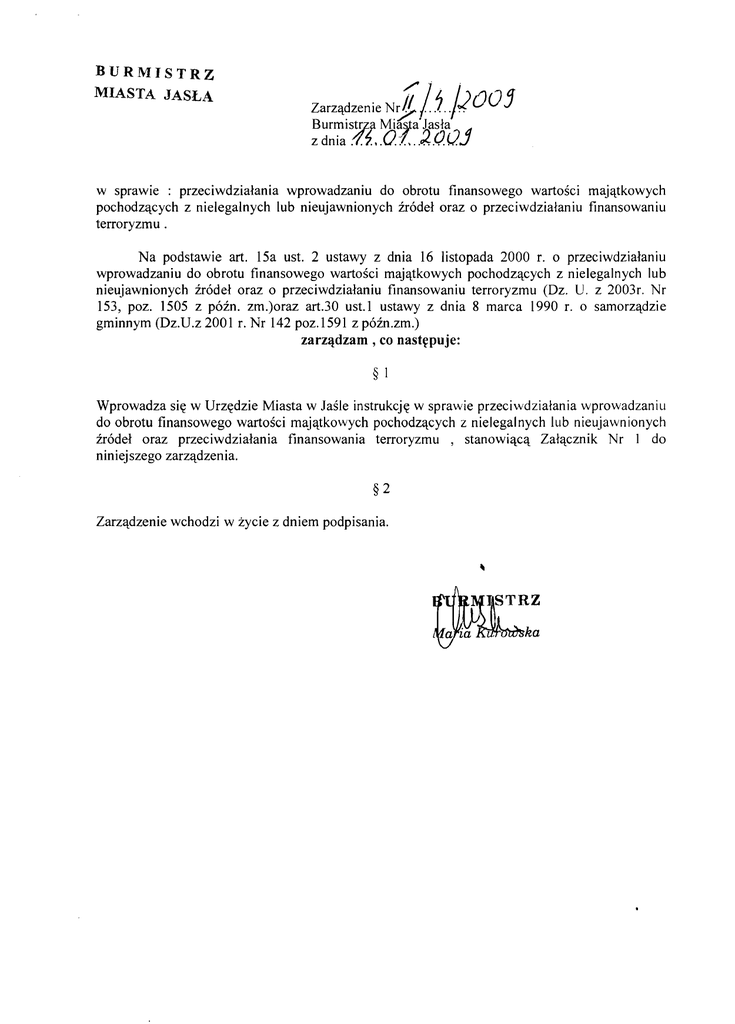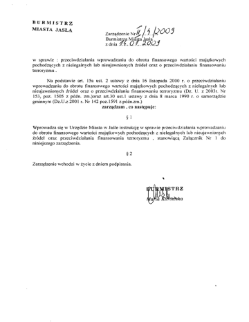 BURMISTRZ MIASTA JASŁA ZarządzenieNj/7/.)00 J Burmist.!:łJl Mia?a Jasła z dnia (/.t;. •. O.....~.O'Qj wprowadzaniu do obrotu finansowego wartości majątkowych pochodzących z nielegalnych lub nieujawnionych źródeł oraz o przeciwdziałaniu finansowaniu terroryzmu. w sprawie : przeciwdziałania Na podstawie art. 15a ust. 2 ustawy z dnia 16 listopada 2000 r. o przeciwdziałaniu wprowadzaniu do obrotu finansowego wartości majątkowych pochodzących z nielegalnych lub nieujawnionych źródeł oraz o przeciwdziałaniu finansowaniu terroryzmu (Dz. U. z 2003r. Nr 153, poz. 1505 z późno zm.)oraz art.30 ust.1 ustawy z dnia 8 marca 1990 r. o samorządzie gminnym (Dz.U.z 2001 r. Nr 142 poz.1591 z późn.zm.) zarządzam, co następuje: §l Wprowadza się w Urzędzie Miasta w Jaśle instrukcję w sprawie przeciwdziałania wprowadzaniu do obrotu finansowego wartości majątkowych pochodzących z nielegalnych lub nieujawnionych źródeł oraz przeciwdziałania finansowania terroryzmu , stanowiącą Załącznik Nr l do niniejszego zarządzenia. §2 Zarządzenie wchodzi w życie z dniem podpisania. , l Załącznik nr I . 09 do zarządzenia Nr II ~.l.!-ll Burmistrza Miasta Jasła z dnia .A~:.'9~:.~B(.. §1. Ilekroć w - niniejszej instrukcji jest mowa o: ustawie - dotyczy to ustawy z dnia 16 listopada 2000 r. o przeciwdziałaniu wprowadzaniu do obrotu finansowego wartości majątkowych pochodzących z nielegalnych lub nieujawnionych źródeł oraz o przeciwdziałaniu finansowaniu terroryzmu (tekst jednolity Dz. U. z 2003 r. Nr 153, poz. 1505 z późno zm.), kodeksie karnym - dotyczy to ustawy z dnia 6 czerwca 1997 r. Kodeks karny (Dz. U. Nr 88, poz. 553 z późno zm.), jednostce - oznacza to Urząd Miasta, kierowniku jednostki - oznacza to Burmistrza Miasta, GlIF - oznacza to Generalnego Inspektora lnformacj i Finansowej. § 2. Pracownicy jednostki właściwi merytorycznie z tytułu powierzonych im obowiązków, winni zapoznać się z treścią instrukcji i bezwzględnie przestrzegać zawartych w niej postanowień. Fakt zapoznania się z przepisami zawartymi w instrukcji winien być potwierdzony na specjalnym oświadczeniu, stanowiącym Załącznik Nr 1"a" do niniejszej Instrukcji. § 3. Pracownicy jednostki w trakcie wykonywania obowiązków s\użbowych obowiązani są do zwracania uwagi na: 1) nietypowe transakcje związane z nabyciem majątku komunalnego, 2) umowy i transakcje związane z wykonywaniem przez inne podmioty zadań publicznych na rzecz Miasta Jasła, realizowane na warunkach odbiegających od istniejących standardów, 3) nietypowe zachowania i czynności podejmowane przez uczestników postępowania o udzielenie zamówienia publicznego, polegające miedzy innymi na oferowaniu przez nich warunków wykonania zamówienia, rażąco odbiegających od oferowanych przez innych oferentów, 4) przypadki dokonywania przez podatników nadpłat podatków i ewentualnego ich wycofywania, 5) dokonywanie wpłaty znacznych kwot gotówką, np. tytułem zapłaty za nabyte mIenie komunalne, 6) dokonywanie wpłaty należności gotówką w ratach (kilkakrotnie), w tym samym dniu. § 4. 1. Pracownicy jednostki obowiązani są: 1) dokonywać analizy i oceny realizowanych transakcji w rozumieniu art. 2 pkt 2 ustawy. w którym występują symptomy wskazujące na możliwość wprowadzania do obrotu finansowego wartości majątkowych pochodzących z nielegalnych lub nieujawnionych źródeł, sporządzać potwierdzone kopie dokumentów dotyczących transakcji, co do których zachodzi podejrzenie, że mają one związek z popełnieniem przestępstwa, o którym mowa wart. 299 kodeksu karnego, 3) zebrać dostępne informacje o osobach przeprowadzającychte transakcje, 4) dokonać opisu transakcji, o których mowa wyżej wraz z uzasadnieniem, że zachodzą okoliczności wskazane wart. 15a ust. 1 ustawy i istnieje uzasadniona potrzeba powiadomienia o tym GlIF, przedkładając projekt jego powiadomienia. 2. Wzór powiadomienia GlIF stanowi Załącznik Nr 1 "b" do niniejszej Instrukcji. 2) § 5. 1. Koordynator ds. współpracy z GlIF, uznając zasadność podjęcia działań wnioskowanych przez pracownika, przedstawia kierownikowi jednostki projekt powiadomienia Gil F. zawierający opis ujawnionych okoliczności wraz z przyczynami, dla których uznano, że mogą wskazywać na dokonywanie działań mających na celu wprowadzenie do obrotu finansowego wartości majątkowych pochodzących z nielegalnych lub nieujawnionych źródeł. W przypadku stwierdzenia braku zasadności powiadomienia GlIF - koordynator sporządza uzasadnienie swojego stanowiska i przedstawia kierownikowi jednostki, celem podjęcia odpowiedniej decyzji. 2. Kopie powiadomienia GlIF wraz z dokumentacją oraz projekty powiadomień są ewidencjonowane w prowadzonym przez koordynatora rejestrze, którego wzór stanowi Załącznik Nr 1" c "do niniejszej Instrukcji. 3. Dostęp do rejestru i dokumentacji w sprawie powiadomienia GlIF mają: l) Burmistrz Miasta Jasła, 2) Zastępca Burmistrza Miasta Jasła 3) Koordynator ds. współpracy z GlIF 4) Z-ca koordynatora ds. współpracy z GlIF , § 6. Koordynator odpowiada za realizacje zadań wynikających z art. 15 i art. I5a ustawy. Do jego obowiązków w szczególności należy: 1) nadzór nad przestrzeganiem zasad zawartych w niniejszej instrukcji i przedstawianie propozycji dotyczących uzupełnienia lub zmiany jej treści, 2) przeprowadzenie szkoleń pracowników jednostki w zakresie niezbędnym do prawidłowego wykonywania zadań, jako jednostki współpracującej z GlIF, 3) okresowa analiza zapisów rejestru powiadomień GlIF o podejrzeniach wprowadzenia do obrotu finansowego wartości majątkowych pochodzących z nielegalnych bądź nieujawnionych źródeł, w celu ustalenia ich wzajemnych powiązań i przedstawienie raportu. § 7. Funkcje koordynatora ds. współpracy z GlIF powierzam Kierownikowi Kancelarii Tajnej i ds. Zarządzania Kryzysowego Kazimierzowi Wiśniowskiemu. Podczas jego nieobecnośc