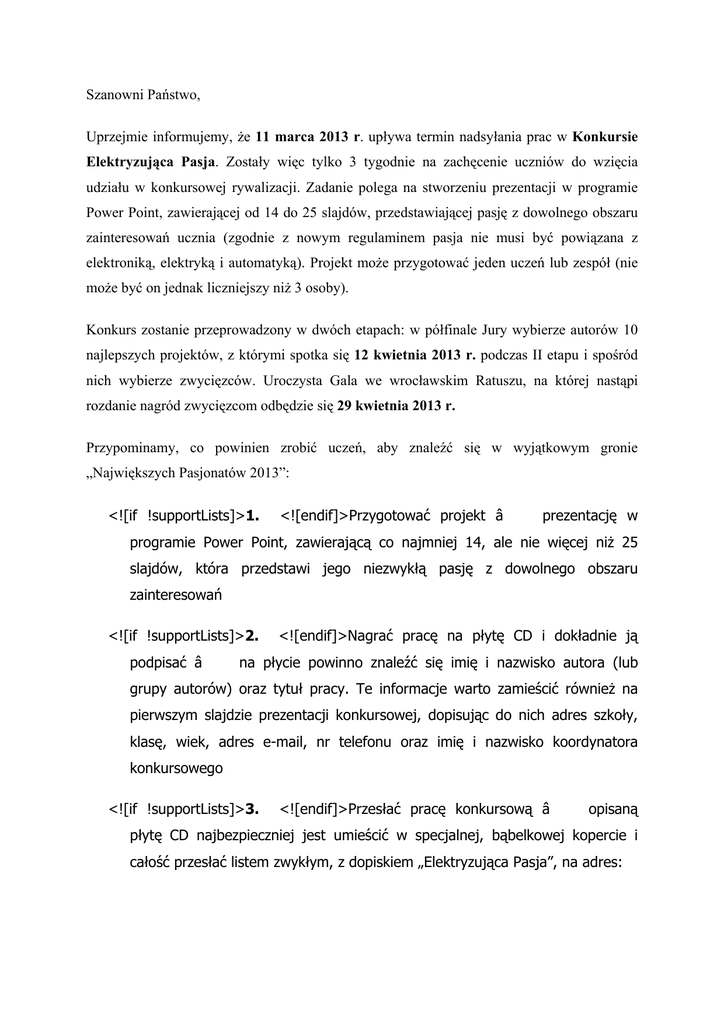 Szanowni Państwo, Uprzejmie informujemy, że 11 marca 2013 r. upływa termin nadsyłania prac w Konkursie Elektryzująca Pasja. Zostały więc tylko 3 tygodnie na zachęcenie uczniów do wzięcia udziału w konkursowej rywalizacji. Zadanie polega na stworzeniu prezentacji w programie Power Point, zawierającej od 14 do 25 slajdów, przedstawiającej pasję z dowolnego obszaru zainteresowań ucznia (zgodnie z nowym regulaminem pasja nie musi być powiązana z elektroniką, elektryką i automatyką). Projekt może przygotować jeden uczeń lub zespół (nie może być on jednak liczniejszy niż 3 osoby). Konkurs zostanie przeprowadzony w dwóch etapach: w półfinale Jury wybierze autorów 10 najlepszych projektów, z którymi spotka się 12 kwietnia 2013 r. podczas II etapu i spośród nich wybierze zwycięzców. Uroczysta Gala we wrocławskim Ratuszu, na której nastąpi rozdanie nagród zwycięzcom odbędzie się 29 kwietnia 2013 r. Przypominamy, co powinien zrobić uczeń, aby znaleźć się w wyjątkowym gronie „Największych Pasjonatów 2013”: <![if !supportLists]>1. <![endif]>Przygotować projekt â prezentację w programie Power Point, zawierającą co najmniej 14, ale nie więcej niż 25 slajdów, która przedstawi jego niezwykłą pasję z dowolnego obszaru zainteresowań <![if !supportLists]>2. podpisać â <![endif]>Nagrać pracę na płytę CD i dokładnie ją na płycie powinno znaleźć się imię i nazwisko autora (lub grupy autorów) oraz tytuł pracy. Te informacje warto zamieścić również na pierwszym slajdzie prezentacji konkursowej, dopisując do nich adres szkoły, klasę, wiek, adres e-mail, nr telefonu oraz imię i nazwisko koordynatora konkursowego <![if !supportLists]>3. <![endif]>Przesłać pracę konkursową â opisaną płytę CD najbezpieczniej jest umieścić w specjalnej, bąbelkowej kopercie i całość przesłać listem zwykłym, z dopiskiem „Elektryzująca Pasja”, na adres: Ego Public Relations ul. Krupnicza 13/307 50-075 Wrocław W razie jakichkolwiek pytań proszę o kontakt. Proszę wstawić wszelkie informacje (łącznie z plakatem) na stronie szkoły. Pozdrawiam serdecznie, Alicja Musialska Account executive Ego Public Relations e-mail: [email protected] tel. 71/790-00-66
