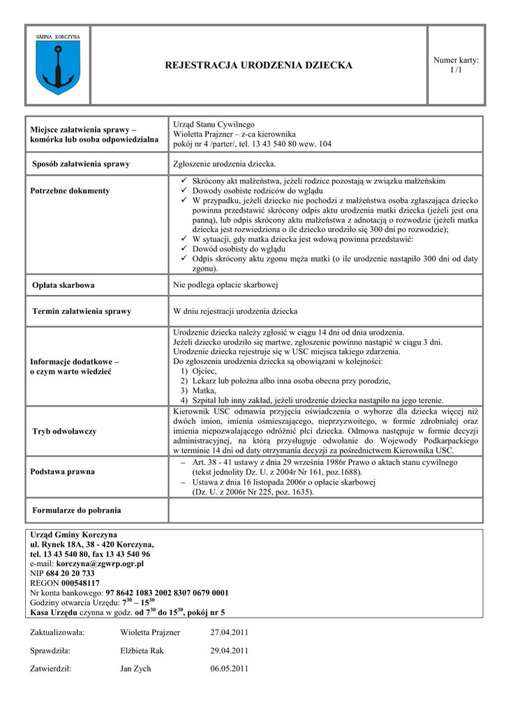 REJESTRACJA URODZENIA DZIECKA Miejsce załatwienia sprawy – komórka lub osoba odpowiedzialna Urząd Stanu Cywilnego Wioletta Prajzner – z-ca kierownika pokój nr 4 /parter/, tel. 13 43 540 80 wew. 104 Sposób załatwienia sprawy Zgłoszenie urodzenia dziecka. Numer karty: I /1 Skrócony akt małżeństwa, jeżeli rodzice pozostają w związku małżeńskim Dowody osobiste rodziców do wglądu W przypadku, jeżeli dziecko nie pochodzi z małżeństwa osoba zgłaszająca dziecko powinna przedstawić skrócony odpis aktu urodzenia matki dziecka (jeżeli jest ona panną), lub odpis skrócony aktu małżeństwa z adnotacją o rozwodzie (jeżeli matka dziecka jest rozwiedziona o ile dziecko urodziło się 300 dni po rozwodzie); W sytuacji, gdy matka dziecka jest wdową powinna przedstawić: Dowód osobisty do wglądu Odpis skrócony aktu zgonu męża matki (o ile urodzenie nastąpiło 300 dni od daty zgonu). Potrzebne dokumenty Opłata skarbowa Nie podlega opłacie skarbowej Termin załatwienia sprawy W dniu rejestracji urodzenia dziecka Urodzenie dziecka należy zgłosić w ciągu 14 dni od dnia urodzenia. Jeżeli dziecko urodziło się martwe, zgłoszenie powinno nastąpić w ciągu 3 dni. Urodzenie dziecka rejestruje się w USC miejsca takiego zdarzenia. Do zgłoszenia urodzenia dziecka są obowiązani w kolejności: 1) Ojciec, 2) Lekarz lub położna albo inna osoba obecna przy porodzie, 3) Matka, 4) Szpital lub inny zakład, jeżeli urodzenie dziecka nastąpiło na jego terenie. Kierownik USC odmawia przyjęcia oświadczenia o wyborze dla dziecka więcej niż dwóch imion, imienia ośmieszającego, nieprzyzwoitego, w formie zdrobniałej oraz imienia niepozwalającego odróżnić płci dziecka. Odmowa następuje w formie decyzji administracyjnej, na którą przysługuje odwołanie do Wojewody Podkarpackiego w terminie 14 dni od daty otrzymania decyzji za pośrednictwem Kierownika USC. Art. 38 - 41 ustawy z dnia 29 września 1986r Prawo o aktach stanu cywilnego (tekst jednolity Dz. U. z 2004r Nr 161, poz.1688). Ustawa z dnia 16 listopada 2006r o opłacie skarbowej (Dz. U. z 2006r Nr 225, poz. 1635). Informacje dodatkowe – o czym warto wiedzieć Tryb odwoławczy Podstawa prawna Formularze do pobrania Urząd Gminy Korczyna ul. Rynek 18A, 38 - 420 Korczyna, tel. 13 43 540 80, fax 13 43 540 96 e-mail: [email protected] NIP 684 20 20 733 REGON 000548117 Nr konta bankowego: 97 8642 1083 2002 8307 0679 0001 Godziny otwarcia Urzędu: 730 – 1530 Kasa Urzędu czynna w godz. od 730 do 1530, pokój nr 5 Zaktualizowała: Wioletta Prajzner 27.04.2011 Sprawdziła: Elżbieta Rak 29.04.2011 Zatwierdził: Jan Zych 06.05.2011