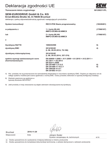 Deklaracja zgodności UE Tłumaczenie tekstu oryginalnego 901290211/PL SEW-EURODRIVE GmbH & Co. KG Ernst-Blickle-Straße 42, D-76646 Bruchsal deklaruje z pełną odpowiedzialnością zgodność następujących produktów System komunikacji REC5 IP5K Basis programowalny (18240461) w połączeniu z 1 × kartą WLAN #MPCI-DCMA-82-MMCX (17966167) lub 2 × kartą WLAN #MPCI-DCMA-82-MMCX (17966167) Dyrektywa R&TTE 1999/05/WE 9) dyrektywą EMC 2014/30/UE (L 96, 29.03.2014, 79-106) 4) dyrektywą niskonapięciową 2014/35/UE (L 96, 29.03.2014, 357-374) spełnia wymogi zastosowanych norm zharmonizowanych: EN 60950-1:2006 + A11:2009 + A1:2010 + A12:2011 + AC:2011 + A2:2013 EN 62311:2008 EN 301489-1 V1.9.2 EN 301489-17 V2.2.1 EN 300328 V1.9.1 EN 301893 V1.8.1 z 6) 6) 4) Ww. produkty nie są przeznaczone do samodzielnej eksploatacji w rozumieniu dyrektywy EMC. Dopiero po włączeniu ich do całego systemu możliwa jest ocena zgodności z normą EMC. Oceny produktu dokonano w typowej konfiguracji instalacji. 6) Wartości graniczne są spełnione w typowej obudowie MOVIPRO®. 9) Jeśli produkty w kraju stosowania są objęte zakresem obowiązywania tej dyrektywy. Bruchsal 2016-11-29 Miejscowość Data Johann Soder Dyrektor zarządzający ds. technicznych a) b) Osoba upoważniona do wystawienia niniejszej deklaracji w imieniu producenta Osoba upoważniona do kompletacji dokumentacji technicznej, o adresie identycznym z adresem producenta a) b)