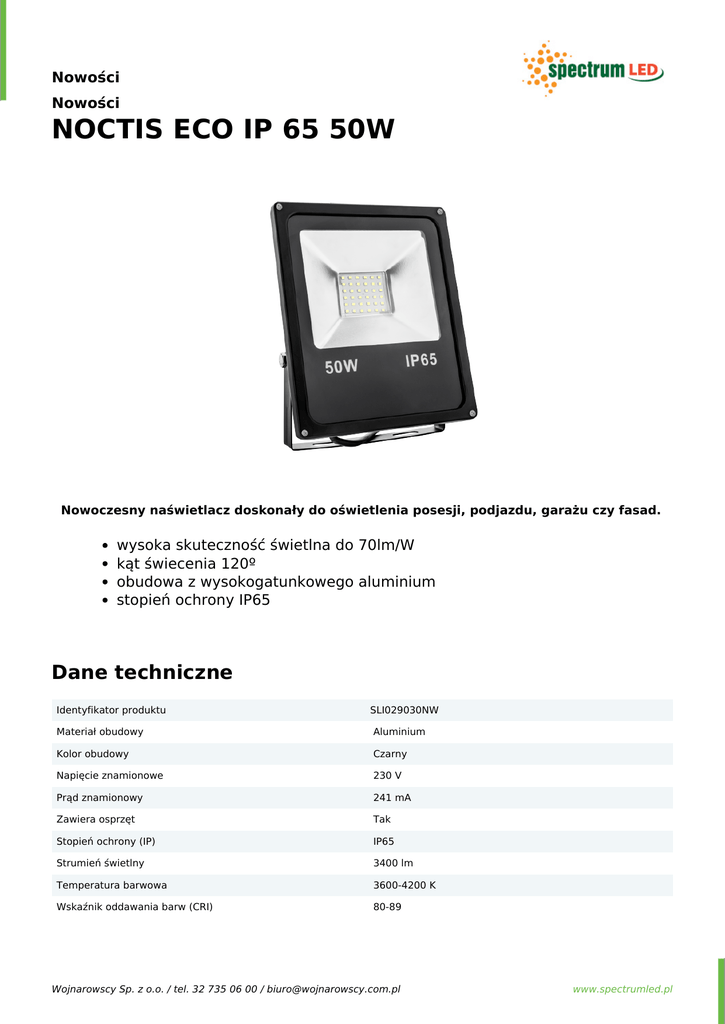 Nowości Nowości NOCTIS ECO IP 65 50W Nowoczesny naświetlacz doskonały do oświetlenia posesji, podjazdu, garażu czy fasad. wysoka skuteczność świetlna do 70lm/W kąt świecenia 120º obudowa z wysokogatunkowego aluminium stopień ochrony IP65 Dane techniczne Identyfikator produktu SLI029030NW Materiał obudowy Aluminium Kolor obudowy Czarny Napięcie znamionowe 230 V Prąd znamionowy 241 mA Zawiera osprzęt Tak Stopień ochrony (IP) IP65 Strumień świetlny 3400 lm Temperatura barwowa 3600-4200 K Wskaźnik oddawania barw (CRI) 80-89 Wojnarowscy Sp. z o.o. / tel. 32 735 06 00 / [email protected] www.spectrumled.pl Nowości Nowości NOCTIS ECO IP 65 50W Pozostałe zdjęcia: Wojnarowscy Sp. z o.o. / tel. 32 735 06 00 / [email protected] Powered by TCPDF (www.tcpdf.org) www.spectrumled.pl